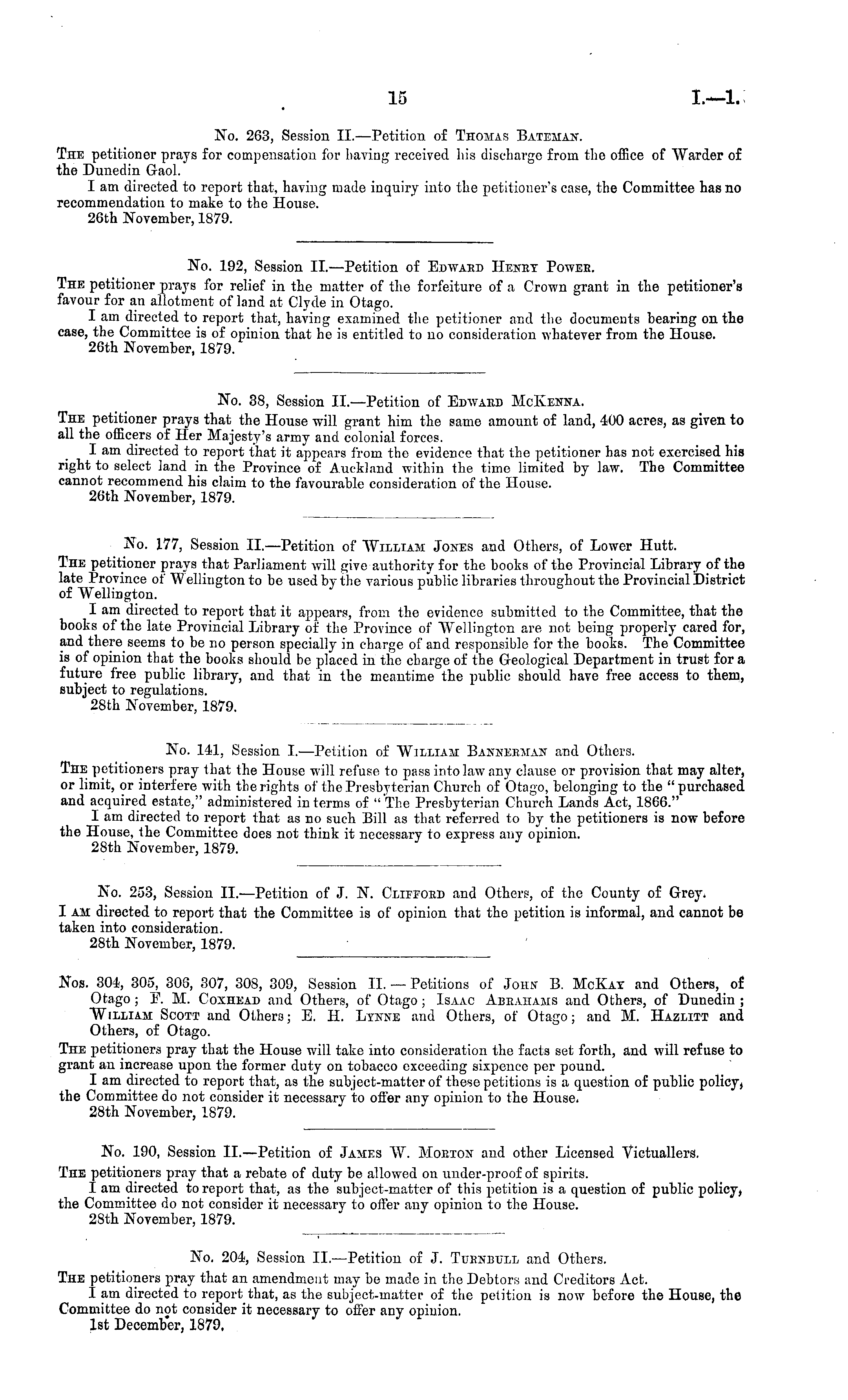 No. 192, Session ll.—Petition of Edward Henry Power. The petitioner prays for relief in the matter of the forfeiture of a Crown grant in the petitioner's favour for an allotment of land at Clyde in Otago. I am directed to report that, having examined the petitioner and the documents bearing ou the case, the Committee is of opinion that he is entitled to no consideration whatever from the House. 26th November, 1879.