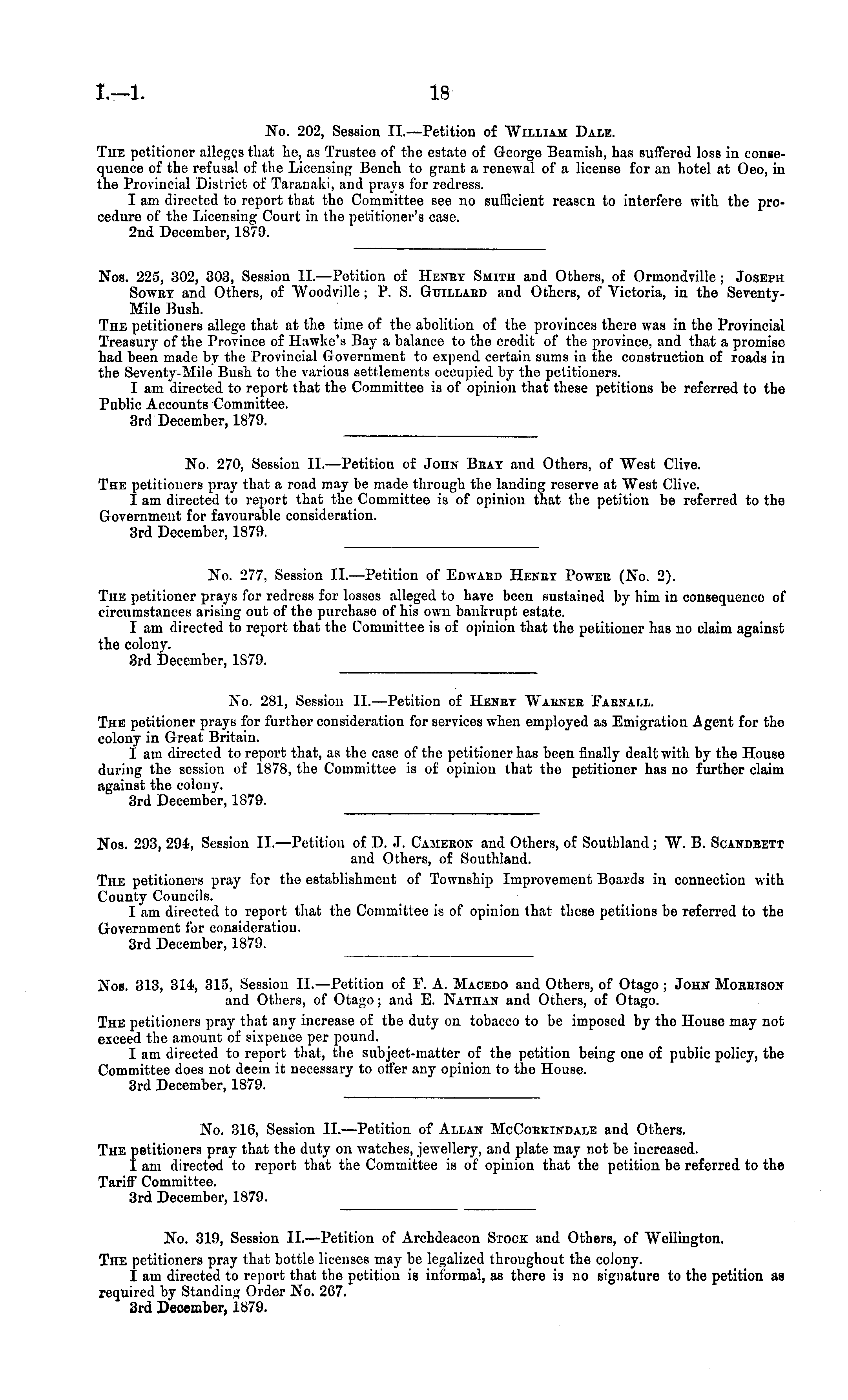 No. 202, Session ll.—Petition of William Dale. The petitioner alleges that he, as Trustee of the estate of George Beamish, has suffered loss in consequence of the refusal of the Licensing Bench to grant a renewal of a license for an hotel at Oeo, in the Provincial District of Taranaki, and prays for redress. I am directed to report that the Committee see no sufficient reascn to interfere with the procedure of the Licensing Court in the petitioner's case. 2nd December, 1879.