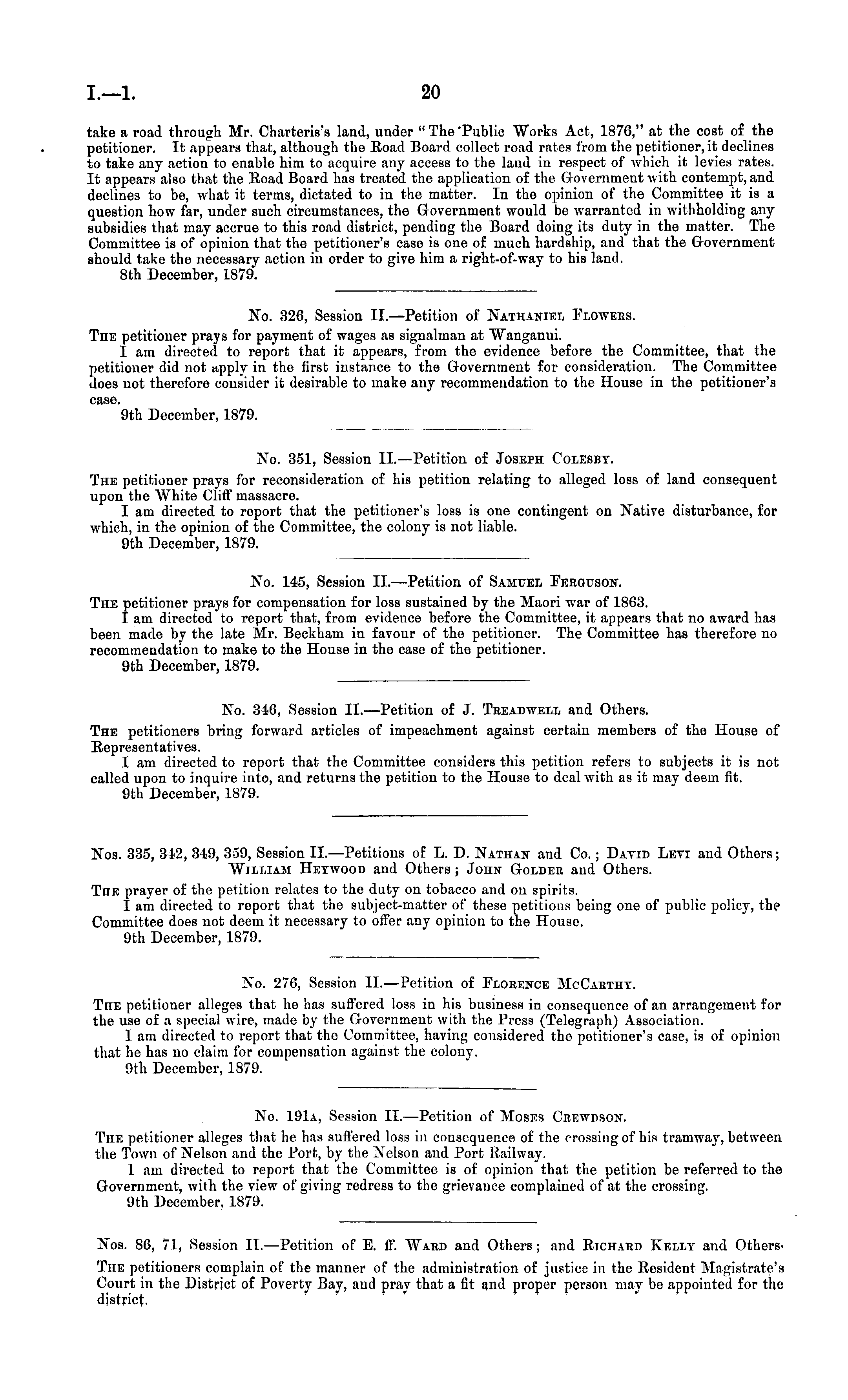 No. 145, Session II. —Petition of Samuel Ferguson. The petitioner prays for compensation for loss sustained by the Maori war of 1863. I am directed to report that, from evidence before the Committee, it appears that no award has been made by the late Mr. Beckham in favour of the petitioner. The Committee has therefore no recommendation to make to the House in the case of the petitioner. 9th December, 1879.