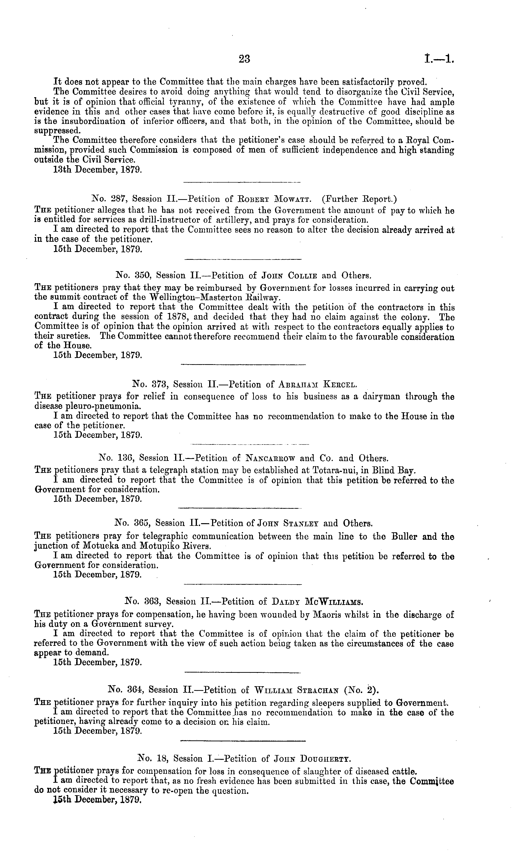 No. 287, Session II. —Petition of Robert Mowatt. (Further Report.) The petitioner alleges that he has not received from the Government the amount of pay to which he is entitled for services as drill-instructor of artillery, and prays for consideration. I am directed to report that the Committee sees no reason to alter the decision already arrived at in the case of the petitioner. 15th December, 1879.