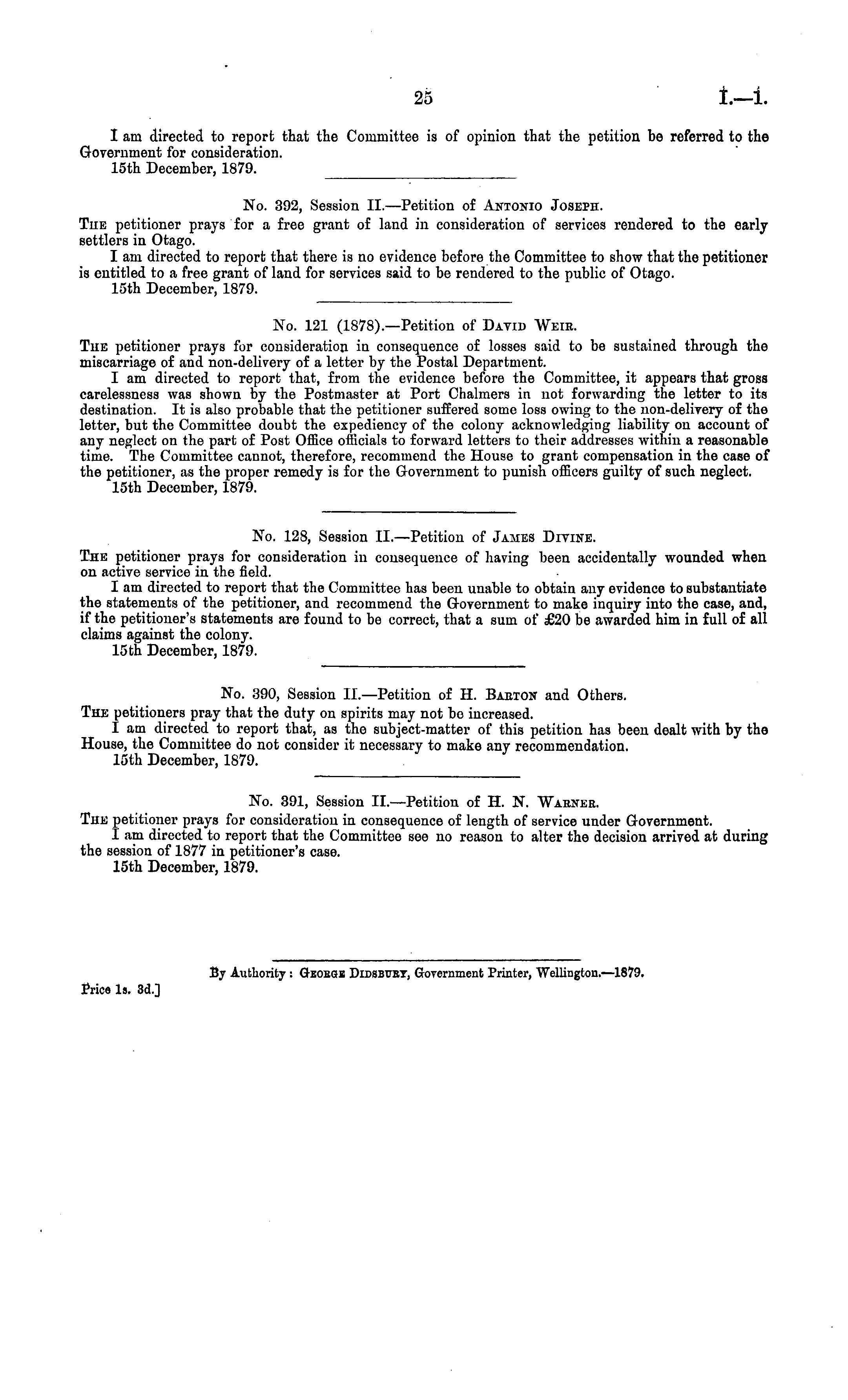 No. 392, Session II.—Petition of Antonio Joseph. The petitioner prays for a free grant of land in consideration of services rendered to the early settlers in Otago. I am directed to report that there is no evidence before the Committee to show that the petitioner is entitled to a free grant of land for services said to be rendered to the public of Otago. 15th December, 1879.