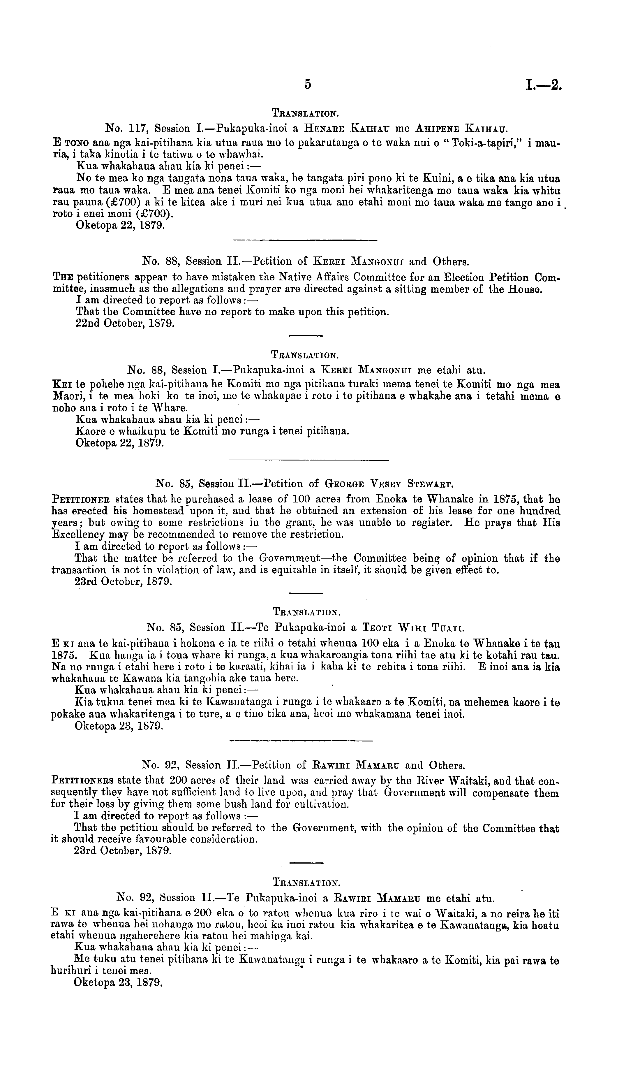 Translation. No. 92, Session II. —Te Pukapuka-inoi a Rawiei Mamaeu me etahi atu. E ki ana nga kai-pitihana c 200 eka o to ratou whenua kua riro i te wai o Waitaki, a no reira he iti rawa to whenua hei nohanga mo ratou, heoi ka inoi ratou kia whakaritea c te Kawanatanga, kia hoatu etahi whenua ngaherehere kia ratou hei mahinga kai. Kua whakahaua ahau kia ki penei:— _ Me tuku atu tenei pitihana kite Kawanatanga i runga ite whakaaro ate Komiti, kia pai rawa to hurihuri i tenei mea. Oketopa 23, 1879.