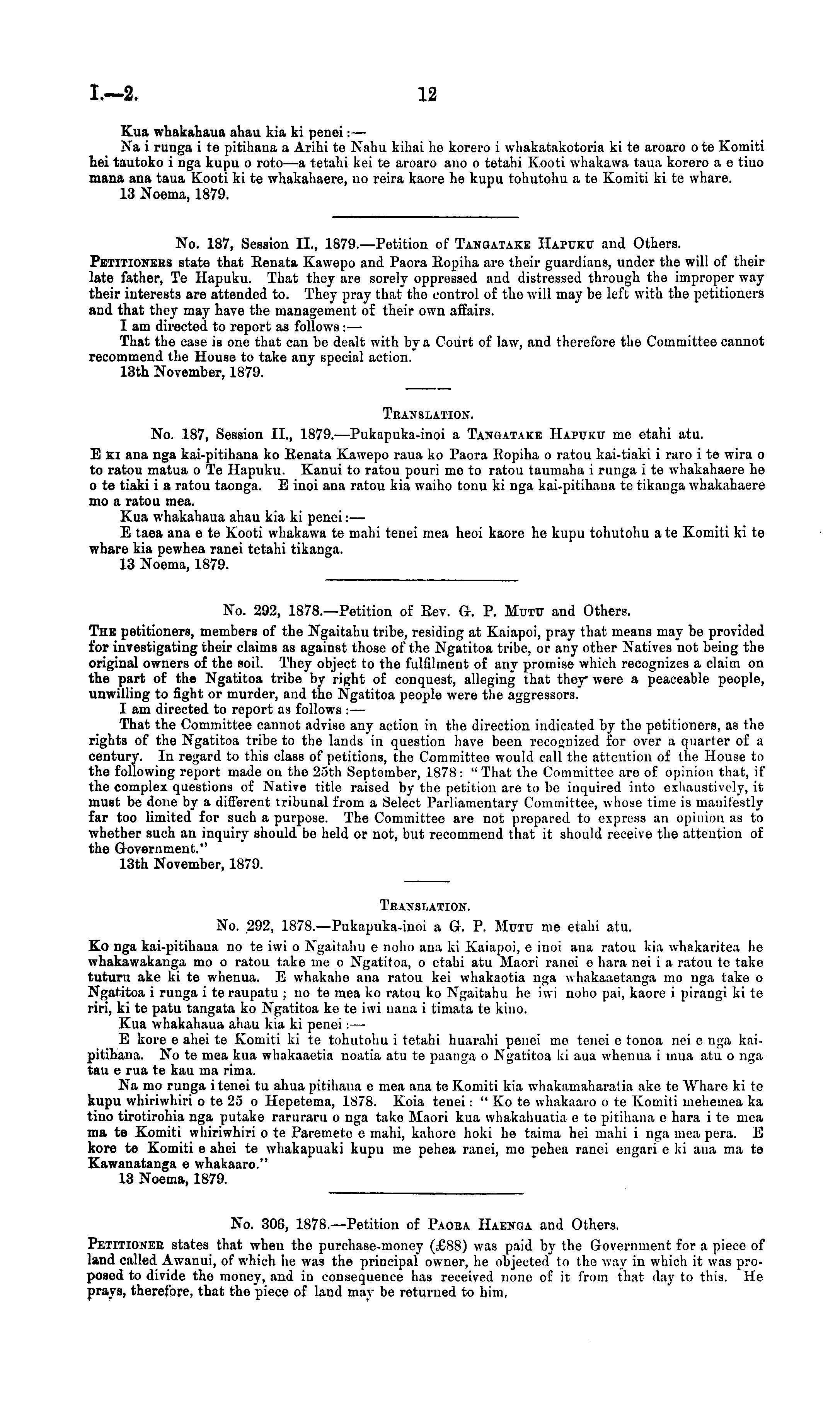 Teanslation. No. .292, 1878.—Pukapuka-inoi a G. P. Mutu me etahi atu. Ko nga kai-pitihana no te iwi o Ngaitahu c noho ana ki Kaiapoi, c inoi ana ratou kia whakaritea he whakawakanga mo o ratou take me o Ngatitoa, o etahi atu Maori ranei c hara nei i a ratou te take tuturu ake kite whenua. E whakahe ana ratou kei whakaotia nga whakaaetanga mo nga take o Ngatitoa i runga i te raupatu ; no te mea ko ratou ko Ngaitahu he iwi noho pai, kaore i pirangi kite riri, kite patu tangata ko Ngatitoa ke te iwi nana i timata te kino. Kua whakahaua ahau kia ki penei:— E kore c ahei te Komiti kite tohutohu i tetahi huarahi penei me tenei c tonoa nei c nga kaipitihana. No te mea kua whakaaetia noatia atu te paanga o Ngatitoa ki aua whenua i mua atu o nga tau c rua te kau ma rima. Na mo runga i tenei tv ahua pitihana c mea ana te Komiti kia whakamaharatia ake te Whare kite kupu whiriwhiri ote 25 o Hepetema, 1878. Koia tenei: "Ko te whakaaro ote Komiti mehemea ka tino tirotirohia nga putake raruraru o nga take Maori kua whakahuatia c te pitihana c hara i te mea ma te Komiti whiriwhiri ote Paremete c main, kahore hoki he taima hei main i nga mea pera. E kore te Komiti c ahei te whakapuaki kupu me pehea ranei, me pehea ranei engari c Id ana ma te Kawanatanga c whakaaro." 13 Noema, 1879.