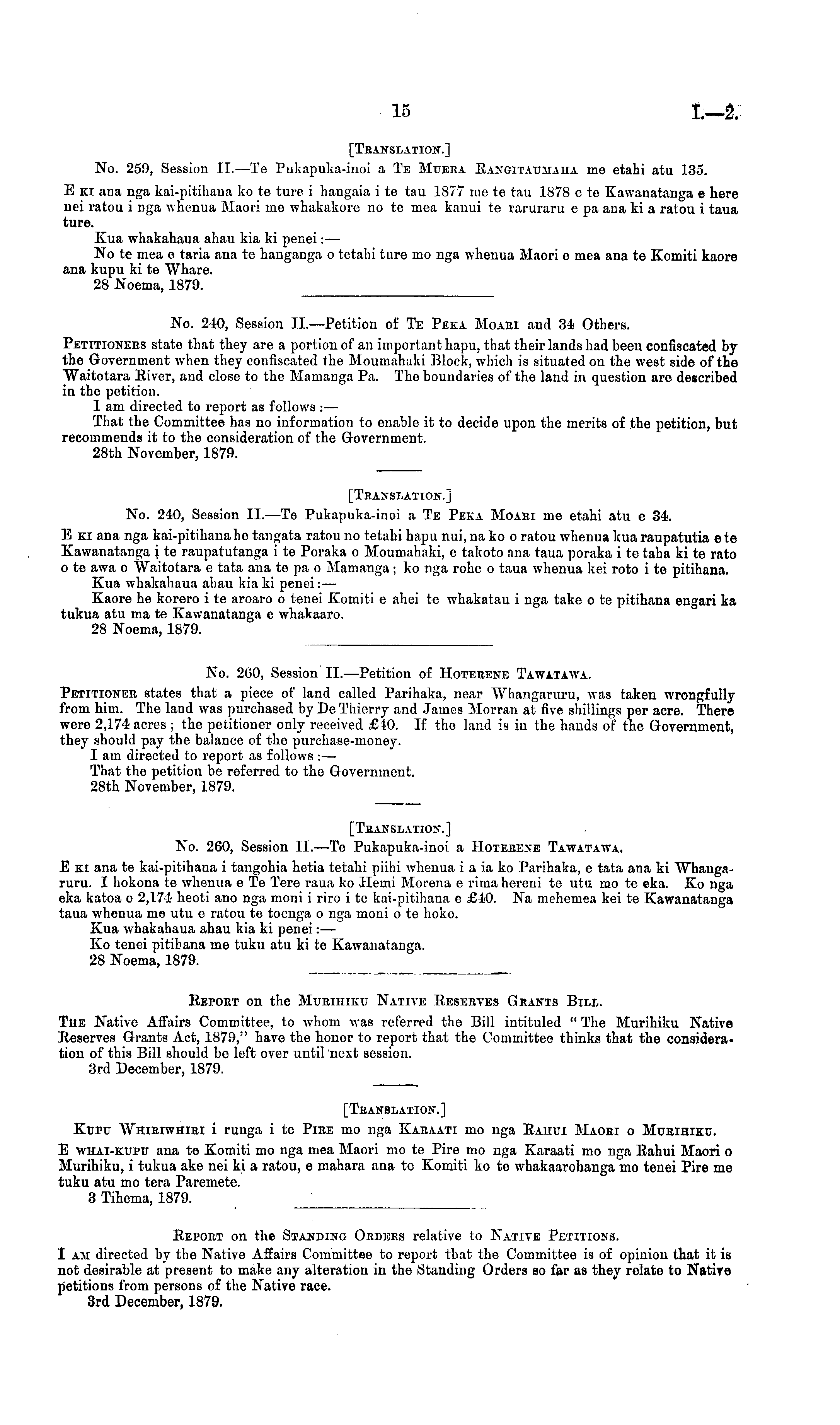 [Translation.] No. 260, Session ll.—Te Pukapuka-inoi a Hoteeene Tawatawa. E ki ana te kai-pitihana i tangohia hetia tetahi piihi whenua i a ia ko Parihaka, c tata ana ki Whangaruru. I hokona te whenua eTe Tere raua ko Hemi Morena c riraa hereui te utu rao te eka. Ko nga eka katoa c 2,174 heoti ano nga moni i riro ite kai-pitihana c £40. Na mehemea kei te Kawanatanga taua whenua me utu o ratou te toenga o nga moni o te hoko. Kua w-hakahaua ahau kia ki penei:— Ko tenei pitihana me tuku atu kite Kawanatanga. 28 Noema, 1879.