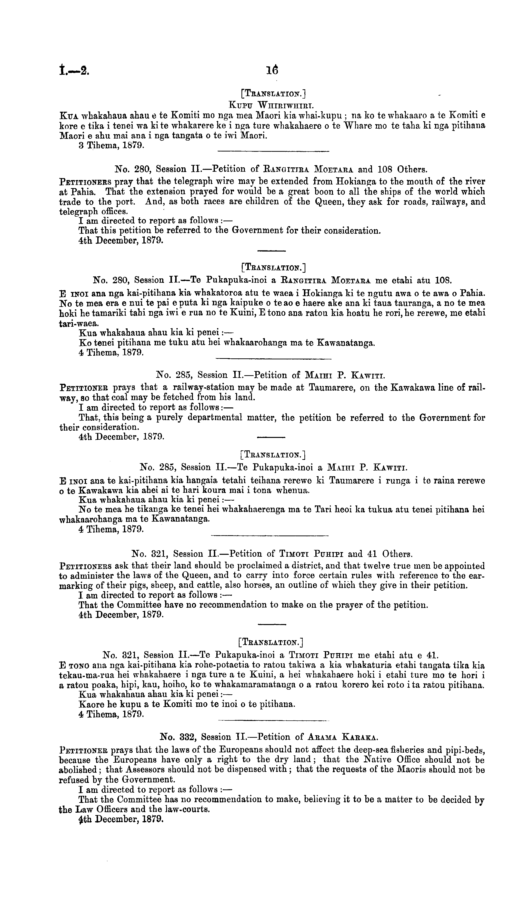 [Teanslation.] No. 280, Session ll.—Te Pukapuka-inoi a Rangitiea Moetaea me etahi atu 108. E inoi ana nga kai-pitihana kia whakatoroa atu te waea i Hokianga kite ngutu awa o te awa o Pahia. No te mea era c nui te pai eputa ki nga kaipuke o teao c haere ake ana ki taua tauranga, a no te mea hoki he tamariki tahi nga iwi c rua no te Kuini, E tono ana ratou kia hoatu he rori, he rerewe, me etahi tari-waea. Kua whakahaua ahau kia ki penei:— Ko tenei pitihana me tuku atu hei whakaarohanga ma te Kawanatanga. 4 Tihema, 1879.