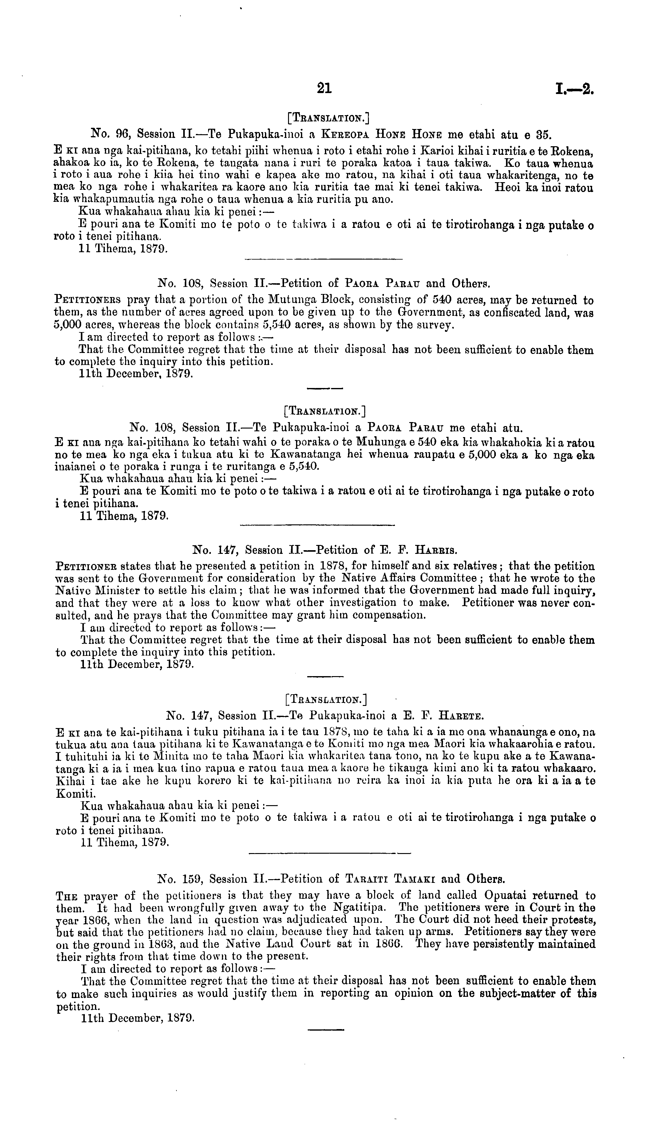 [Translation.] No. 147, Session ll.—Te Pukapuka-inoi a E. F. Haeete. E ki ana te kai-pitihana i tuku pitihana ia i te tau 187S, mo te taha ki a ia mo ona whanaungae ono, na tukua atu ana taua pitihana kite Kawanatanga c te Komiti mo nga mea Maori kia whakaarohia c ratou. I tuhituhi ia ki to Miuita mo to taha Maori kia whakaritea tana tono, na ko te kupu ake a te Kawanatanga ki a ia i mea kua tino rapua c ratou taua mea a kaore he tikauga kimi ano ki ta ratou whakaaro. Kihai i tae ake he kupu korero kite kai-pitihana no reira ka inoi ia kia puta he ora ki a ia a te Komiti. Kua whakahaua ahau kia ki penei:— E pouri ana te Komiti mo te poto o te takiwa i a ratou c oti ai te tirotirohanga i nga putake o roto i tenei pitihana. 11 Tihema, 1879.