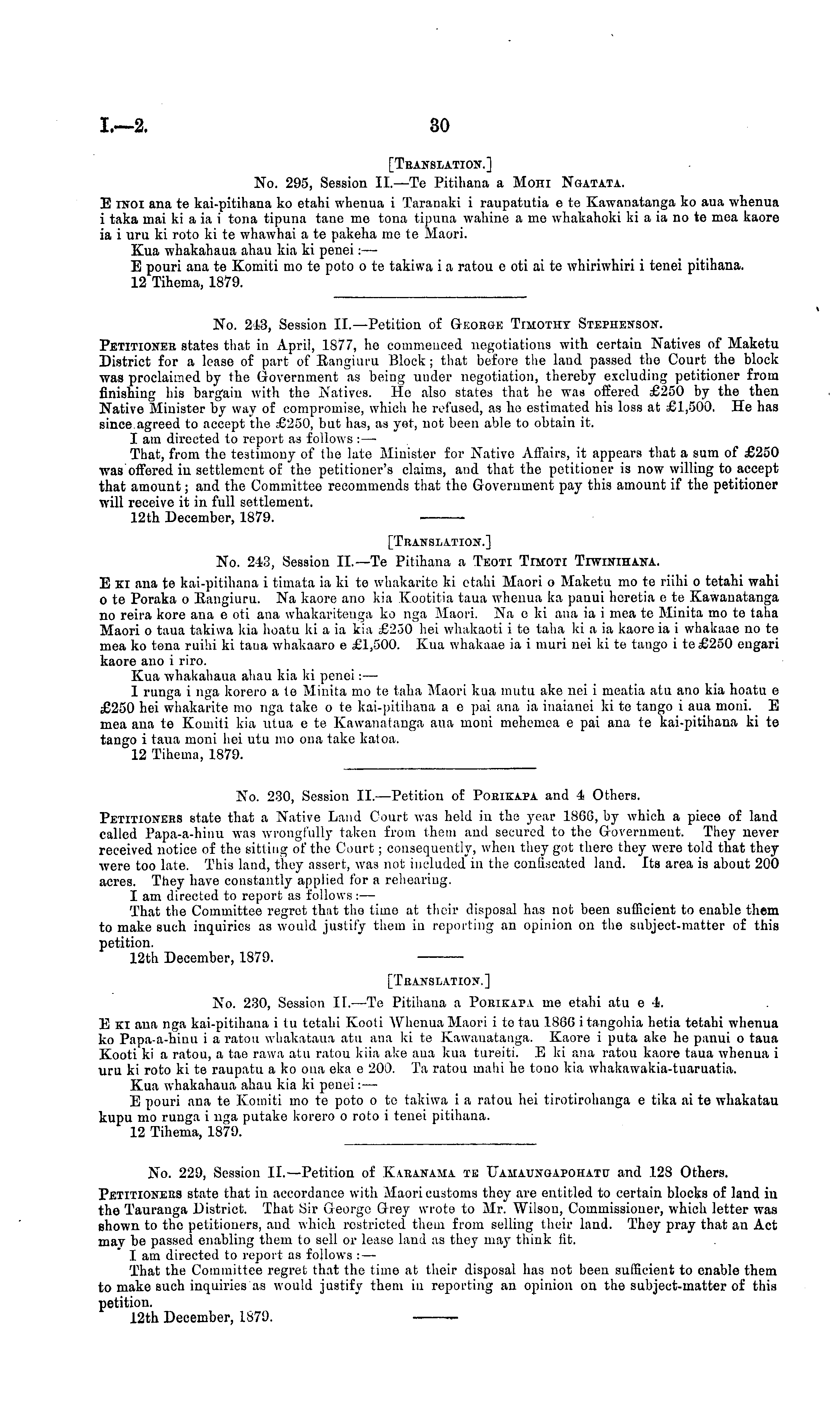 12th December, 1879. [Teanslation.] No. 243, Session ll.—Te Pitihana a Teoti Timoti Tiwinihana. E ki ana te kai-pitihana i timata ia kite whakarite ki etahi Maori o Maketu mo te riihi o tetahi wahi Ote Poraka o Rangiuru. Na kaore ano kia Kootitia taua whenua ka panui horetia etc Kawanatanga no reira kore ana c oti ana whakariteuga ko nga Maori. Na cki ana ia i mea te Minita mo te taha Maori o taua takiwa kia hoatu ki a ia kia £250 hei whakaoti i te taha ki a ia kaore ia i whakaae no te mea ko tona ruihi ki taua whakaaro c £1,500. Kua whakaae ia i muri nei kite tango ite £250 engari kaore ano i riro. Kua whakahaua ahau kia ki penei:— I runga i nga korero a te Minita mo te taha Maori kua mutu ake nei i meatia atu ano kia hoatu o £250 hei whakarite mo nga take ote kai-pitihana a c pai ana ia inaianei kite tango i aua moni. E mea ana te Komiti kia utua c te Kawanatanga aua moni mehemea c pai ana te kai-pitihana kite tango i taua moni hei utu mo ona take katoa. 12 Tihema, 1879.