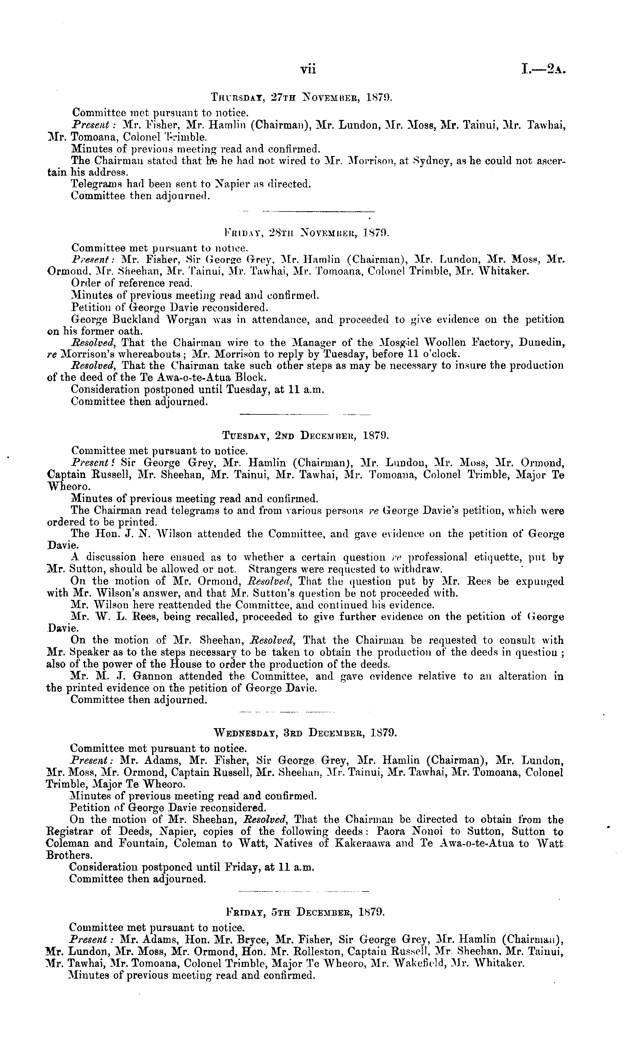 Wednesday, 3rd December, 1879. Committee met pursuant to notice. Present: Mr. Adams, Mr. Fisher, Sir George Grey, Mr. Hamlin (Chairman), Mr. Lundon, Mr. Moss, Mr. Ormond, Captain Russell, Mr. Sheehan. Mr. Tainui, Mr. Tawhai, Mr. Tomoana, Colonel Trimble, Major Te Wheoro. Minutes of previous meeting read and confirmed. Petition of George Davie reconsidered. On the motion of Mr. Sheehan, Resolved, That the Chairman be directed to obtain from the Registrar of Deeds, Napier, copies of the following deeds: Paora Nonoi to Sutton, Sutton to Coleman and Fountain, Coleman to Watt, Natives of Kakeraawa and Te Awa-o-te-Atua to Watt Brothers. Consideration postponed until Friday, at 11 a.m. Committee then adjourned. Friday, sth December, 1879. Committee met pursuant to notice. Present: Mr. Adams, Hon. Mr. Bryce, Mr. Fisher, Sir George Grey, Mr. Hamlin (Chairman), Mr. Lundon, Mr. Moss, Mr. Ormond, Hon. Mr. Rolleston, Captain Russell, Mr. Sheehan. Mr. Taiuui, Mr. Tawhai, Mr. Tomoana, Colonel Trimble, Major Te Wheoro, Mr. Wakefield, Mr. Whitaker. Minutes of previous meeting read and confirmed.