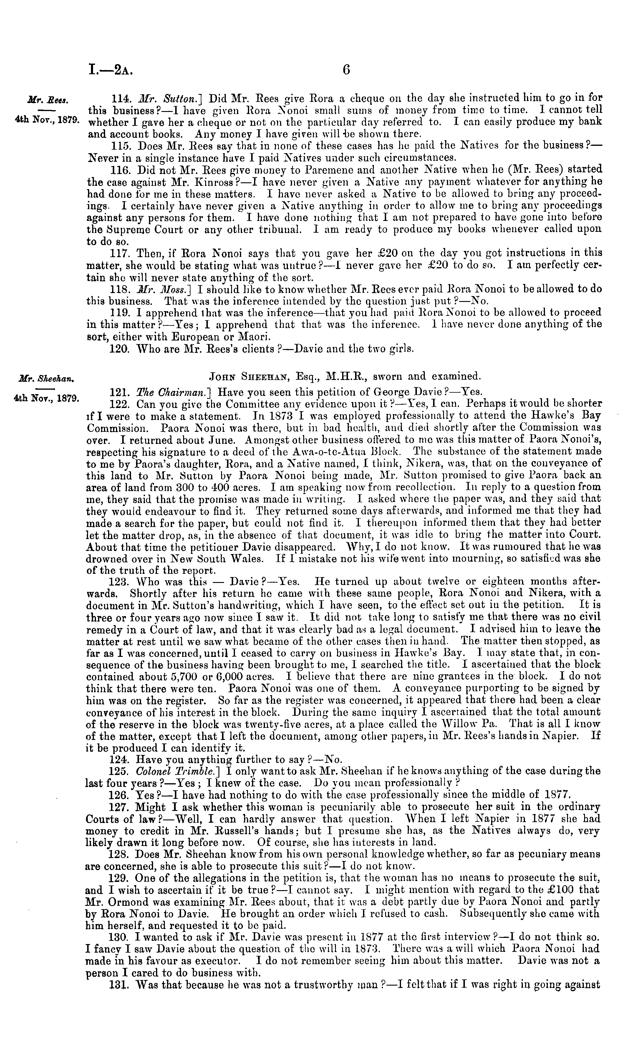 114. Mr. Sutton.] Did Mr. Eees give Eora a cheque on the day she instructed him to go in for this business?—l have given Eora Nonoi small sums of money from time to time. I cannot tell whether I gave her a cheque or not on the particular day referred to. I can easily produce my bank and account books. Any money I have given will-be shown there. 115. Does Mr. Eees say that in none of these cases has he paid the Natives for the business? — Never in a single instance have I paid Natives under such circumstances. 11G. Did not Mr. Eees give money to Paremeno and another Native when he (Mr. Eees) started the case against Mr. Kinross?—l have never given a Native any payment whatever for anything ho had done for me in these matters. I have never asked a Native to be allowed to bring any proceedings. I certainly have never given a Native anything in order to allow me to bring any proceedings against any persons for them. I have done nothing that lam not prepared to have gone into before the Supreme Court or any other tribunal. I am ready to produce my books whenever called upou to do so. 117. Then, if Eora Nonoi says that you gave her £20 on the day you got instructions in this matter, she would be stating what was untrue? —1 never gave her £20 to do so. lam perfectly certain she will never state anything of the sort. 118. Mr. Moss.] I should like to know whether Mr. Eees ever paid Eora Nonoi to he allowed to do this business. That was the inference intended by the question just put ? —No. 119. 1 apprehend that was the inference —that you had paid J.oraXonoi to be allowed to proceed in this matter r —Yes ; 1 apprehend that that was the inference. 1 have never done anything of the sort, either with European or Maori. 120. "Who are Mr. Eees's clients ? —Davie and the two girls. John Siieehast, Esq., M.H.E., sworn and examined. 121. The Chairman.] Have you seen this petition of George Davie? —Yes. 122. Can you give the Committee any evidence upon it ? —Yes, I can. Perhaps it would bo shorter if I were to make a statement. In 1873 I was employed professionally to attend the Hawke's Bay Commission. Paora Nonoi was there, but in bad health, and died shortly after the Commission was over. I returned about June. Amongst other business offered to mo was this matter of Paora Nonoi's, respecting his signature to a deed of the Awa-o-te-Atua Block. The substance of the statement made to me by Paora's daughter, Eora, and a Native named, I think, Nikera, was, that on the conveyance of this laud to Mr. Sutton by Paora Nonoi being made, Mr. Sutton promised to give Paora back an area of land from 300 to -100 acres. lam speaking now from recollection. In reply to a question from me, they said that the promise was made iv writing. I asked where the paper was, and they said that they would endeavour to find it. They returned some days afterwards, and informed me that they had made a search for the paper, but could not find it. I thereupon informed them that they had better let the matter drop, as, in the absence of that document, it was idle to bring the matter into Court. About that time the petitioner Davie disappeared. Why, Ido not know. It was rumoured that he was drowned over in New South Wales. If I mistake not his wife went into mourning, so satisfied was she of the truth of the report. 123. Who was this — Davie? —Yes. He turned up about twelve or eighteen months afterwards. Shortly after his return he came with these same people, Eora Nonoi and Nikera, with a document in Mr. Sutton's handwriting, which I have seen, to the effect set out iv the petition. It is three or four years ago now since I saw it. It did not take long to satisfy me that there was no civil remedy in a Court of law, and that it was clearly bad as a legal document. I advised him to leave the matter at rest until we saw what became of the other cases then in hand. The matter then stopped, as far as I was concerned, until I ceased to carry on business in Hawke's Bay. I may state that, in consequence of the business having been brought to me, 1 searched the title. I ascertained that the block contained about 5,700 or G,OOO acres. I believe that there are nine grantees in the block. Ido not think that there were ten. Paora Nonoi was one of them. A conveyance purporting to bo signed by him was on the register. So far as the register was concerned, it appeared that there had been a clear conveyance of his interest in the block. During the same inquiry I ascertained that the total amount of the reserve in the block was twenty-five acres, at a place called the Willow Pa. That is all I know of the matter, except that I left the document, among other papers, iv Mr. Eees's hands in Napier. If it be produced I can identify it. 124. Have you anything further to say ?—No. 125. Colonel Trimble.] I only want to ask Mr. Sheehan if he knows anything of the case during the last four years ? —Yes ; I knew of the case. Do you moan professionally ? 126. Yes? —I have had nothing to do with the case professionally since the middle of 1577. 127. Might I ask whether this woman is pecuniarily able to prosecute her suit in the ordinary Courts of law? —Well, I can hardly answer that question. When I left Napier in 1577 she had money to credit in Mr. Eussell's hands; but I presume she has, as the Natives always do, very likely drawn it long before now. Of course, she has interests in land. 128. Does Mr. Sheehan know from his own personal knowledge whether, so far as pecuniary means are concerned, she is able to prosecute this suit?—l do uot know. 129. One of the allegations in the petition is, that the woman has no means to prosecute the suit, and I wish to ascertain if it be true ? —1 cannot say. I might mention with regard to the £100 that Mr. Ormond was examining Mr. Eees about, that it was a debt partly due by Paora Nonoi and partly by Eora Nonoi to Davie, lie brought an order which I refused to cash. Subsequently she came with