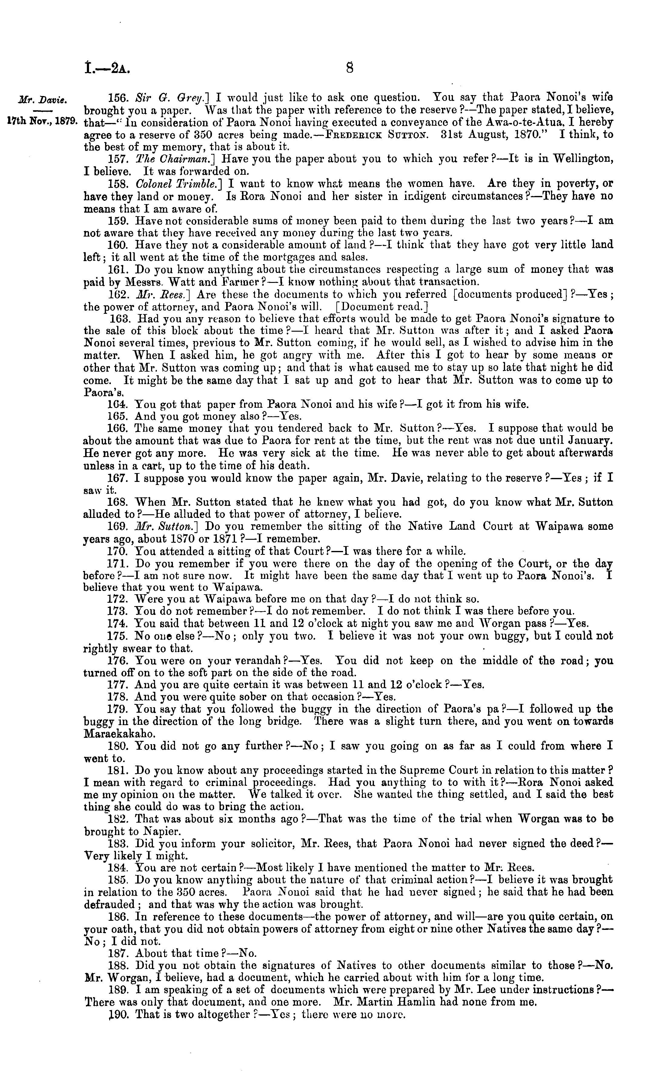 156. Sir G. Grey.] I would just like to ask one question. You say that Paora Nonoi's wife brought you a paper. Was that the paper with reference to the reserve ? —The paper stated, I believe, that —': In consideration of Paora Nonoi having executed a conveyance of the Awa-o-te-Atua, I hereby agree to a reserve of 350 acres being made.—Feedeeick Sutton. 31st August, 1870." I think, to the best of my memory, that is about it. 157. The Chairman.] Have you the paper about you to which you refer ? —lt is in Wellington, I believe. It wras forwarded on. 158. Colonel Trimble.] I want to know what means the women have. Are they in poverty, or have they land or mouey. Is Eora Nonoi and her sister in indigent circumstances? —They have no means that I am aware of. 159. Have not considerable sums of money been paid to them during the last two years? —I am not aware that they have received any money during the last two years. 160. Have they not a considerable amount of land ? —I think that they have got very little land left; it all went at the time of the mortgages and sales. 161. Do you know anything about the circumstances respecting a large sum of money that was paid by Messrs. Watt and Farmer ? —I know nothing about that transaction. 162. Mr. Rees.] Are these the documents to which you referred [documents produced] ?—Yes ; the power of attorney, and Paora Nonoi's will. [Document read.] 163. Had you any reason to believe that efforts would be made to get Paora Nonoi's signature to the sale of this block about the time ? —I heard that Mr. Sutton was after it; and I asked Paora Nonoi several times, previous to Mr. Sutton coming, if he would sell, as I wished to advise him in the matter. When I asked him, he got angry with me. After this I got to hear by some means or other that Mr. Sutton was coming up; and that is what caused me to stay up so late that night he did come. It might be the same day that I sat up and got to hear that Mr. Sutton was to come up to Paora's. 164. You got that paper from Paora Nonoi and his wife ? —I got it from his wife. 165. And you got money also ? —Yes. 166. The same money that you tendered back to Mr. Sutton ? —Yes. I suppose that would be about the amount that was due to Paora for rent at the time, but the rent was not due until January. He never got any more. He was very sick at the time. He w*as never able to get about afterwards unless in a cart, up to the time of his death. 167. I suppose you would know the paper again, Mr. Davie, relating to the reserve ?—Yes ; if I saw it. 16S. AVhen Mr. Sutton stated that he knew what you had got, do you know what Mr. Sutton alluded to ? —He alluded to that power of attorney, I believe. 169. Mr. Sutton.] Do you remember the sitting of the Native Land Court at Waipawa some years ago, about 1870 or 1871 ?—I remember. 170. You attended a sitting of that Court?—l was there for a while. 171. Do you remember if you were there on the day of the opening of the Court, or tho day before ? —I am not sure now. It might have been the same day that I went up to Paora Nonoi's. I believe that you went to Waipawa. 172. Were you at Waipawa before me on that day ? —I do not think so. 173. You do not remember? —I do uot remember. Ido not think I was there before you. 174. You said that between 11 and 12 o'clock at night you saw me and Worgan pass ? —Yes. 175. No one else ?—No ; only you two. I believe it was not your own buggy, but I could not rightly swear to that. 176. You were on your verandah ?—Yes. You did not keep on the middle of the road; you turned off on to the soft part on the side of the road. 177. And you are quite certain it was between 11 and 12 o'clock ?—Yes. 178. And you were quite sober on that occasion ?—Yes. 179. You say that you followed the buggy in the direction of Paora's pa ?—I followed up the buggy in the direction of tho long bridge. There was a slight turn there, and you went on towards Maraekakaho. 180. You did not go any further ? —No; I saw you going on as far as I could from where I went to. 181. Do you know about any proceedings started in the Supreme Court in relation to this matter ? I mean with regard to criminal proceedings. Had you anything to to with it? —Eora Nonoi asked me my opinion on the matter. We talked it over. She wanted the thing settled, aud I said the best thins she could do was to bring the action. 182. That was about six months ago ? —That was the time of the trial when Worgan was to be brought to Napier. 183. Did you inform your solicitor, Mr. Eees, that Paora Nonoi had never signed the deed ?— Very likely I might. 184. You are not certain ? —Most likely I have mentioned the matter to Mr: Eees. 185. Do you know anything about the nature of that criminal action?—l believe it was brought in relation to the 350 acres. Paora Nonoi said that he had never signed ;he said that he had been defrauded ; and that was why the action was brought. 186. In reference to these documents —the power of attorney, and will —are you quite certain, on your oath, that you did not obtain powers of attorney from eight or nine other Natives the same day ? — No ; I did not. 187. Ahout that time ?—No. 188. Did you not obtain the signatures of Natives to other documents similar to those ? —No. Mr. Worgan, I believe, had a document, which he carried about with him for a long time. 189. I am speaking of a set of documents which were prepared by Mr. Lee under instructions ? — There was only that document, and one more. Mr. Martin Hamlin had none from me. 190. That is two altogether r —Yes ; there were no more.