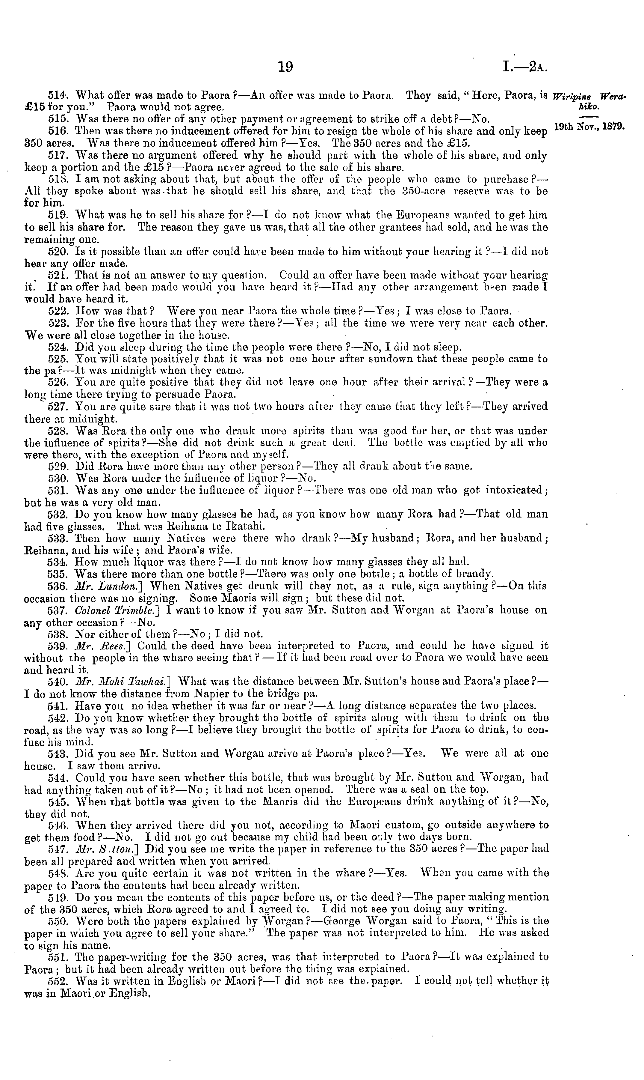 514. What offer was made to Paora ?—An offer was made to Paora. They said, " Here, Paora, is £15 for you." Paora would not agree. 515. Was there no offer of any other payment or agreement to strike off a debt? —No. 516. Then was there no inducement offered for him to resign the whole of his share and only keep 350 acres. Was there no inducement offered him ? —Yes. The 350 acres and the £15. 517. Was there no argument offered why he should part with the whole of his share, aud only keep a portion and the £15 ? —Paora never agreed to the sale of his share. 513. I am not asking about that, but about the offer of tho people who came to purchase?—■ All they spoke about was that he should sell his share, and that the 350-acre reserve was to be for him. 519. What was he to sell his share for ?—I do not know what the Europeans wanted to get him to sell his share for. The reason they gave us was, that all the other grantees had sold, and he was the remaining one. 520. Is it possible than an offer could have been made to him without your hearing it ? —I did not hear any offer made. 521. That is not an answer to my question. Could an offer have been made without your hearing it. If an offer had been made would you have heard it ? —Had any other arrangement been made I would have heard it. 522. How was that ? Were you near Paora the whole time ? —Tes ; I was close to Paora. 523. For the live hours that they were there? —Yes; all the time we were very near each other. We were all close together in the house. 524. Did you sleep during the time the people were there ? —No, I did not sleep. 525. You will state positively that it was not one hour after sundown that these people came to the pa?—lt was midnight when they came. 526. You are quite positive that they did not leave one hour after their arrival?— They were a long time there trying to persuade Paora. 527. You are quite sure that it was not two hours after they came that they left ? —They arrived there at midnight. 528. Was Eora the only one who drank more spirits than was good for her, or that was under the influence of spirits? —She did not drink such a great deal. The bottle was emptied by all who were there, with the exception of Paora and myself. 529. Did Eora have more than any other person?— They all drank about the same. 530. Was Eora under the iniiuenco of liquor ? —No. 531. AVas any one under the influence of liquor ?—There was one old man who got intoxicated ; but he was a very old man. 532. Do you know how many glasses he had, as you know how many Eora had ?—That old man had live glasses. That was Eeihana te Ikatahi. 533. Then how many Natives were there who drank? —My husband; Eora, and her husband; Eeihana, and his wife ; and Paora's wife. 534. How much liquor was there ? —I do not know how* many glasses they all had. 535. Was there more than one bottle? —There was only one bottle; a bottle of brandy. 536. Mr. Lundon.] When Natives get drunk will they not, as a rule, sign, anything ?—On this occasion there was no signing. Some Maoris will sign ; but these did not. 537. Colonel Trimble.] 1 want to know if you saw Mr. Sutton and Worgan at Paora's house on any other occasion ? —No. 538. Nor either of them? —No ; I did not. 539. Mr. Rees.] Could the deed have beeu interpreted to Paora, and could he have signed it without the people in the whare seeing that ? —If it had been read over to Paora we would have seen and heard it. 540. Mr. Mohi Tawhai.] What was the distance between Mr. Sutton's house and Paora's place ? — I do not know the distance from Napier to the bridge pa. 541. Have you no idea whether it was far or near ? —A long distance separates the two places. 542. Do you know whether they brought the bottle of spirits along with them to drink on the road, as the way was so long ? —I believe they brought the bottle of spirits for Paora to drink, to confuse his mind. 513. Did you see Mr. Sutton and Worgan arrive at Paora's place? —Yes. We were all at one house. I saw them arrive. 541. Could you have seen whether this bottle, that was brought by Mr. Sutton and Worgan, had had anything taken out of it? —No ; it had not been opened. There was a seal on the top. 545. When that bottle was given to the Maoris did the Europeans drink anything of it? —No, they did not. " 546. When they arrived there did you not, according to Maori custom, go outside anywhere to get them food?— No. I did not go out because my child had beeu only tsvo days born. 517. Mr. S Hon.] Did you see me write, the paper m reference to the 350 acres ? —The paper had been all prepared aud written when you arrived. 548. Are you quite certain it was not written in the whare ? —Yes. When you came with the paper to Paora the conteuts had been already written. 519. Do you mean the contents of this paper before us, or the deed? —Tho paper making mention of the 350 acres, which Eora agreed to and 1 agreed to. I did not see you doing any writing. 550. Were both the papers explained by Worgan?—George Worgan said to Paora, "This is the paper in which you agree to sell your share." The paper waa not interpreted to him. He was asked to sign his name. 551. The paper-writing for tho 350 acres, was that interpreted to Paora?—lt was explained to Paora; but it had been already written out before the thing was explained. 552. Was it written in English or Maori? —I did not see the.paper. I could not tell whether it was in Maori .or English.
