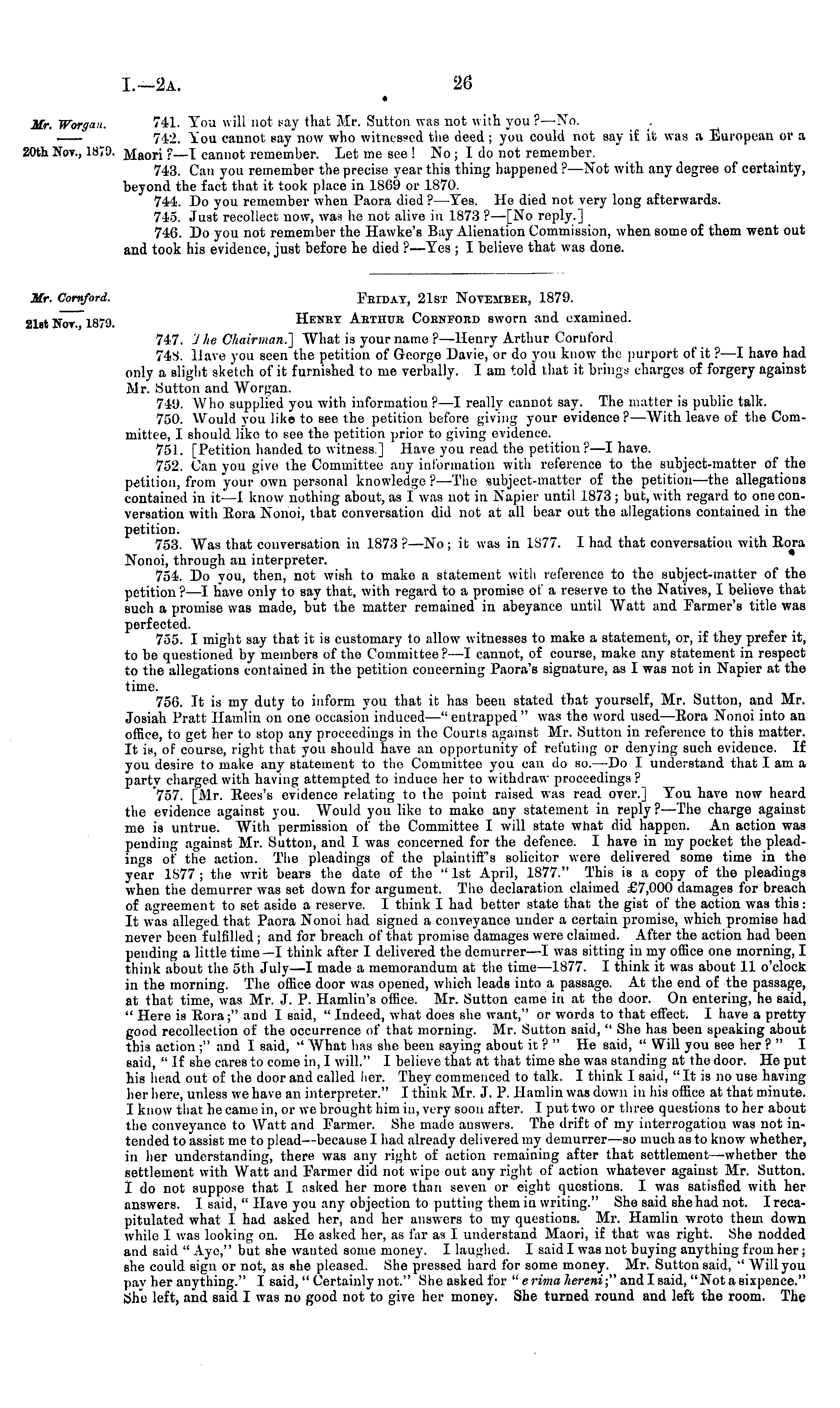 Friday, 21st November, 1879. Henry Aethuk Cornford sworn and examined. 747. 2 he Chairman.] What is your name ? —Henry Arthur Cornford 745. Have you seen the petition of George Davie, or do you know the purport of it? —I have had only a slight ske'teh of it furnished to me verbally. lam told that it brings charges of forgery against Air. Sutton and Worgan. 749. Who supplied you with information ? —I really cannot say. The matter is public talk. 750. Would you like to see the petition before giving your evidence ? —With leave of the Committee, I should like to see the petition prior to giving evidence. 751. [Petition handed to witness] Have you read the petition?—l have. 752. Can you give the Committee any information with reference to the subject-matter of the petition, from your own personal knowledge ?—Tho subject-matter of the petition —the allegations contained in it —I know nothing about, as I was not in Napier until 1873 ; but, with regard to one conversation with Eora Nonoi, that conversation did not at all bear out the allegations contained in the petition. 753. Was that conversation in 1873 ? —No; it was in 1577. I had that conversation with Eora Nonoi, through an interpreter. 754. Do you, then, not wish to make a statement with reference to the subject-matter of the petition? —I have only to say that, with regard to a promise of a reserve to the Natives, I believe that such a promise was made, but the matter remained in abeyance until Watt and Farmer's title was perfected. 755. I might say that it is customary to allow witnesses to make a statement, or, if they prefer it, to be questioned by members of the Committee? —I cannot, of course, make any statement in respect to the allegations contained in the petition concerning Paora's signature, as I was not in Napier at the time. 75G. It is my duty to inform you that it has beeu stated that yourself, Mr. Sutton, and Mr. Josiah Pratt Hamlin on one occasion induced —" entrapped " was the word used —Eora Nonoi into an office, to get her to stop any proceedings in the Courts against Mr. Sutton in reference to this matter. It is, of course, right that you should have an opportunity of refuting or denying such evidence. If you desire to make any statement to the Committee you can do so. —Do I understand that I am a party charged with having attempted to induce her to withdraw proceedings ? 757. [Mr. Eees's evidence relating to the point raised was read over.] Tou have now heard the evidence against you. Would you like to make any statement in reply ? —The charge against me is untrue. Withpermission of the Committee I will state what did happen. An action was pending against Mr. Sutton, and I was concerned for the defence. I have in my pocket the pleadings of the action. The pleadings of the plaintiff's solicitor were delivered some time in the year 1577 ; the writ bears the date of the " Ist April, 1877." This is a copy of tho pleadings when the demurrer was set down for argument. Tho declaration claimed £7,000 damages for breach of agreement to set aside a reserve. I think I had better state that; the gist of the action was this: It was alleged that Paora Nonoi had signed a conveyance under a certain promise, which promise had never been fulfilled ; and for breach of that promise damages were claimed. After the action had been pending a little time—l think after I delivered the demurrer —I was sitting in my office one morning, I think about the sth July—l made a memorandum at the time —1877. I think it was about 11 o'clock in the morning. The office door was opened, which leads into a passage. At the end of the passage, at that time, was Mr. J. P. Hamlin's office. Air. Sutton came in at the door. On entering, he said, " Here is Eora;" and 1 said, " Indeed, what does she want," or words to that effect. I have a pretty good recollection of the occurrence of that morning. Mr. Sutton said, " She has beeu speaking about this action ;" and I said, " What lias she been saying about it ? " He said, " Will you see her ? " I said, "If she cares to come in, I will." I believe that at that time she was standing at the door. He put his head out of the door and called her. They commenced to talk. I think I said, "Itis no use having her here, unless we have an interpreter." I think Mr. J. P. Hamlin was down in his office at that minute. 1 know that he came in, or we brought him in, very soon after. I put two or three questions to her about the conveyance to Watt and Parmer. She made answers. The drift of my interrogation was not intended to assist me to plead —because I had already delivered my demurrer—so much as to know whether, in her understanding, there was any right of action remaining after that settlement —whether the settlement with Watt and Parmer did not wipe out any right of action whatever against Mr. Sutton. I do not suppose that I asked her more than seven or eight questions. I was satisfied with her answers. I said, " Have you any objection to putting them in writing." She said she had not. I recapitulated what I had asked her, and her answers to my questions. Mr. Hamlin wrote them down while I was looking on. He asked her, as far as I understand Maori, if that was right. She nodded and said " Aye," but she wanted some money. I laughed. I said I was not buyiug anything from her; she could sign or not, as she pleased. She pressed hard for some money. Air. Sutton said, " Will you pay her anything." I said, " Certainly not." She asked for " c rima hereni;" and I said, "Not a sixpence." She left, and said I was no good not to give her money. She turned round and left the room. The