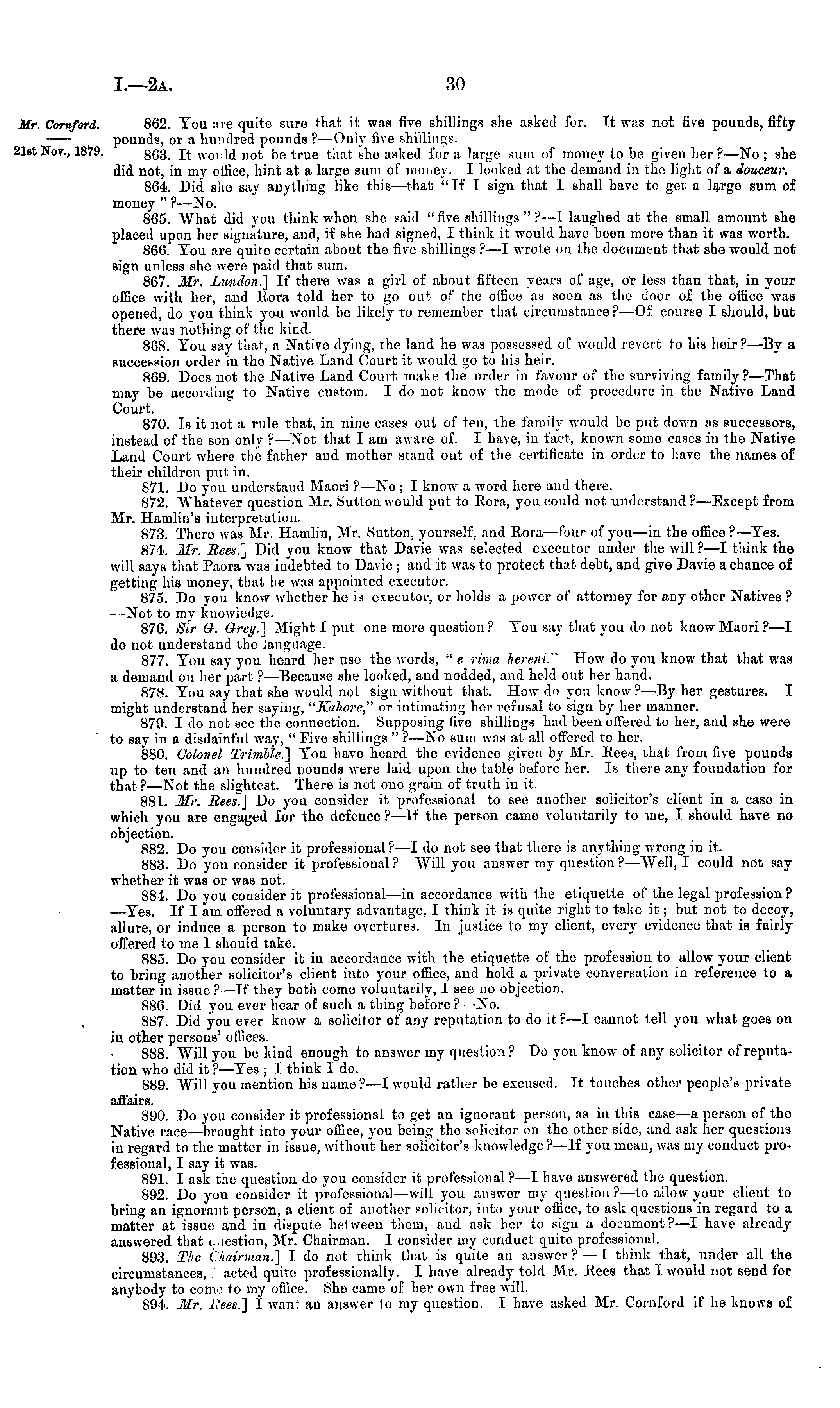 862. You are quite sure that it was five shillings she asked for. Tt was not five pounds, fifty pounds, or a hundred pounds ?—Only five shillings. 563. It wol Id not be true that she asked for a large sum of money to be given her ? —No ; she did not, in my cilice, hint at a large sum of money. I looked at the demand in the light of a douceur. 864. Did Blie say anything like this —that " If I sign that I shall have to get a largo sum of money " ?—No. 865. What did you think when she said "five shillings"?—l laughed at the small amount she placed upon her signature, and, if she had signed, I think it would have been more than it was worth. 866. Tou are quite certain about the five shillings ? —I wrote on tho document that she would not sign unless she were paid that sum. 867. Mr. Lundon.] If there was a girl of about fifteen years of age, or less than that, in your office with her, and Eora told her to go out of the office as soon as the door of the office was opened, do you think you would be likely to remember that circumstance? —Of course I should, but there was nothing of the kind. 868. You say that, a Native dying, the land he was possessed of would revert to his heir?—By a succession order in the Native Land Court it would go to his heir. 869. Does not the Native Land Court make the order in favour of tho surviving family?— That may be according to Native custom. I do not know the mode of procedure in tiie Native Land Court. 870. Is it not a rule that, in nine eases out of ten, the family would be put down as successors, instead of the son only ? —Not that lam aware of. I have, in fact, known some cases in tho Native Land Court where the father and mother stand out of the certificate in order to have the names of their children put in. S7l. Do you understand Maori ?—No ; I know a word here and there. 872. Whatever question Mr. Sutton would put to Eora, you could not understand ?—Except from Mr. Hamlin's interpretation. 873. There was Mr. Hamlin, Mr. Sutton, yourself, and Eora —four of you —in the office ?—Yes. 874. Mr. Rees.] Did you know that Davie was selected executor under the will? —I think the will says that Paora was indebted to Davie ; aud it was to protect that debt, and give Davie a chance of getting his money, that he was appointed executor. 875. Do you know whether he is executor, or holds a power of attorney for any other Natives ? —Not to my knowledge. 876. Sir G. Grey.] Might I put one more question? Tou say that you do not know Maori ? —I do not understand the language. 577. You say you heard her use the words, " c rima hereniY How do you know that that was a demand on her part ? —Because she looked, aud nodded, and held out her hand. 878. Tou say that she would not sign witiiout that. How do you know ? —By her gestures. I might understand her saying, "Kahore," or intimating her refusal to sigu by her manner. 879. Ido not see the connection. Supposing five shillings had been offered to her, and she were to say in a disdainful way, " Five shillings " ?—No sum was at all offered to her. 880. Colonel Trimble.] Tou have heard the evidence given by Mr. Eees, that from five pounds up to ten and an hundred pounds were laid upon the table before her. Is there any foundation for that ?—Not the slightest. There is not one grain of truth in it. 881. Mr. Rees.] Do you consider it professional to see another solicitor's client in a case in which you are engaged for the defence? —If the person came voluntarily to me, I should have no objection. 882. Do you consider it professional ?—I do not see that there is anything wrong in it. 883. Do you consider it professional ? Will you answer my question ? —Well, I could ndt say whether it was or was not. 884. Do you consider it professional —in accordance with the etiquette of the legal profession? —Tes. If lam offered a voluntary advantage, I think it is quite right to take it; but not to decoy, allure, or induce a person to make overtures. In justice to my client, every evidence that is fairly offered to me 1 should take. 885. Do you consider it in accordance with the etiquette of the profession to allow your client to bring another solicitor's client into your office, and hold a private conversation in reference to a matter in issue ? —lf they both come voluntarily, I see no objection. 886. Did you ever hear of such a thing before ? —No. 887. Did you ever know a solicitor of any reputation to do it ? —I cannot tell you what goes on in other persons' offices. 88S. Will you be kind enough to answer my question? Do you know of any solicitor of reputation who did it ? —Tes ; I think 1 do. 889. Will you mention his name? —I would rather be excused. It touches other people's private affairs. 890. Do you consider it professional to get an ignorant person, as iv this case —a person of the Native race —brought into your office, you being the solicitor on the other side, and ask her questions in regard to the matter in issue, without her solicitor's knowledge ?—lf you mean, was my conduct professional, I say it was. 891. I ask the question do you consider it professional ? —I. have answered tho question. 892. Do you consider it professional —will you answer my question? —to allow your client to bring an ignorant person, a client of another solicitor, into your office, to ask questions in regard to a matter at issue and in dispute between them, and ask her to sign a document? —I have already answered that question, Mr. Chairman. I consider my conduct quite professional. 893. The Chairman.] I do not think that is quite an answer? — I think that, under all the circumstances, ] acted quite professionally. I have already told Mr. Eees that I would not send for anybody to com.' to my office. She came of her own free will. 894. Mr. j.'f.s.] I w;mi an answer to my question. I have asked Mr. Cornford if he knows of