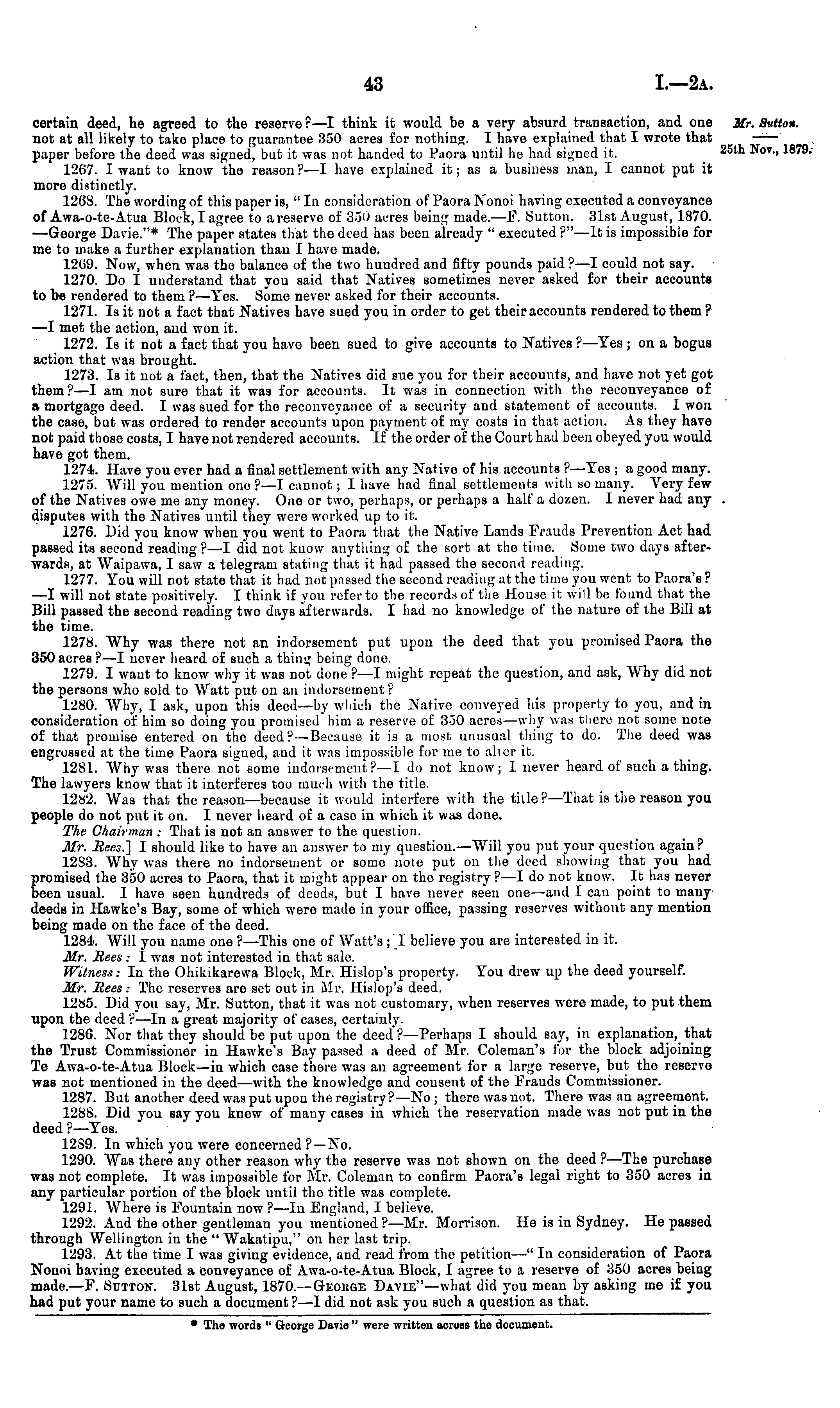 certain deed, he agreed to the reserve? —I think it would be a very absurd transaction, and one not at all likely to take place to guarantee 350 acres for nothing. I have explained that I wrote that paper before the deed was signed, but it was not handed to Paora until he had signed it. 1267. I want to know the reason? —I have explained it; as a business man, I cannot put it more distinctly. 1268. The wording of this paper is, "In consideration of Paora Nonoi having executed a conveyance of Awa-o-te-Atua Block, I agree to a reserve of 350 acres being made.—F. Sutton. 31st August, 1870. —George Davie."* The paper states that the deed has been already " executed ?" —It is impossible for me to make a further explanation than I have made. 1269. Now, when was the balance of the two hundred and fifty pounds paid ? —I could not say. 1270. Do I understand that you said that Natives sometimes never asked for their accounts to be rendered to them ? —Yes. Some never asked for their accounts. 1271. Is it not a fact that Natives have sued you in order to get their accounts rendered to them ? —I met the action, and won it. 1272. Is it not a fact that you have been sued to give accounts to Natives ? —Yes j on a bogus action that was brought. 1273. Is it not a fact, then, that the Natives did sue you for their accounts, and have not yet got them?—l am not sure that it was for accounts. It was in connection with the reconveyance of a mortgage deed. I was sued for the reconveyance of a security and statement of accounts. I won the case, but was ordered to render accounts upon payment of my costs in that action. As they have not paid those costs, I have not rendered accounts. If the order of the Court had been obeyed you would have got them. 1274. Have you ever had a final settlement with any Native of his accounts ? —Yes ; a good many. 1275. Will you mention one ? —I cannot; I have had final settlements with so many. Aery few of the Natives owe me any money. One or two, perhaps, or perhaps a half a dozen. I never had any disputes with the Natives until they were worked up to it. 1276. Did you know when you went to Paora that the Native Lands Frauds Prevention Act had passed its second reading? —I did not know anything of the sort at the time. Some two days afterwards, at AVaipawa, I saw a telegram stating that it had passed the second reading. 1277. You will not state that it had not passed the second reading at the time you went to Paora's ? —I will not state positively. I think if you refer to the records of the House it will be found that the Bill passed the second reading two days afterwards. I had no knowledge of the nature of the Bill at the time. 1278. Why was there not an indorsement put upon the deed that you promised Paora the 350 acres ? —I never heard of such a thing being done. 1279. I want to know why it was not done ? —I might repeat the question, and ask, Why did not the persons who sold to Watt put on an indorsement? 1280. AVhy, I ask, upon this deed —by which the Native conveyed his property to you, and in consideration of him so doing you promised him a reserve of 350 acres —why was tuere not some note of that promise entered on the deed?— Because it is a most unusual thing to do. The deed was engrossed at the time Paora signed, and it was impossible for me to alter it. 1281. AVhy was there not some indorsement?—l do not know; I never heard of such a thing. The lawyers know that it interferes too much with the title. 1282. Was that the reason—because it would interfere with the title ? —That is the reason you people do not put it on. I never heard of a case in which it was done. The Chairman : That is not an answer to the question. Mr. Rees.] I should like to have an answer to my question. —Will you put your question again ? 1253. Why was there no indorsement or some note put on the deed showing that you had promised the 350 acres to Paora, that it might appear on the registry ? —I do not know. It has never been usual. 1 have seen hundreds of deeds, but I have never seen one —and I can point to many deeds in Hawke's Bay, some of which were made in your office, passing reserves without any mention being made on the face of the deed. 1284. Will you name one ? —This one of Watt's; I believe you are interested in it. Mr. Rees: I was not interested in that sale. Witness: In the Ohikikarewa Block, Mr. Hislop's property. You drew up the deed yourself. Mr. Rees: The reserves are set out in Mr. Hislop's deed, 1285. Did you say, Mr. Sutton, that it was not customary, when reserves were made, to put them upon the deed ? —ln a great majority of cases, certainly. 1286. Nor that they should be put upon the deed"?— Perhaps I should say, in explanation, that the Trust Commissioner in Hawke's Bay passed a deed of Mr. Coleman's for the block adjoining Te Awa-o-te-Atua Block—in which case there was an agreement for a large reserve, but the reserve was not mentioned in the deed —with the knowledge and consent of the Frauds Commissioner. 1287. But another deed was put upon the registry?—No ; there was not. There was an agreement. 1288. Did you say you knew of many cases in which the reservation made was not put in the deed ? —Yes. 1259. In which you were concerned ? —No. 1290. Was there any other reason why the reserve was not shown on the deed ?—The purchase was not complete. It was impossible for Mr. Coleman to confirm Paora's legal right to 350 acres in any particular portion of the block until the title was complete. 1291. AVhere is Fountain now? —In England, I believe. 1292. And the other gentleman you mentioned ? —Mr. Morrison. He is in Sydney. He passed through Wellington iv the " Wakatipu," on her last trip. 1293. At the time I was giving evidence, and read from the petition—" In consideration of Paora Nonoi having executed a conveyance of Awa-o-te-Atua Block, I agree to a reserve of 350 acres being made.—F. Suttox. 31st Aug