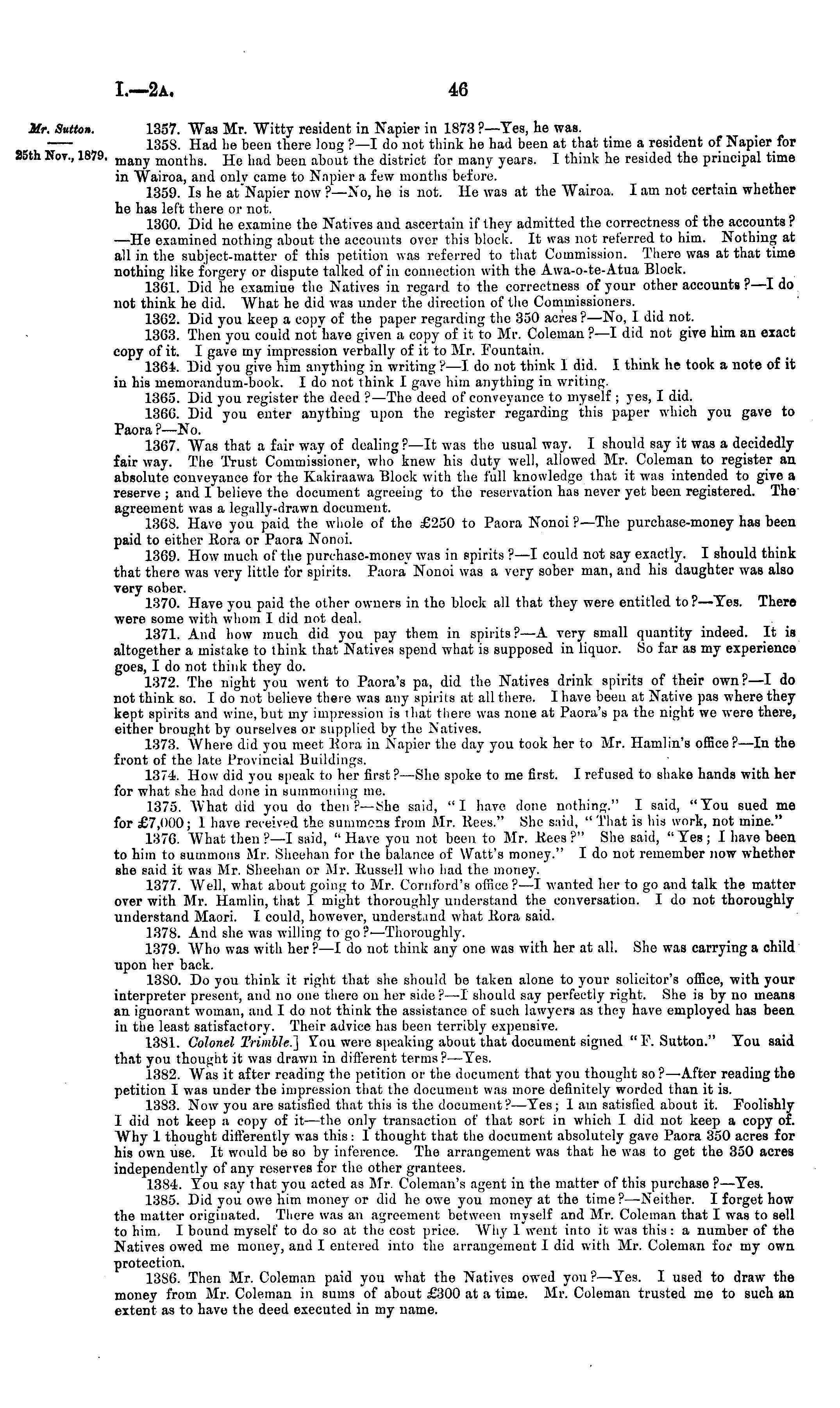 1357. "Was Mr. Witty resident in Napier in 1873 ?—Yes, he was. 1358. Had lie been there long ?—I do not think he had been at that time a resident of Napier for many months. He had been about the district for many years. I think he resided the principal time in Wairoa, and only came to Napier a few months before. 1359. Is he at "Napier now ?—No, he is not. He was at the Wairoa. lam not certain whether he has left there or not. 13C0. Did he examine the Natives and ascertain if they admitted the correctness of the accounts ? —He examined nothing about tho accounts over this block. It was not referred to him. Nothing at all in the subject-matter of this petition was referred to that Commission. There was at that time nothing like forgery or dispute talked of in connection with the Awa-o-te-Atua Block. 1301. Did he examine the Natives in regard to the correctness of your other accounts ? —I do not think he did. AVhat he did was under the direction of tho Commissioners. 13G2. Did you keep a copy of the paper regarding the 350 acres ?—No, I did not. 13G3. Then you could not'have given a copy of it to Mr. Coleman ?—I did not give him an exact copy of it. I gave my impression verbally of it to Mr. Fountain. 1864. Did you give him anything in writing ? —I do not think 1 did. I think he took a note of it in his memorandum-book. Ido not think I gave him anything in writing. 1365. Did you register the deed ? —The deed of conveyance to myself ; yes, I did. 136 G. Did you enter anything upon the register regarding this paper which you gave to Paora ?—No. 1307. AVas that a fair way of dealing ?—lt was the usual way. I should say it was a decidedly fair way. The Trust Commissioner, wlio knew his duty well, allowed Mr. Coleman to register an absolute conveyance for the Kakiraawa Block with the full knowledge that it was intended to give a reserve ; and I believe the document agreeing to the reservation has never yet been registered. The agreement was a legally-drawn document. 13G8. Have you paid the whole of the £250 to Paora Nonoi ?—The purchase-money has been paid to either Bora or Paora Nonoi. 1369. How much of the purchase-money was in spirits ? —I could not say exactly. I should think that there was very little for spirits. Paora Nonoi was a very sober man, and his daughter was also very sober. 1370. Have you paid the other owners in tho block all that they were entitled to ?—Tes. There were some with whom I did not deal. 1371. And how much did you pay them in spirits? —A very small quantity indeed. It is altogether a mistake to think that Natives spend what is supposed in liquor. So far as my experience goes, I do not think they do. 1372. The night you went to Paora's pa, did the Natives drink spirits of their own?—l do not think so. Ido not believe there was any spirits at all there. I have been at Native pas where they kept spirits and wine, but my impression is ihat there was none at Paora's pa the night we were there, either brought by ourselves or supplied by the Natives. 1373. AVhere did you meet Bora in Napier the day you took her to Mr. Hamlin's office?—ln the front of the late Provincial Buildings. 1374. How did you speak to her first? —She spoke to me first. I refused to shake hands with her for what she had done in summoning me. 1375. AVhat did you do then?— She said, "I have done nothing." I said, "You sued me for £7,000; 1 have received the summons from Mr. Bees." She said, " That is his work, not mine." 1376. AVhat then?—l said, "Have you not beeu to Mr. Bees?" She said, "Yes; I have been to him to summons Mr. Sheehan for the balance of Watt's money." Ido not remember now whether Bhe said it was Mr. Sheehan or Mr. Russell who had the moriey. 1377. AVell, what about going to Mr. Cornford's. office?—l wanted her to go and talk the matter over with Mr. Hamlin, that I might thoroughly understand the conversation. I do not thoroughly understand Maori. I could, however, understand what Bora said. 1378. And she was willing to go?— Thoroughly. 1379. AVho was with her ?—I do not think any one was with her at all. She was carrying a child upon her back. 13S0. Do you think it right that she should be taken alone to your solicitor's office, with your interpreter present, and no one there on her side? —I should say perfectly right. She is by no means an ignorant woman, and I do not think the assistance of such lawyers as they have employed has been in the least satisfactory. Their advice has been terribly expensive. 1381. Colonel Trimble.] You. were speaking about that document signed "F. Sutton." You said that you thought it was drawn in different terms ?—Yes. 1382. AVas it after reading the petition or the document that you thought so ?—After reading the petition I was under the impression that the document was more definitely worded than it is. 1383. Now you are satisfied that this is tho document ? —Yes ; lam satisfied about it. Foolishly I did not keep a copy of it —the only transaction of that sort in which I did not keep a copy of. Why I thought differently was this: 1 thought that the document absolutely gave Paora 350 acres for his own use. It would be so by inference. The arrangement was that he was to get the 350 acres independently of any reserves for the other grantees. 1384. You say that you acted as Mr. Coleman's agent in the matter of this purchase ?—Yes. 1385. Did you owe him money or did he owe you money at the time?—-Neither. I forget how the matter originated. There was an agreement between myself and Mr. Coleman that I was to sell to him. I bound myself to do so at the cost price. AVhy 1 went into it was this : a number of the Natives owed me money, and I entered into the arrangement I did with Mr. Coleman for my own protection. 1386. Then Mr. Coleman paid you what the Natives owed you? —Yes. I used to draw the money from Mr. Coleman in sums of about £300 at a time. Mr. Coleman trusted me to such an extent as to h