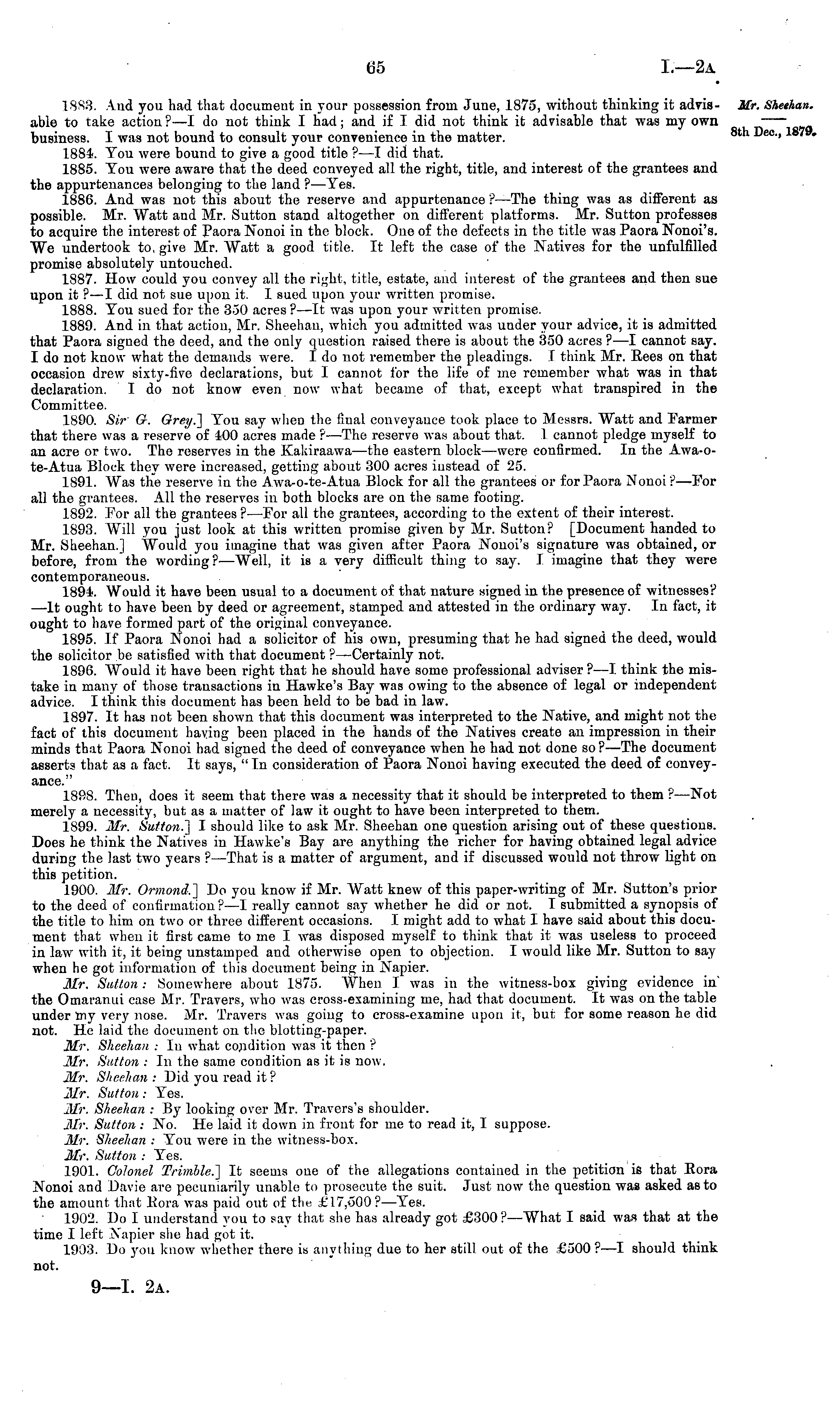 1888. And you had that document in your possession from June, 1875, without thinking it advisable to take action ?—I do not think I had; and if I did not think it advisable that was my own business. I was not bound to consult your convenience in the matter. 1884. Tou were bound to give a good title ? —I did that. 1885. Tou were aware that the deed conveyed all the right, title, and interest of the grantees and the appurtenances belonging to the land ?—Tes. 1886. And was not this about the reserve and appurtenance ?—The thing was as different as possible. Mr. Watt and Mr. Sutton stand altogether on different platforms. Mr. Sutton professes to acquire the interest of Paora Nonoi in tho block. One of the defects in the title was Paora Nonoi's. We undertook to. give Mr. Watt a good title. It left the case of the Natives for the unfulfilled promise absolutely untouched. 1887. How could you convey all the right, title, estate, and interest of the grantees and then sue upon it ? —I did not sue upon it. I sued upon your written promise. 1888. Tou sued for the 350 acres ? —lt was upon your written promise. 1889. And in that action, Mr. Sheehan, which you admitted was under your advice, it is admitted that Paora signed the deed, and the only question raised there is about the 350 acres ? —I cannot say. Ido not know what the demands were. Ido not remember the pleadings. 1 think Mr. Eees on that occasion drew sixty-five declarations, but I cannot for the life of me remember what was in that declaration. I do not know even now what became of that, except what transpired in the Committee. 1890. Sir G. Grey.] Tou say when the final conveyance took place to Messrs. Watt and Farmer that there was a reserve of 400 acres made ? —The reserve was about that. 1 cannot pledge myself to an acre or two. The reserves in the Kakiraawa —the eastern block —were confirmed. In the Awa-o-te-Atua Block they were increased, getting about 300 acres instead of 25. 1891. Was the reserve in the A.wa-o-te-Atua Block for all the grantees or for Paora Nonoi ? —For all the grantees. All the reserves in both blocks are on the same footing. 1892. For all the grantees ? —For all the grantees, according to the extent of their interest. 1893. Will you just look at this written promise given by Mr. Sutton? [Document handed to Mr. Sheehan.] Would you imagine that was given after Paora Nonoi's signature was obtained, or before, from the wording ?—AVell, it is a very difficult thing to say. I imagine that they were contemporaneous. 1894. Would it have been usual to a document of that nature signed in the presence of witnesses? —It ought to have been by deed or agreement, stamped and attested in the ordinary way. In fact, it ought to have formed part of the original conveyance. 1895. If Paora Nonoi had a solicitor of his own, presuming that he had signed the deed, would the solicitor be satisfied with that document ? —Certainly not. 1896. AVould it have been right that he should have some professional adviser ? —1 think the mistake iv many of those transactions in Hawke's Bay was owing to the absence of legal or independent advice. I think this document has been held to be bad in law. 1897. It has not been shown that this document was interpreted to the Native, and might not the fact of this document haying been placed in the hands of the Natives create an impression in their minds that Paora Nonoi had signed the deed of conveyance when he had not done so? —The document asserts that as a fact. It says, "In consideration of Paora Nonoi having executed the deed of conveyance." 1898. Then, does it seem that there was a necessity that it should be interpreted to them ? —Not merely a necessity, but as a matter of law it ought to have been interpreted to them. 1899. Mr. Sutton.] I should like to ask Mr. Sheehan one question arising out of these questions. Does he think the Natives in Hawke's Bay are anything the richer for having obtained legal advice during the last two years ? —That is a matter of argument, and if discussed would not throw light on this petition. 1900. Mr. Ormond.] Do you know if Mr. AVatt knew of this paper-writing of Mr. Sutton's prior to the deed of confirmation ?—I really cannot say whether he did or not. I submitted a synopsis of the title to him on two or three different occasions. I might add to what I have said about this document that when it first came to me I was disposed myself to think that it was useless to proceed in law with it, it being unstamped and otherwise open to objection. I would like Mr. Sutton to say when he got information of this document being in Napier. Mr. Sutton: Somewhere about 1875. AVhen I was in the witness-box giving evidence in' the Omaranui case Mr. Travers, who was cross-examining me, had that document. It was on the table under my very nose. Mr. Travers was going to cross-examine upon it, but for some reason he did not. He laid the document on the blotting-paper. Mr. Sheehan .- Iv what condition was it then ? Mr. Sutton : In the same condition as it is now. Mr. Sheehan : Did you read it ? Mr. Sulton: Tes. Mr. Sheehan : By looking over Mr. Travers's shoulder. Mr. Sutton : No. He laid it down in front for me to read it, I suppose. Mr. Sheehan : Tou were in the witness-box. Mr. Sutton : Tes. 1901. Colonel Trimble.] It seems one of the allegations contained in the petition is that Eora Nonoi and Davie are pecuniarily unable to prosecute the suit. Just now the question was asked as to the amount that Eora was paid out of the L"17,500? —Tes. 1902. Do I understand you to say that she has already got £300 ?—-AVhat I said was that at the time I left Napier she had got it. 1903. Do you know whether there is anything due to her still out of the £500 ?—I should think not. 9—l. 2a.