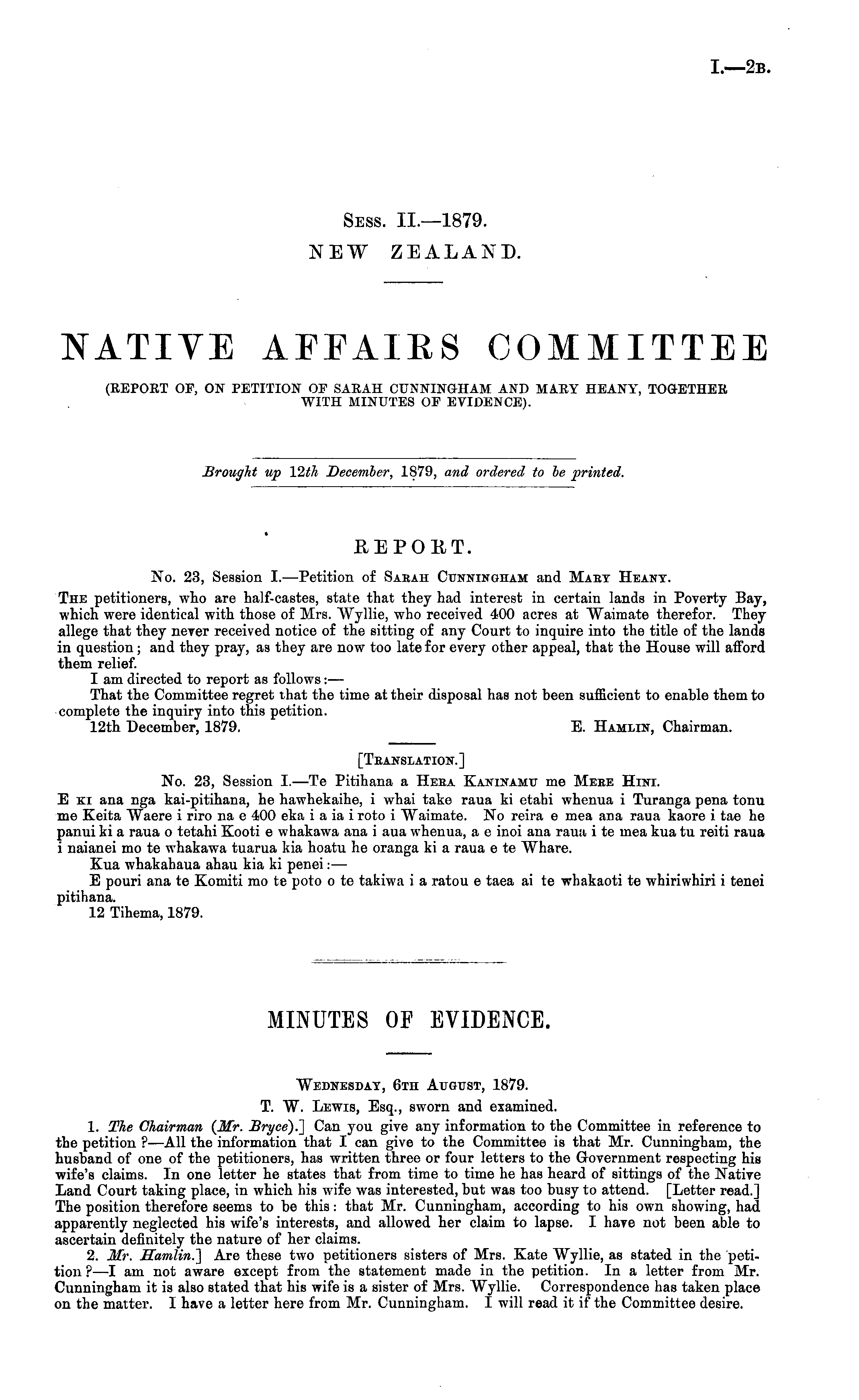 MINUTES OF EVIDENCE. "Wednesday, 6th August, 1879. T. W. Lewis, Esq., sworn and examined. 1. The Chairman (Mr. Bryce).] Can you give any information to the Committee in reference to the petition ? —All the information that I can give to the Committee is that Mr. Cunningham, the husband of one of the petitioners, has written three or four letters to the Government respecting his wife's claims. In one letter he states that from time to time he has heard of sittings of the Native Land Court taking place, in which his wife was interested, but was too busy to attend. [Letter read.] The position therefore seems to be this: that Mr. Cunningham, according to his own showing, had apparently neglected his wife's interests, and allowed her claim to lapse. I have not been able to ascertain definitely the nature of her claims. 2. Mr. Hamlin.] Are these two petitioners sisters of Mrs. Kate Wyllie, as stated in the petition ? —I am not aware except from the statement made in the petition. In a letter from Mr. Cunningham it is also stated that his wife is a sister of Mrs. Wyllie. Correspondence has taken place on the matter. I have a letter here from Mr. Cunningham. I will read it if the Committee desire.
