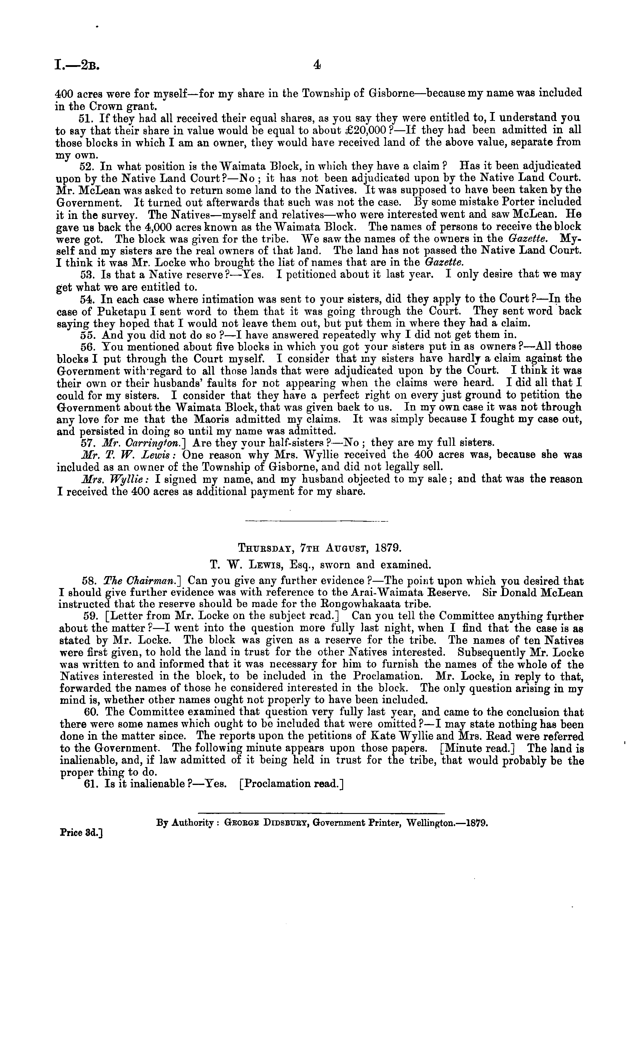 400 acres were for myself—for my share in the Township of Gisborne —because my name was included in the Crown grant. 51. If they had all received their equal shares, as you say they were entitled to, I understand you to say that their share in value would be equal to about £20,000 ? —lf they had been admitted in all those blocks in which I am an owner, they would have received land of the above value, separate from my own. 52. In what position is the Waimata Block, in which they have a claim ? Has it been adjudicated upon by the Native Land Court? —No ; it has not been adjudicated upon by the Native Land Court. Mr. McLean was asked to return some land to the Natives. It was supposed to have been taken by the Government. It turned out afterwards that such was not the case. By some mistake Porter included it in the survey. The Natives—myself and relatives —who were interested went and saw McLean. He gave us back the 4,000 acres known as the Waimata Block. The names of persons to receive the block were got. The block was given for the tribe. We saw the names of the owners in the Gazette. Myself and my sisters are the real owners of that land. The land has not passed the Native Land Court. I think it was Mr. Locke who brought the list of names that are in the Gazette. 53. Is that a Native reserve?- —-Tes. I petitioned about it last year. I only desire that we may get what we are entitled to. 54. In each case where intimation was sent to your sisters, did they apply to the Court ?—ln the case of Puketapu I sent word to them that it was going through the Court. They sent word back saying they hoped that I would not leave them out, but put them in where they had a claim. 55. And you did not do so ? —I have answered repeatedly why I did not get them in. 56. Tou mentioned about five blocks in which you got your sisters put in as owners ? —All those blocks I put through the Court myself. I consider that my sisters have hardly a claim against the Government withregard to all those lands that were adjudicated upon by the Court. I think it was their own or their husbands' faults for not appearing when the claims were heard. I did all that I could for my sisters. I consider that they have a perfect right on every just ground to petition the Government about the Waimata Block, that was given back to us. In my own case it was not through any love for me that the Maoris admitted my claims. It was simply because I fought my case out, and persisted in doing so until my name was admitted. 57. Mr. Carrington.] Aro they your half-sisters ? —No ; they are my full sisters. Mr. T. W. Lewis: One reason why Mrs. Wyllie received the 400 acres was, because she was included as an owner of the Township of Gisborne, and did not legally sell. Mrs. Wyllie: I signed my name, and my husband objected to my sale; and that was the reason I received the 400 acres as additional payment for my share.