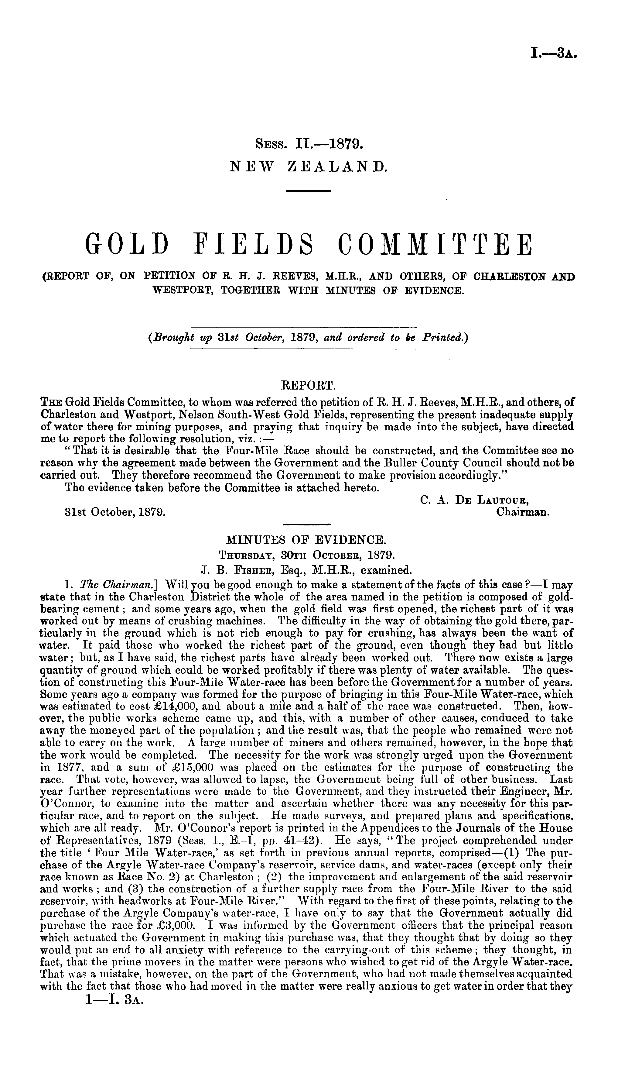 (Brought up 31st October, 1879, and ordered to te Printed.) EEPORT. The Gold Fields Committee, to whom was referred the petition of R. H. J. Reeves, M.H.R., and others, of Charleston and Westport, Nelson South-West Gold Fields, representing the present inadequate supply of water there for mining purposes, and praying that inquiry be made into the subject, have directed me to report the following resolution, viz. : — " That it is desirable that the Pour-Mile Race should be constructed, and the Committee see no reason why the agreement made between the Government and the Buller County Council should not be carried out. They therefore recommend the Government to make provision accordingly." The evidence taken before the Committee is attached hereto. C. A. De Lautotje, 31st October, 1879. Chairman. MINUTES OP EVIDENCE. Thuesdat, 30th Octobee, 1879. J. B. Fisheb, Esq., M.H.R., examined. 1. The Chairman] Will you be good enough to make a statement of the facts of this case ? —I may state that in the Charleston District the whole of the area named in the petition is composed of goldbearing cement; and some years ago, when the gold field was first opened, the richest part of it was worked out by means of crushing machines. The difficulty in the way of obtaining the gold there, particularly in the ground which is not rich enough to pay for crushing, has always been the want of water. It paid those who worked the richest part of the ground, even though they had but little water; but, as I have said, the richest parts have already been worked out. There now exists a large quantity of ground which could be worked profitably if there was plenty of water available. The question of constructing this Four-Mile Water-race has been before the Government for a number of years. Some years ago a company was formed for the purpose of bringing in this Four-Mile Water-race, which was estimated to cost £14,000, and about a mile and a half of the race was constructed. Then, however, the public works scheme came up, and this, with a number of other causes, conduced to take away the moneyed part of the population ; and the result was, that the people who remained were not able to carry on the work. A large number of miners and others remained, however, in the hope that the work would be completed. The necessity for the work was strongly urged upon the Government in 1877, and a sum of £15,000 was placed on the estimates for the purpose of constructing the race. That vote, however, was allowed to lapse, the Government being full of other business. Last year further representations were made to the Government, and they instructed their Engineer, Mr. O'Connor, to examine into the matter and ascertain whether there was any necessity for this particular race, and to report on the subject. He made surveys, and prepared plans and specifications, which are all ready. Mr. O'Connor's report is printed in the Appendices to the Journals of the House of Representatives, 1879 (Sess. 1., E.-l, pp. 41-42). He says, "The project comprehended under the title ' Four Mile Water-race,' as set forth in previous annual reports, comprised—(l) The purchase of the Argyle Water-race Company's reservoir, service dams, and water-races (except only their race known as Race No. 2) at Charleston ; (2) the improvement and enlargement of the said reservoir and works ; and (3) the construction of a further supply race from the Four-Mile River to the said reservoir, with headworks at Four-Mile River." With regard to the first of these points, relating to the purchase of the Argyle Company's water-race, I have only to say that the Government actually did purchase the race for £3,000. I was informed by the Government officers that the principal reason which actuated the Government in making this purchase was, that they thought that by doing so they would put an end to all anxiety with reference to the carrying-out of this scheme; they thought, in fact, that the prime movers in the matter were persons who wished to get rid of the Argyle Water-race. That was a mistake, however, on the part of the Government, who had not made themselves acquainted with the fact that those who had moved in the matter were really anxious to get water in order that they I—l. 3a.