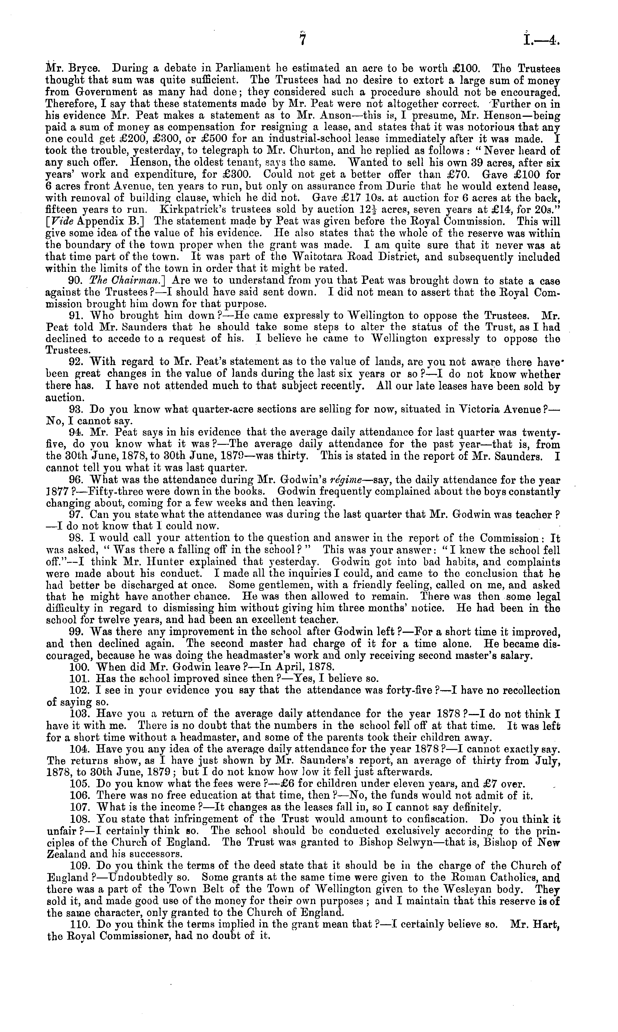 Mr. Bryce. During a debate in Parliament he estimated an acre to be worth £100. The Trustees thought that sum was quite sufficient. The Trustees had no desire to extort a large sum of money from Government as many had done; they considered such a procedure should not be encouraged. Therefore, I say that these statements made by Mr. Peat were not altogether correct. Further on in his evidence Mr. Peat makes a statement as to Mr. Anson—this is, I presume, Mr. Henson—being paid a sum of money as compensation for resigning a lease, and states that it was notorious that any one could get £200, £300, or £500 for an industrial-school lease immediately after it was made. I took the trouble, yesterday, to telegraph to Mr. Churton, and he replied as follows : " Never heard of any such offer. Henson, the oldest tenant, says the same. Wanted to sell his own 39 acres, after six years' work and expenditure, for £300. Could not get a better offer than £70. Gave £100 for 6 acres front Avenue, ten years to run, but only on assurance from Durie that he would extend lease, with removal of building clause, which he did not. Gave £17 10s. at auction for 6 acres at the back, fifteen years to run. Kirkpatrick's trustees sold by auction 12J acres, seven years at £14, for 205." [Vide Appendix B.] The statement made by Peat was given before the Eoyal Commission. This will give some idea of the value of his evidence. He also states that the whole of the reserve was within the boundary of the town proper when the grant was made. I am quite sure that it never was at that time part of the town. It was part of the Waitotara Eoad District, and subsequently included within the limits of the town in order that it might be rated. 90. The Chairman.] Are we to understand from you that Peat wras brought down to state a case against the Trustees? —I should have said sent down. I did not mean to assert that the Eoyal Commission brought him down for that purpose. 91. Who brought him down ? —He came expressly to Wellington to oppose the Trustees. Mr. Peat told Mr. Saunders that he should take some steps to alter the status of the Trust, as I had declined to accede to a request of his. I believe he came to Wellington expressly to oppose the Trustees. 92. With regard to Mr. Peat's statement as to the value of lands, are you not aware there havebeen great changes in the value of lands during the last six years or so ?—I do not know whether there has. I have not attended much to that subject recently. All our late leases have been sold by auction. 93. Do you know what quarter-acre sections are selling for now, situated in Victoria Avenue ? — No, I cannot say. 94. Mr. Peat says in his evidence that the average daily attendance for last quarter was twentyfive, do you know what it was ? —The average daily attendance for the past year —that is, from the 30th June, 1878, to 30th June, 1879 —was thirty. This is stated in the report of Mr. Saunders. I cannot tell you what it was last quarter. 96. What was the attendance during Mr. Godwin's regime —say, the daily attendance for the year 1877 ? —Fifty-three were down in the books. Godwin frequently complained about the boys constantly changing about, coming for a few weeks and then leaving. 97. Can you state what the attendance was during the last quarter that Mr. Godwin was teacher ? —I do not know that I could now. 98. I would call your attention to the question and answer in the report of the Commission : It was asked, " Was there a falling off in the school ? " This was your answer :" I knew the school fell off." —I think Mr. Hunter explained that yesterday. Godwin got into bad habits, and complaints were made about his conduct. I made all the inquiries I could, and came to the conclusion that he had better be discharged at once. Some gentlemen, with a friendly feeling, called on me, and asked that he might have another chance. He was then allowed to remain. There was then some legal difficulty in regard to dismissing him without giving him three months' notice. He had been in the school for tw relve years, and had been an excellent teacher. 99. Was there any improvement in the school after Godwin left ?—For a short time it improved, and then declined again. The second master had charge of it for a time alone. He became discouraged, because he was doing the headmaster's work and only receiving second master's salary. 100. When did Mr. Godwin leave ?—ln April, 1878. 101. Has the school improved since then ? —Tes, I believe so. 102. I see in your evidence you say that the attendance was forty-five ? —I have no recollection of saying so. 103. Have you a return of the average daily attendance for the year 1878 ?—I do not think I have it with me. There is no doubt that the numbers in the school fell off at that time. It was left for a short time without a headmaster, and some of the parents took their children away. 104. Have you any idea of the average daily attendance for the year 1878 ?—I cannot exactly say. The returns show, as I have just shown by Mr. Saunders's report, an average of thirty from July, 1878, to 30th June, 1879; but Ido not know how low it fell just afterwards. 105. Do you know what the fees were ?—£6 for children under eleven years, and £7 over. 106. There was no free education at that time, then ? —No, the funds would not admit of it. 107. What is the income ?—lt changes as the leases fall in, so I cannot say definitely. 108. Tou state that infringement of the Trust would amount to confiscation. Do you think it unfair ? —I certainly think so. The school should be conducted exclusively according to the principles of the Church of England. The Trust was granted to Bishop Selvvyn—that is, Bishop of New Zealand and his successors. 109. Do you think the terms of the deed state that it should be in the charge of the Church of England ? —Undoubtedly so. Some grants at the same time were given to the Eoman Catholics, a