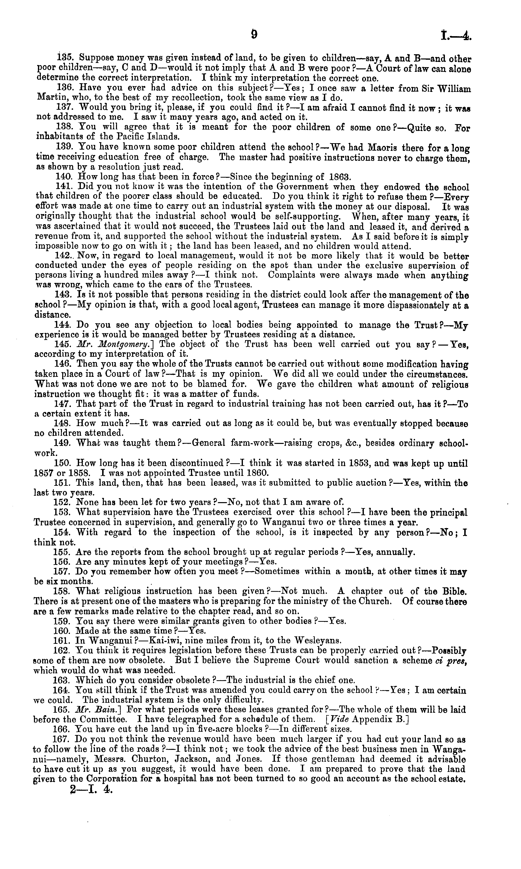 135. Suppose money was given instead of land, to be given to children—say, A and B—and other poor children—say, C and D—would it not imply that A and B were poor ?—A Court of law can alone determine the correct interpretation. I think my interpretation the correct one. 136. Have you ever had advice on this subject?—Tes; I once saw a letter from Sir William Martin, who, to the best of my recollection, took the same view as I do. 137. Would you bring it, please, if you could find it ?—I am afraid I cannot find it now ;it was not addressed to me. I saw it many years ago, and acted on it. 138. You will agree that it is meant for the poor children of some one ?—Quite so. For inhabitants of the Pacific Islands. 139. Tou have known some poor children attend the school ?—We had Maoris there for a long time receiving education free of charge. The master had positive instructions never to charge them, as shown by a resolution just read. 140. How long has that been in force?— Since the beginning of 1863. 141. Did you not know it was the intention of the Government when they endowed the school that children of the poorer class should be educated. Do you think it right to refuse them ?—Every effort was made at one time to carry out an industrial system with the money at our disposal. It was originally thought that the industrial school would be self-supporting. When, after many years, it was ascertained that it would not succeed, the Trustees laid out the land and leased it, and derived a revenue from it, and supported the school without the industrial system. As I said before it is simply impossible now to go on with it; the land has been leased, and no children would attend. 142.. Now, in regard to local management, would it not be rnoro likely that it would be better conducted under the eyes of people residing on the spot than under the exclusive supervision of persons living a hundred miles away ? —I think not. Complaints were always made when anything was wrong, which came to the ears of the Trustees. 143. Is it not possible that persons residing in the district could look after the management of the school ?—My opinion is that, with a good local agent, Trustees can manage it more dispassionately at a distance. 144. Do you see any objection to local bodies being appointed to manage the Trust? —My experience is it would be managed better by Trustees residing at a distance. 145. Mr. Montgomery.] The object of the Trust has been well carried out you say? — Tes, according to my interpretation of it. 146. Then you say the whole of the Trusts cannot be carried out without some modification having taken place in a Court of law ?—That is my opinion. We did all we could under the circumstances. What was not done we are not to be blamed for. We gave the children what amount of religious instruction we thought fit: it was a matter of funds. 147. That part of the Trust in regard to industrial training has not been carried out, has it ?—To a certain extent it has. 148. How much ? —lt was carried out as long as it could be, but was eventually stopped because no children attended. 149. What was taught them? —General farm-work—raising crops, &c, besides ordinary schoolwork. 150. How long has it been discontinued ?—I think it was started in 1853, and was kept up until 1857 or 1858. I was not appointed Trustee until 1860. 151. This land, then, that has been leased, was it submitted to public auction ? —Tes, within the last two years. 152. None has been let for two years ? —No, not that I am aware of. 153. What supervision have the Trustees exercised over this school ? —I have been the principal Trustee concerned in supervision, and generally go to Wanganui two or three times a year. 154. With regard to the inspection of the school, is it inspected by any person ?—No; I think not. 155. Are the reports from the school brought up at regular periods ?—Tes, annually. 156. Are any minutes kept of your meetings ?—Tes. 157. Do you remember how often you meet ?—Sometimes wdthin a month, at other times it may be six months. 158. What religious instruction has been given ? —Not much. A chapter out of the Bible. There is at present one of the masters who is preparing for the ministry of the Church. Of course there are a few remarks made relative to the chapter read, and so on. 159. Tou say there were similar grants given to other bodies ?—Tes. 160. Made at the same time ? —Tes. 161. In Wanganui? —Kai-iwi, nine miles from it, to the Wesleyans. 162. Tou think it requires legislation before these Trusts can be properly carried out? —Possibly some of them are now obsolete. But I believe the Supreme Court wrould sanction a scheme ci pres, which would do what was needed. 163. Which do you consider obsolete ? —The industrial is the chief one. 164. Tou still think if the Trust was amended you could carry on the school r—Yes ; I am certain we could. The industrial system is the only difficulty. 165. Mr. Bain.] For what periods were these leases granted for? —The whole of them will be laid before the Committee. I have telegraphed for a schedule of them. [Vide Appendix B.] 166. Tou have cut the land up in five-acre blocks ? —ln different sizes. 167. Do you uot think the revenue would have been much larger if you had cut your land so as to follow the line of the roads ?—I think not; we took the advice of the best business men in Wanganui—namely, Messrs. Churton, Jackson, and Jones. If those gentleman had deemed it advisable to have cut it up as you suggest, it would have been done. I am prepared to prove that the laud given to the Corporation for a hospital has not been turned to so good au account as the school estate. 2—l. 4.