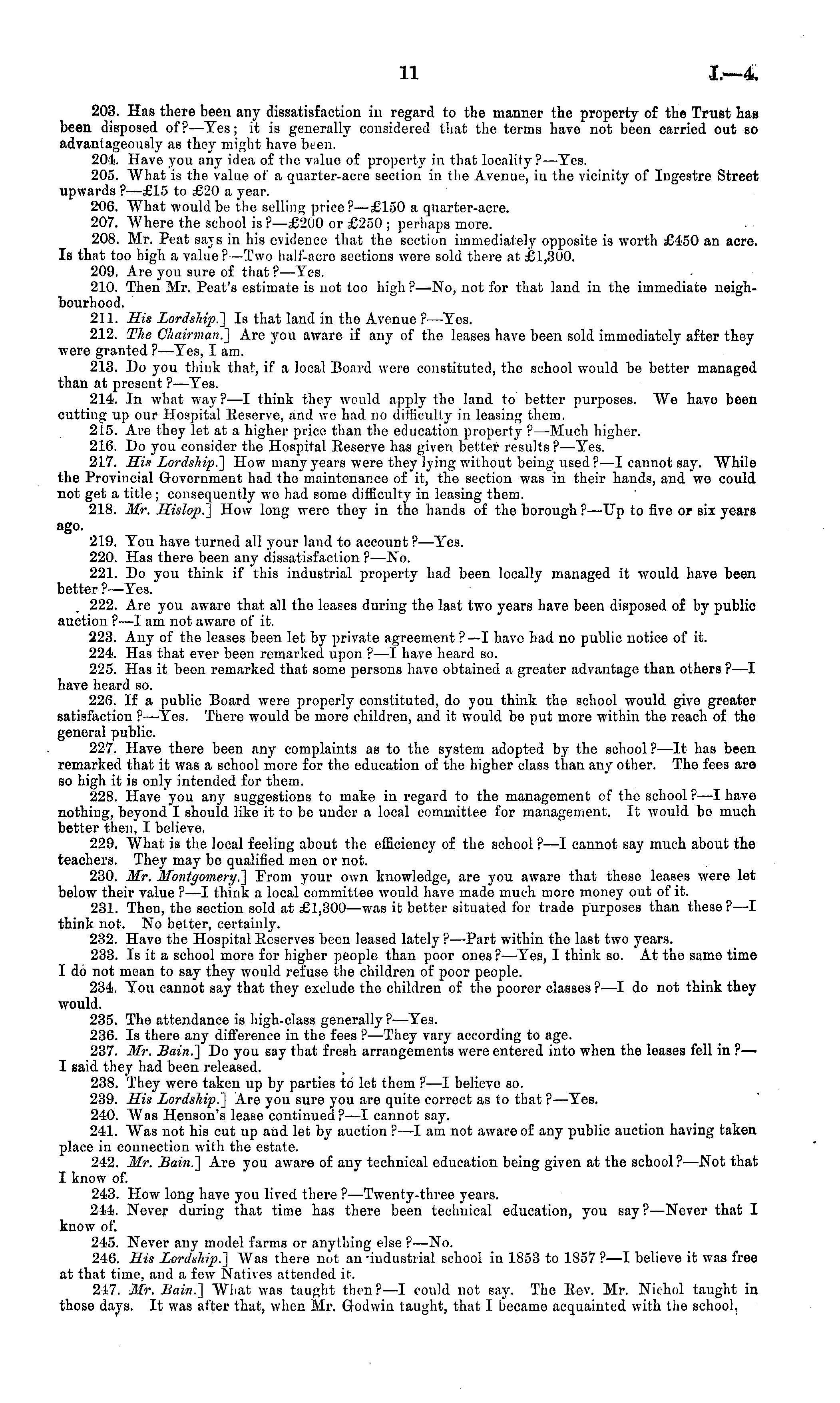 203. Has there been any dissatisfaction in regard to the manner the property of the Trust has been disposed of? —Tes; it is generally considered that the terms have not been carried out so advantageously as they might have been. 204. Have you any idea of the value of property' in that locality ?—Tes. 205. What is the value of a quarter-acre section in the Avenue, in the vicinity of Ingestre Street upwards ? —£ls to £20 a year. 206. What would be the selling price?—£lso a quarter-acre. 207. Where the school is ?—£2oo or £250 ; perhaps more. 208. Mr. Peat sajs in his evidence that the section immediately opposite is worth £450 an acre. Is that too high a value?— Two half-acre sections were sold there at £1,300. 209. Are you sure of that ? —Tes. 210. Then Mr. Peat's estimate is not too high?—No, not for that land in the immediate neighbourhood. 211. Hit LordshipT] Is that land in the Avenue r —Tes. 212. The Chairman.] Are you aware if any of the leases have been sold immediately after they were granted ?—Tes, I am. 213. Do you think that, if a local Board were constituted, the school would be better managed than at present ? —Tes. 214. In what way? —I think they would apply the land to better purposes. We have been cutting up our Hospital Eeserve, and wo had no difficulty in leasing them. 215. Are they let at a higher price than the education property ? —Much higher. 216. Do you consider the Hospital Eeserve has given better results ? —Tes. 217. His Lordship.] How many years were they lying without being used? —I cannot say. While the Provincial Government had the maintenance of it, the section was in their hands, and we could not get a title; consequently we had some difficulty in leasing them. 218. Mr. Hislop.] How long were they in the hands of the borough ?—Up to five or six years ago. 219. Tou have turned all your land to account ? —Tes. 220. Has there been any dissatisfaction ? —No. 221. Do you think if this industrial property had been locally managed it would have been better ? —Tes. 222. Are you aware that all the leases during the last two years have been disposed of by public auction ? —I am not aware of it. 223. Any of the leases been let by private agreement ?—I have had no public notice of it. 224. Has that ever been remarked upon ?—I have heard so. 225. Has it been remarked that some persons have obtained a greater advantage than others ? —I have heard so. 226. If a public Board were properly constituted, do you think the school would give greater satisfaction ?—Tes. There would be more children, and it would be put more within the reach of the general public. 227. Have there been any complaints as to the system adopted by the school ? —lt has been remarked that it was a school more for the education of the higher class than any other. The fees are so high it is only intended for them. 228. Have you any suggestions to make in regard to the management of the school? —I have nothing, beyond I should like it to be under a local committee for management. It would be much better then, I believe. 229. What is the local feeling about the efficiency of the school ? —I cannot say much about the teachers. They may be qualified men or not. 230. Mr. Montgomery.] From your own knowledge, are you aware that these leases were let below their value ? —I think a local committee would have made much more money out of it. 231. Then, the section sold at £1,300 —was it better situated for trade purposes than these? —I think not. No better, certainly. 232. Have the Hospital Eeserves been leased lately ? —Part within the last two years. 233. Is it a school more for higher people than poor ones ?—Tes, I think so. At the same time I do not mean to say they would refuse the children of poor people. 234. Tou cannot say that they exclude the children of the poorer classes ? —I do not think they would. 235. The attendance is high-class generally ? —Tes. 236. Is there any difference in the fees ? —They vary according to age. 237. Mr. Bain.] Do you say that fresh arrangements were entered into when the leases fell in ?— I said they had been released. 238. They were taken up by parties to let them ? —I believe so. 239. His Lordship.] Are you sure you are quite correct as to that ?—Tes. 240. Was lienson's lease continued? —I cannot say. 241. Was not his cut up and let by auction ?—I am not aware of any public auction having taken place in connection with the estate. 242. Mr. Bain.] Are you aware of any technical education being given at the school?— Not that I know of. 243. How long have you lived there ? —Twenty-three years. 241. Never during that time has there been technical education, you say?— Never that I know of. 245. Never any model farms or anything else ?—No. 246. His Lordship.] Was there not an-industrial school in 1853 to 1857?— I believe it was free at that time, and a few Natives attended it. 247. Mr. Bain.] What was taught then?—l could not say. The Eev. Mr. Nichol taught in those days. It was after that, when Mr. Godwin taught, that I became acquainted with the school,