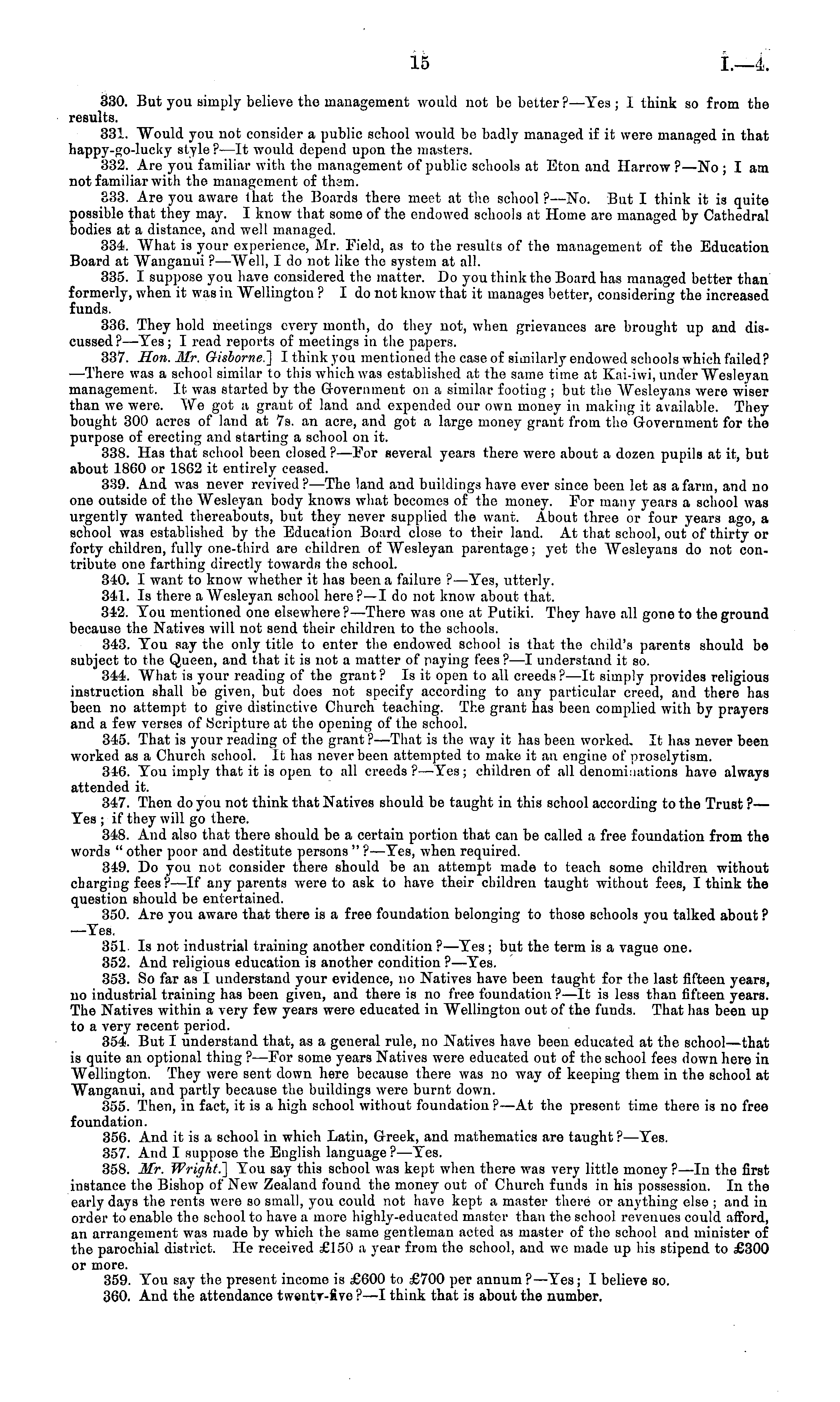 330. But you simply believe the management would not be better?—Y~es; I think so from the results. 331. Would you not consider a public school would bo badly managed if it were managed in that happy-go-lucky style ? —lt would depend upon the masters. 332. Are you familiar with the management of public schools at Eton and Harrow ? —No ; I am not familiar with the management of them. 333. Are you aware that the Boards there meet at the, school ? —No. But I think it is quite possible that they may. I know that some of the endowed schools at Home are managed by Cathedral bodies at a distance, and well managed. 334. What is your experience, Mr. Field, as to the results of the management of the Education Board at Wanganui ? —Well, I do not like the system at all. 335. I suppose you have considered the matter. Do you think the Board has managed better than formerly, when it was in Wellington ? I do not know that it manages better, considering the increased funds. 336. They hold meetings every month, do they not, when grievances are brought up and discussed? —-Tes; I read reports of meetings in the papers. 337. Hon. Mr. Gisborne.] I think you mentioned the case of similarly endowed schools which failed? —There was a school similar to this which was established at the same time at Kai-iwi, under Wesleyan management. It was started by the Government on a similar footing ; but the Wesleyans were wiser than we were. We got a grant of land and expended our own money in making it available. They bought 300 acres of land at 7s. an acre, and got a large money grant from the Government for the purpose of erecting and starting a school on it. 338. Has that school been closed?— For several years there were about a dozen pupils at it, but about 1860 or 1862 it entirely ceased. 339. And was never revived? —The land and buildings have ever since been let as a farm, and no one outside of the Wesleyan body knows what becomes of the money. For many years a school was urgently wanted thereabouts, but they never supplied the want. About three or four years ago, a school was established by the Education Board close to their land. At that school, out of thirty or forty children, fully one-third are children of Wesleyan parentage; yet the Wesleyans do not contribute one farthing directly towards the school. 340. I want to know whether it has been a failure ?—Tes, utterly. 341. Is there a Wesleyan school here? —I do not know about that. 342. Tou mentioned one elsewhere?— There was one at Putiki. They have all gone to the ground because the Natives will not send their children to the schools. 343. Tou say the only title to enter the endowed school is that the child's parents should be subject to the Queen, and that it is uot a matter of paying fees ? —I understand it so. 344. What is your reading of the grant? Is it open to all creeds?—lt simply provides religious instruction shall be given, but does not specif}' according to any particular creed, and there has been no attempt to give distinctive Church teaching. The grant has been complied with by prayers and a few verses of Scripture at the opening of the school. 345. That is your reading of the grant?— That is the way it has been worked. It has never been worked as a Church school. It has never been attempted to make it an engine of proselytism. 346. Tou imply that it is open to all creeds ? —-Tes; children of all denominations have always attended it. 347. Then do you not think that Natives should be taught in this school according to the Trust ?— Tes ; if they will go there. 348. And also that there should be a certain portion that can be called a free foundation from the word 3 " other poor and destitute persons " ? —Tes, when required. 349. Do you not consider there should be an attempt made to teach some children without charging fees ? —lf any parents were to ask to have their children taught without fees, I think the question should be entertained. 350. Are you aware that there is a free foundation belonging to those schools you talked about ? —Tes. 351 Is not industrial training another condition ? —Tes ; but the term is a vague one. 352. And religious education is another condition ?—Tes. 353. So far as I understand your evidence, no Natives have been taught for the last fifteen years, no industrial training has been given, and there is no free foundation ?—lt is less than fifteen years. The Natives within a very few years were educated in Wellington out of the funds. That has been up to a very recent period. 354. But I understand that, as a general rule, no Natives have been educated at the school—that is quite an optional thing ? —For some years Natives were educated out of the school fees down here in Wellington. They were sent down here because there was no way of keeping them in the school at Wanganui, and partly because the buildings were burnt down. 355. Then, in fact, it is a high school without foundation?—At the present time there is no free foundation. 356. And it is a school in which Latin, Greek, and mathematics are taught ? —Tes. 357. And I suppose the English language ? —Tes. 358. Mr. Wright.] Tou say this school was kept when there was very little money ? —ln the first instance the Bishop of New Zealand found the money out of Church funds in his possession. In the early days the rents were so small, you could not have kept a master there or anything else ; and in order to enable tho school to have a more highly-educated master than the school revenues could afford, an arrangement was made by which the same gentleman acted as master of the school and minister of the parochial district. He received £150 a year from the school, and wc made up his stipend to £300 or more. 359. Tou say the present income is £600 to £700 per annum ? —Tes; I believe so. 360. And the attendance tiventr-five ?—I think that is about the number,
