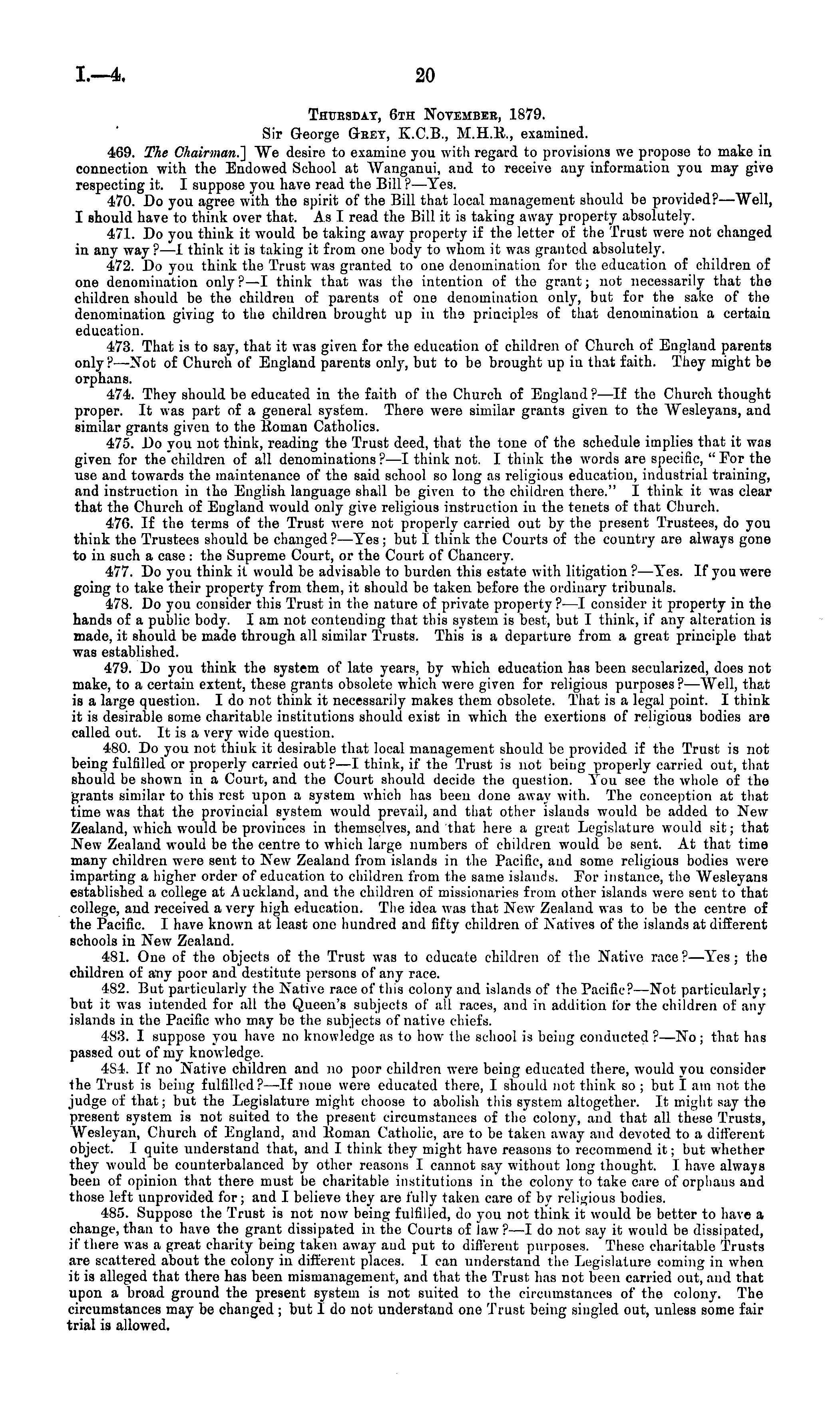 Thursday, 6th November, 1879. Sir George Geey, X.C.8., M.H.E., examined. 469. The Chairman.] We desire to examine you with regard to provisions we propose to make iv connection with the Endowed School at Wanganui, and to receive any information you may give respecting it. I suppose you have read the Bill ? —Tes. 470. Do you agree with the spirit of the Bill that local management should be provided?— Well, I should have to think over that. As I read the Bill it is taking away property absolutely. 471. Do you think it would be taking away property if the letter of the Trust w rere not changed in any way? —I think it is taking it from one body to whom it was granted absolutely. 472. Do you think the Trust was granted to one denomination for the education of children of one denomination only ? —I think that was the intention of the grant; not necessarily that the children should be the children of parents of one denomination only, but for the sake of tho denomination giving to the children brought up in the principles of that denomination a certain education. 473. That is to say, that it was given for the education of children of Church of England parents only? —-Not of Church of England parents only, but to be brought up iv that faith. They might be orphans. 474. They should be educated in the faith of the Church of England ? —lf the Church thought proper. It was part of a general system. There were similar grants given to the Wesleyans, and similar grants given to the Eoman Catholics. 475. Do you not think, reading the Trust deed, that the tone of the schedule implies that it was given for the children of all denominations ? —I think not. I think the words are specific, " For the use and towards the maintenance of the said school so long as religious education, industrial training, and instruction in the English language shall be given to tho children there." I think it was clear that the Church of England would only give religious instruction iv the tenets of that Church. 476. If the terms of the Trust were not properly carried out by the present Trustees, do you think the Trustees should be changed ?—Tes ; but I think the Courts of the country are always gone to in such a case : the Supreme Court, or the Court of Chancery. 477. Do you think it would be advisable to burden this estate with litigation ?—Tes. If you were going to take their property from them, it should be taken before the ordinary tribunals. 478. Do you consider this Trust in the nature of private property? —I consider it property in tho hands of a public body. lam not contending that this system is best, but I think, if any alteration is made, it should be made through all similar Trusts. This is a departure from a great principle that was established. 479. Do you think the system of late years, by which education has been secularized, does not make, to a certain extent, these grants obsolete which were given for religious purposes ? —Well, that is a large question. Ido not think it necessarily makes them obsolete. That is a legal point. I think it is desirable some charitable institutions should exist in which the exertions of religious bodies are called out. It is a very wide question. 480. Do you not think it desirable that local management should be provided if the Trust is not being fulfilled or properly carried out?—l think, if the Trust is not being properly carried out, that should be shown iv a Court, and the Court should decide the question. Tou see the whole of the grants similar to this rest upon a system which has been done away with. The conception at that time was that the provincial system would prevail, and that other islands would be added to New Zealand, which would be provinces in themselves, and that here a great Legislature would sit; that New Zealand would be the centre to which large numbers of children would be sent. At that time many children were sent to New Zealand from islands in the Pacific, and some religious bodies were imparting a higher order of education to children from the same islands. For instance, the Wesleyans established a college at Auckland, and the children of missionaries from other islands were sent to that college, and received a very high education. The idea was that New Zealand was to be the centre of the Pacific. I have known at least one hundred and fifty children of Natives of the islands at different schools in New Zealand. 481. One of the objects of the Trust was to educate children of the Native race ?—Tes; the children of any poor and destitute persons of any race. 482. But particularly the Native race of this colony and islands of the Pacific? —Not particularly; but it was intended for all the Queen's subjects of all races, and in addition for the children of any islands in tho Pacific who may be the subjects of native chiefs. 483. I suppose you have no knowledge as to how the school is being conducted ?—No; that has passed out of my knowledge. 454. If no Native children and no poor children were being educated there, would you consider the Trust is being fulfilled? —-If none were educated there, I should not thiuk so ; but I am not the judge of that; but the Legislature might choose to abolish this system altogether. It might say the present system is not suited to the present circumstances of the colony, and that all these Trusts, Wesleyan, Church of England, and Eoman Catholic, are to be taken away and devoted to a different object. 1 quite understand that, and I think they might have reasons to recommend it; but whether they would be counterbalanced by other reasons I cannot say without long thought. I have always been of opinion that there must be charitable institutions in the colony to take care of orphans and those left unprovided for; and I believe they are fully taken care of by religious bodies. 485. Suppose the Trust is not now being fulfilled, do you not think it would be better to have a change, than to have the grant d