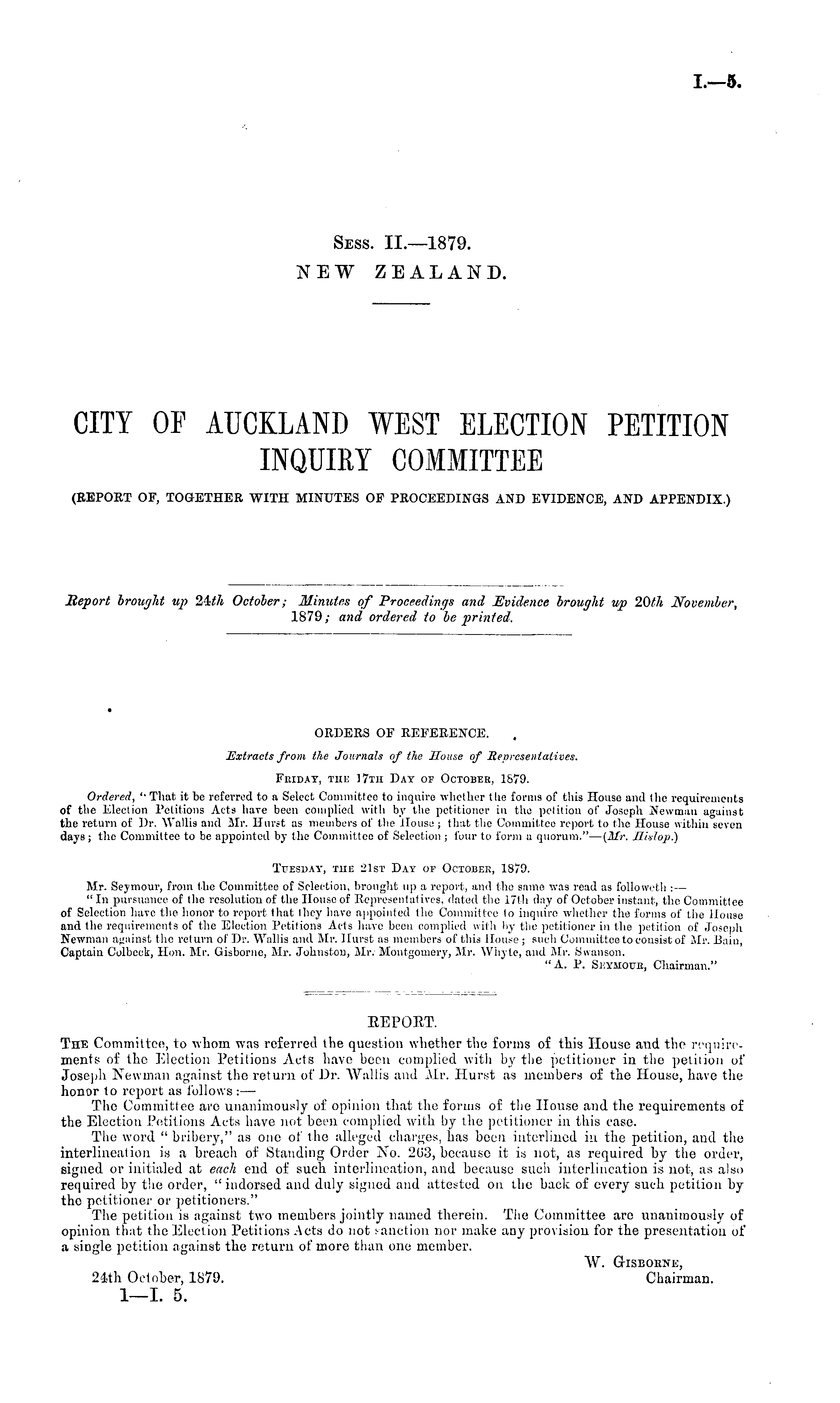 ORDERS OF REFERENCE. Extracts from the Journals of the House of Representatives. Friday, the 17th Day of October, 1579. Ordered, ''That it be referred to a Select Committee to inquire whether tile forms of this House and the requirements of the Election Petitions Acts have been complied with by the petitioner in the petition of Joseph Newman against the return of Dr. Wallis and Mr. Hurst as members of the House; that the Committeo report to the House within seven days; the Committee to be appointed by the Committee of Selection ; four to form a quorum."— (Mr. Hislop.) Tuesday, the 21st Day op October, 1879. Mr. Seymour, from the Committee of Selection, brought up a report, and the same was read as followetli :— " In pursuance of the resolution of the House of Representatives, dated the 17th day of October instant, the Committee of Selection have the honor to report that they have appointed the Committee to inquire whether the forms of the House and the requirements of the Election Petitions Acts have been complied with by tho petitioner in the petition of Joseph Newman against the return of Dr. Wallis and Mr. Hurst as members of this House ; such Committee to consist of Mr. Bain, Captain Colbcck, Hon. Mr. Gisborne, Mr. Johnston, Mr. Montgomery, Mr. Whyte, and Mr. Swanson. "A. P. Seymour, Chairman."