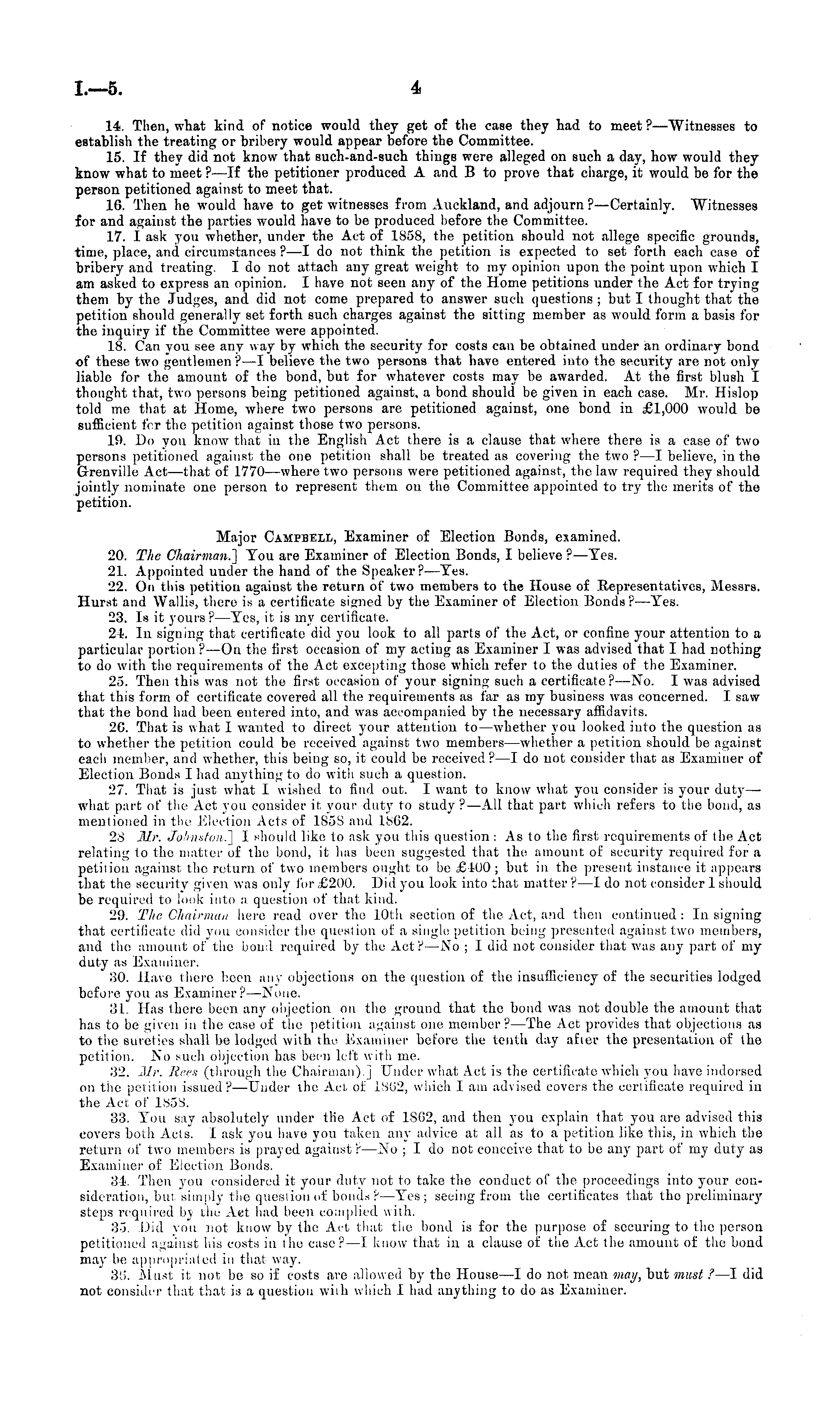 14. Then, what kind of notice would they get of the case they had to meet ?—Witnesses to establish the treating or bribery would appear before the Committee. 15. If they did not know that such-and-such things were alleged on such a day, how would they know what to meet ? —lf the petitioner produced A and B to prove that charge, it would be for the person petitioned against to meet that. 16. Then he would have to get witnesses from Auckland, and adjourn ? —Certainly. Witnesses for and against the parties would have to be produced before the Committee. 17. I ask you whether, under the Act of 1858, the petition should not allege specific grounds, time, place, and circumstances ? —I do not think the petition is expected to set forth each case of bribery and treating. Ido not attach auy great weight to my opinion upon the point upon which I am asked to express an opinion. I have not seen any of the Home petitions under the Act for trying them by the Judges, and did not come prepared to answer such questions ; but I thought that the petition should generally set forth such charges against the sitting member as would form a basis for the inquiry if the Committee were appointed. 18. Can you see any way by which the security for costs can be obtained under an ordinary bond of these two gentlemen?—l believe the two persons that have entered into the security are not only liable for the amount of the bond, but for whatever costs may be awarded. At the first blush I thought that, two persons being petitioned against, a bond should be given in each case. Mr. Hislop told me that at Home, where two persons are petitioned against, one bond in £1,000 would be sufficient for the petition against those two persons. 19. Do you know that in the English Act there is a clause that wdiere there is a ease of two persons petitioned against the one petition shall be treated as covering the two ? —I believe, in the Grenville Act—that of 1770 —where two persons were petitioned against, the law required they should jointly nominate one person to represent them ou the Committee appointed to try the merits of the petition. Major Campbell, Examiner of Election Bonds, examined. 20. The Chairman.] Tou are Examiner of Election Bonds, I believe ?—Tes. 21. Appointed under the hand of the Speaker? —Tes. 22. On this petition agaiust the return of two members to the House of Eepresentatives, Messrs. Hurst and Wallis, there is a certificate signed by the Examiner of Election Bonds? —Tes. 23. Is it yours? —Tes, it is my certificate. 24. In signing that certificate did you look to all parts of the Act, or confine your attention to a particular portion ? —On the first occasion of my acting as Examiner I was advised that I had nothing to do with the requirements of the Act excepting those which refer to the duties of the Examiner. 25. Then this was not the first occasion of your signing such a certificate? —No. I was advised that this form of certificate covered all the requirements as far as my business was concerned. I saw that the bond had been entered into, and was accompanied by the necessary affidavits. 26. That is what I wanted to direct your attention to —whether you looked into the question as to whether the petition could be received against two members—whether a petition should be against each member, and whether, this being so, it could be received? —I do not consider that as Examiner of Election Bonds Iliad anything to do with such a question. 27. That is just what I wished to find out. I want to know what you consider is your duty— what part of the Act you consider it your duty to study ?—All that part which refers to the bond, as mentioned in the Election Acts of 1858 and 1862. 28 Mr. Johnston.] I should like to ask you this question :As to the first requirements of the Act relating to the matter of the bond, it has been suggested that the amount of security required for a petition against the return of two members ought to be £400 ; but in the present instance it appears that the security given was only for £200. Did you look into that matter ? —I do not consider I should be required to look into a question of that kind. 29. The Chairman here read over the 10th section of the Act, and then continued : In signing that certificate did you consider the question of a single petition being presented against two members, and tho amount of the bond required by the Act?—No ; I did not consider that was any part of my duty as Examiner. 30. Have there been any objections on the question of the insufficiency of the securities lodged before you as Examiner? —None. 31. Has ihere been any objection on the ground that the bond was not double the amount that has to be given in the case of tite petition against one member? —The Act provides that objections as to the sureties shall be lodged with tho Examiner before the tenth day after the presentation of Ihe petition. No such objection has been left with me. 32. Mr. Rc.cs (through the Chairman).] Under what Act is the certificate which you have indorsed on tiie petition issued? —Under the Act of 1802, which I am advised covers the certificate required in the Act of 1858. 33. Tou say absolutely under the Act of 1562, and then you explain that you are advised this covers both Acts. I ask you have you taken any advice at all as to a petition like this, in which the return of two members is prayed against?—No ; I do not conceive that to be any part of my duty as Examiner of Election Bonds. 34. Then } rou considered it your duty not to take the conduct of the proceedings into your consideration, bin simply the question of bonds? —Tes; seeing from the certificates that tho preliminary steps required by the Act had been complied with. 35. Did you not know by the Act that the bond is for the purpose of securing to the person petitioned against his costs in the case? —I know that in a clause of the Act the amount of the bond may be appr