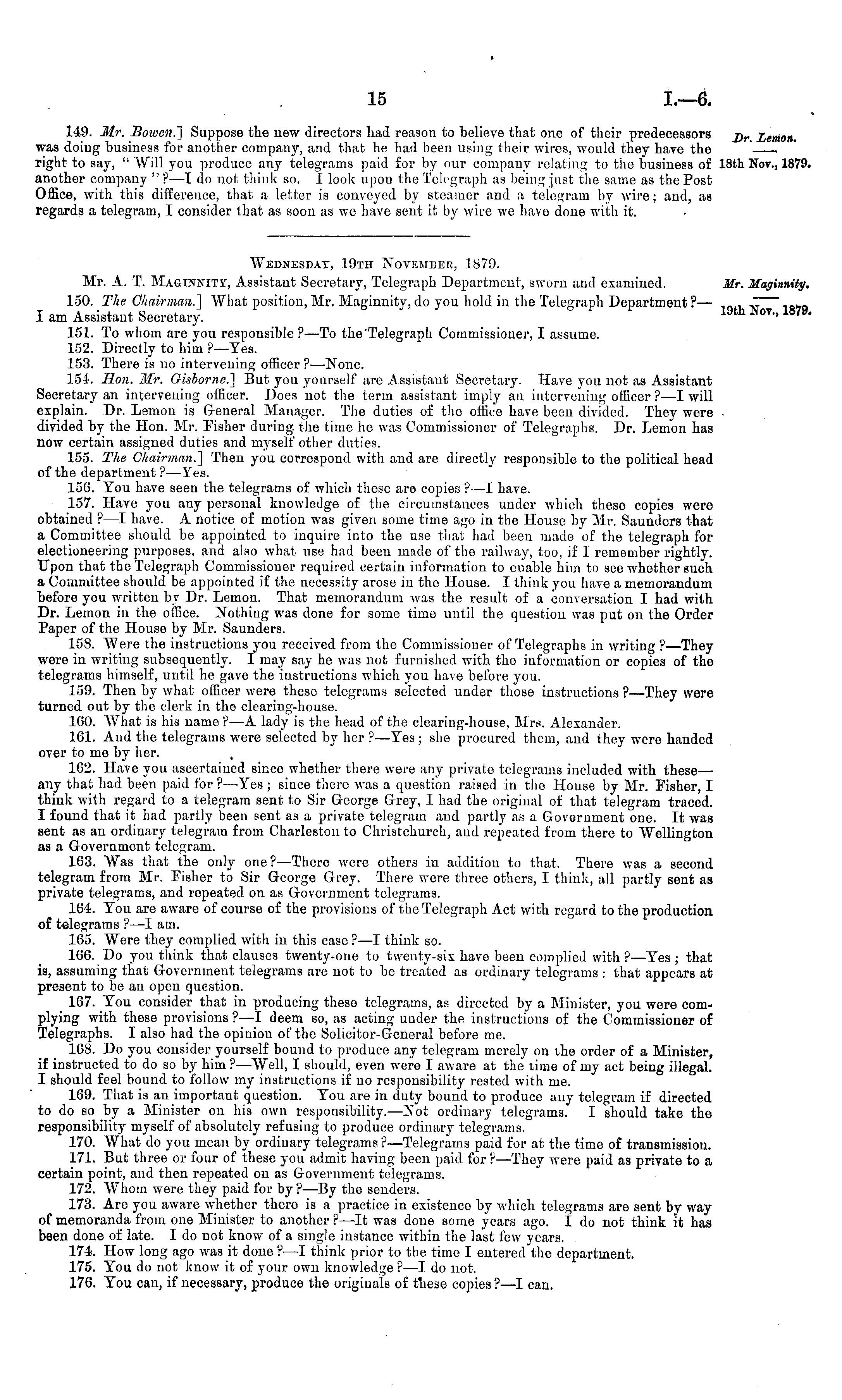 Wednesday, 19th November, 1879. Mr. A. T. Maginnity, Assistant Secretary, Telegraph Dermrtmcnt, sworn and examined. 150. The Chairman.] What position,Mr. Maginnity,do you hold in the Telegraph Department?— I am Assistant Secretary. 151. To whom are you responsible?—To the Telegraph Commissioner, I assume. 152. Directly to him ? —-Tes. 153. There is no intervening officer ? —None. 154. Hon. Mr. Gisborne.] But you yourself arc Assistant Secretary. Have you not as Assistant Secretary an intervening officer. Does not the term assistant imply au intervening officer ?—I will explain. Dr. Lemon is General Manager. The duties of the office have been divided. They were divided by the Hon. Mr. Fisher during, the time he was Commissioner of Telegraphs. Dr. Lemon has now certain assigned duties and myself other duties. 155. The Chairman.] Then you correspoutl with and are directly responsible to the political head of tho department ?—Tes. 156. Tou have seen the telegrams of which these are copies ?—I have. 157. Have you any personal knowledge of the circumstances under which these copies were obtained ? —I have. A notice of motion was given some time ago in the House by Mr. Saunders that a Committee should be appointed to inquire into the use that had been made of the telegraph for electioneering purposes, and also what use had been made of the railway, too, if I remember rightly. Upon that the Telegraph Commissioner required certain information to enable him to see whether such a Committee should be appointed if the necessity arose in the House. I think you have a memorandum before you written by Dr. Lemon. That memorandum was the result of a conversation I had with Dr. Lemon in the office. Nothing was done for some time until the question was put on the Order Paper of the House by Mr. Saunders. 158. Were the instructions you received from the Commissioner of Telegraphs in writing ?—They were in writing subsequently. I may say he was not furnished with the information or copies of the telegrams himself, until he gave the instructions which you have before you. 159. Then by what officer were these telegrams selected under those instructions ?—They were turned out by the clerk in the clearing-house. 160. AVhat is his name ? —A lady is the head of the clearing-house, Mrs. Alexander. 161. And the telegrams were selected by her?—Tes; she procured them, and they were handed over to me by her. , 162. Have you ascertained since whether there were any private telegrams included with these — any that had been paid for ?—Tes ; since there was a question raised in the House by Mr. Fisher, I think with regard to a telegram sent to Sir George Grey, I had the original of that telegram traced. I found that it had partly been sent as a private telegram and partly as a Government one. It was sent as au ordinary telegram from Charleston to Christchurch, and repeated from there to Wellington as a Government telegram. 163. Was that the only one?— There were others in addition to that. There was a second telegram from Mr. Fisher to Sir George Grey. There were three others, I think, all partly sent as private telegrams, and repeated on as Government telegrams. 164. Tou are aware of course of the provisions of the Telegraph Act with regard to the production of telegrams ? —I am. 165. Were they complied with in this case ?—I think so. 166. Do you think that clauses twenty-one to twenty-six have been complied with ?—Tes ; that is, assuming that Government telegrams are not to be treated as ordinary telegrams : that appears at present to be an open question. 167. Tou consider that in producing these telegrams, as directed by a Minister, you were complying with these provisions ? —I deem so, as acting under the instructions of the Commissioner of Telegraphs. I also had the opinion of the Solicitor-General before me. 168. Do you consider yourself bound to produce any telegram merely on the order of a Minister, if instructed to do so by him ?—Well, I should, even were I aware at the time of my act being illegal. I should feel bound to follow my instructions if no responsibility rested with me. 169. That is an important question. Tou are in duty bound to produce any telegram if directed to do so by a Minister on his own responsibility.—Not ordinary telegrams. I should take the responsibility myself of absolutely refusing to produce ordinary telegrams. 170. What do you mean by ordinary telegrams ?—Telegrams paid for at the time of transmission. 171. But three or four of these you admit having been paid for ?—They were paid as private to a certain point, and then repeated on as Government telegrams. 172. Whom were they paid for by ? —By the senders. 173. Are you aware whether there is a practice in existence by which telegrams are sent by way of memoranda from one Minister to another ? —lt was done some years ago. I do not think it has been done of late. Ido not know of a single instance within the last few years. 174. How long ago was it done ?—I think prior to the time I entered the department. 175. Tou do not know it of your own knowledge ?—I do not. 176. Tou can, if necessary, produce the originals of t'neso copies ? —I can.