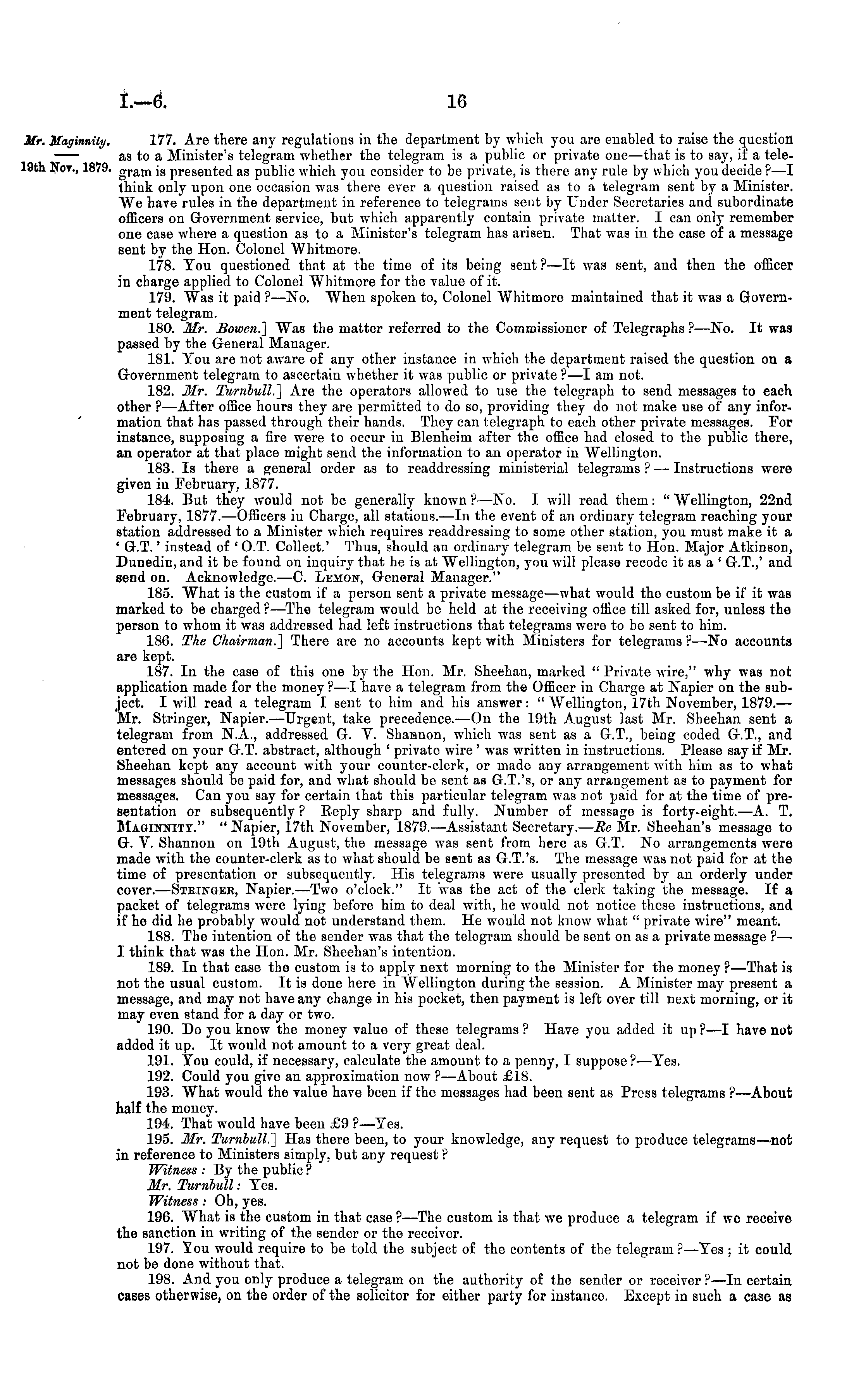 177. Are there any regulations in the department by which you are enabled to raise the question as to a Minister's telegram whether the telegram is a public or private one —that is to say, if a telegram is presented as public which you consider to be private, is there any rule by which you decide ? —I thiuk only upon one occasion was there ever a question raised as to a telegram sent by a Minister. We have rules in the department in reference to telegrams sent by Under Secretaries and subordinate officers on Government service, but which apparently contain private matter. I can only remember one case where a question as to a Minister's telegram has arisen. That was in the case of a message sent by the Hon. Colonel Whitmore. 178. Tou questioned that at the time of its being sent?—lt was sent, and then the officer in charge applied to Colonel Whitmore for the value of it. 179. Was it paid ?—No. When spoken to, Colonel Whitmore maintained that it was a Government telegram. 180. Mr. Bowen.] Was the matter referred to the Commissioner of Telegraphs ? —No. It was passed by the General Manager. 181. Tou are not aware of any other instance in which the department raised the question on a Government telegram to ascertain whether it was public or private ?—I am not. 182. Mr. Turnbull,] Are the operators allowed to use the telegraph to send messages to each other ? —After office hours they are permitted to do so, providing they do not make use of any information that has passed through their hands. They can telegraph to each other private messages. For instance, supposing a fire were to occur in Blenheim after the office had closed to the public there, an operator at that place might send the information to an operator in Wellington. 183. Is there a general order as to readdressing ministerial telegrams? — Instructions were given iv February, 1877. 184. But they would not be generally known ?—No. I will read them: " AVellington, 22nd February, 1877. —Officers in Charge, all stations.—ln the event of an ordinary telegram reaching your station addressed to a Minister which requires readdressing to some other station, you must make it a ' G.T. instead of ' O.T. Collect.' Thus, should an ordinary telegram be sent to Hon. Major Atkinson, Dunedin, and it be found on inquiry that he is at Wellington, you will please recode it as a ' G.T.,' and send on. Acknowledge.—C. Lemon, General Manager." 185. What is the custom if a person sent a private message —what would the custom be if it was marked to be charged ?—The telegram would be held at the receiving office till asked for, unless the person to whom it was addressed had left instructions that telegrams were to be sent to him. 186. The Chairman.] There are no accounts kept with Ministers for telegrams ? —No accounts are kept. 187. In the case of this one by the Hon. Mr. Sheehan, marked " Private wire," why w-as not application made for the money ? —I have a telegram from the Officer in Charge at Napier on the subject. I will read a telegram I sent to him and his answer: "AVellington, 17th November, 1879. — Mr. Stringer, Napier. —Urgent, take precedence.- —On the 19th August last Mr. Sheehan sent a telegram from N.A., addressed G. V. Shannon, which was sent as a G.T., being coded G.T., and entered on your G.T. abstract, although ' private wire' was written in instructions. Please say if Mr. Sheehan kept any account with your counter-clerk, or made any arrangement with him as to what messages should be paid for, and what should be sent as G.T.s, or any arrangement as to payment for messages. Can you say for certain that this particular telegram was not paid for at the time of presentation or subsequently ? Reply sharp and fully. Number of message is forty-eight.—A. T. Maginnity." " Napier, 17th November, 1879. —Assistant Secretary. — Re Mr. Sheehan's message to G. A*. Shannon on 19th August, the message was sent from here as G.T. No arrangements were made with the counter-clerk as to what should be sent as G.T.'s. The message was not paid for at the time of presentation or subsequently. His telegrams were usually presented by an orderly under cover. —Steingee, Napier. —Two o'clock." It was the act of the clerk taking the message. If a packet of telegrams were lying before him to deal with, he would not notice these instructions, and if he did he probably would not understand them. He would not know what " private wire" meant. 188. The intention of the sender was that the telegram should be sent on as a private message ?— I think that was the Hon. Mr. Sheehan's intention. 189. In that case the custom is to apply next morning to the Minister for the money ?—That is not the usual custom. It is done here in AVellington during the session. A Minister may present a message, and may not have auy change in his pocket, then payment is left over till next morning, or it may even stand for a day or two. 190. Do you know the money value of these telegrams ? Have you added it up ?—I have not added it up. It would not amount to a very great deal. 191. Tou could, if necessary, calculate the amount to a penny, I suppose ?—Tes. 192. Could you give an approximation now ? —About £18. 193. What would the value have been if the messages had been sent as Press telegrams ? —About half the money. 194. That would have been £9 ?—Tes. 195. Mr. Turnbull.] Has there been, to your knowledge, any request to produce telegrams—not in reference to Ministers simply, but any request ? Witness : By the public ? Mr. Turnbull: Tes. Witness: Oh, yes. 196. What is the custom in that case ?—The custom is that we produce a telegram if we receive the sanction in writing of the sender or the receiver. 197. l'ou would require to be told the subject of the contents of the telegram?—Tes ; it could not be done without that. 198. And you only produce a telegram on the authority of the sender or receiver ?—ln certain cases otherwise, on 