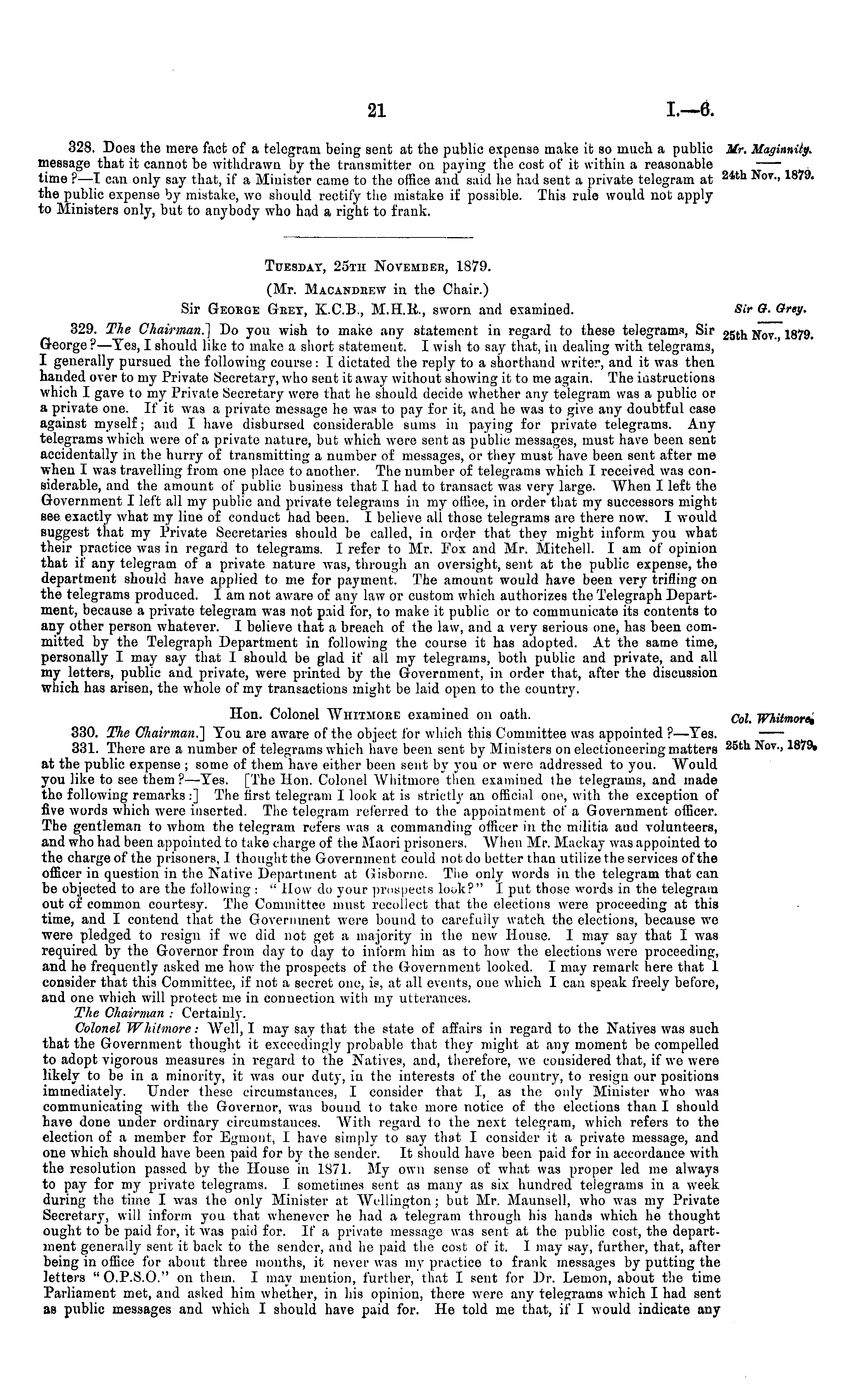 Tuesday, 25th November, 1879. (Mr. Macandeew in the Chair.) Sir Geobge Geey, X.C.8., M.H.R., sworn aud examined. 329. The Chairman] Do you wish to make any statement in regard to these telegrams, Sir , George ?—Tes, I should like to make a short statement. I wish to say that, in dealing with telegrams, I generally pursued the following course: I dictated the reply to a shorthand write;-, and it was then handed over to my Private Secretary, who sent it away without showing it to me again. The instructions which I gave to my Private Secretary wore that ho should decide wdiether any telegram was a public or a private one. If it was a private message he was to pay for it, and he was to give any doubtful case against myself; aud I have disbursed considerable sums in paying for private telegrams. Any telegrams which wore of a private nature, but which were sent as public messages, must have been sent accidentally in the hurry of transmitting a number of messages, or they must have been sent after me wheu I was travelling from one place to another. The number of telegrams which I received was considerable, and the amount of public business that I had to transact was very large. AVhen I left the Government I left all my public and private telegrams iv my office, in order that my successors might see exactly what my Hue of conduct had been. I believe all those telegrams are there now. I would suggest that my Private Secretaries should be called, in order that they might inform you what their practice was in regard to telegrams. I refer to Mr. Fox and Mr. Mitchell. I am of opinion that if any telegram of a private nature was, through an oversight, sent at the public expense, the department should have applied to me for payment. The amount would have been very trifling on the telegrams produced. lam not aware of any law or custom which authorizes the Telegraph Department, because a private telegram was not paid for, to make it public or to communicate its contents to any other person whatever. I believe that a breach of the law, and a very serious one, has been committed by the Telegraph Department in following the course it has adopted. At the same time, personally I may say that I should be glad if all my telegrams, both public and private, and all my letters, public and private, were printed by the Government, in order that, after the discussion which has arisen, the whole of my transactions might be laid open to the country. Hon. Colonel AVhitmoee examined on oath. 330. The Chairman] Tou are aware of the object for which this Committee was appointed ?—Tes. 331. There are a number of telegrams which have been sent by Ministers on electioneering matters at the public expense ; some of them have either been sent by you or were addressed to you. AVould you like to see them?—Tes. [The Hon. Colonel AVhitmore then examined the telegrams, and made the following remarks :] The first telegram I look at is strictly an official one, with the exception of five words which were inserted. The telegram referred to the appointment of a Government officer. The gentleman to whom the telegram refers was a commanding officer in the militia aud volunteers, and who had been appointed to take charge of the Maori prisoners. AVhen Mr. Mackay was appointed to the charge of the prisoners, 1 thought the Government could not do better than utilize the services of the officer in question in the Native Department at (iisborne. The only words in the telegram that can be objected to are the following : " Sow do your prospects look?" I put those words in the telegram out of common courtesy. The Committee must recollect that the elections were proceeding at this time, and I contend that the Government were bound to carefully watch the elections, because we wero pledged to resign if we did not get a majority in the new House. 1 may say that I was required by the Governor from day to day to inform him as to how the elections were proceeding, and ho frequently asked me how the prospects of the Government looked. I may remark here that 1 consider that this Committee, if not a secret one, is, at all events, one which I can sjieak freely before, and one which will protect me in connection with my utterances. The Chairman .- Certainly. Colonel Whitmore: Well, I may say that the state of affairs in regard to the Natives was such that the Government thought it exceedingly probable that they might at any moment be compelled to adopt vigorous measures in regard to the Natives, and, therefore, we considered that, if we were likely to be in a minority, it was our duty, iv the interests of the country, to resign our positions immediately. Under these circumstances, I consider that I, as the only Minister who was communicating with the Governor, was bound to take more notice of the elections than I should have done under ordinary circumstances. AVith regard to the next telegram, which refers to the election of a member for Egmont, I have simply to say that I consider it a private message, and one which should have been paid for by the sender. It should have been paid for in accordance with the resolution passed by the House in 1871. My own sense of what was proper led me always to pay for my private telegrams. I sometimes sent as many as six hundred telegrams in a week during the time I was the only Minister at AVellington; but Mr. Maunsell, who was my Private Secretary', will inform you that whenever he had a telegram through his hands which he thought ought to be paid for, it was paid for. If a private message was sent at the public cost, the department generally sent it back to the sender, and he paid the cost of it. I may say, further, that, after being in office for about three months, it never was my practice to frank messages by putting the letters "0.P.5.0." on them. I may mention, further, that I sent for Dr. Lemon, about the time Parliament met, and asked him whether, in his opinion, there wero any telegrams which I had sent as 