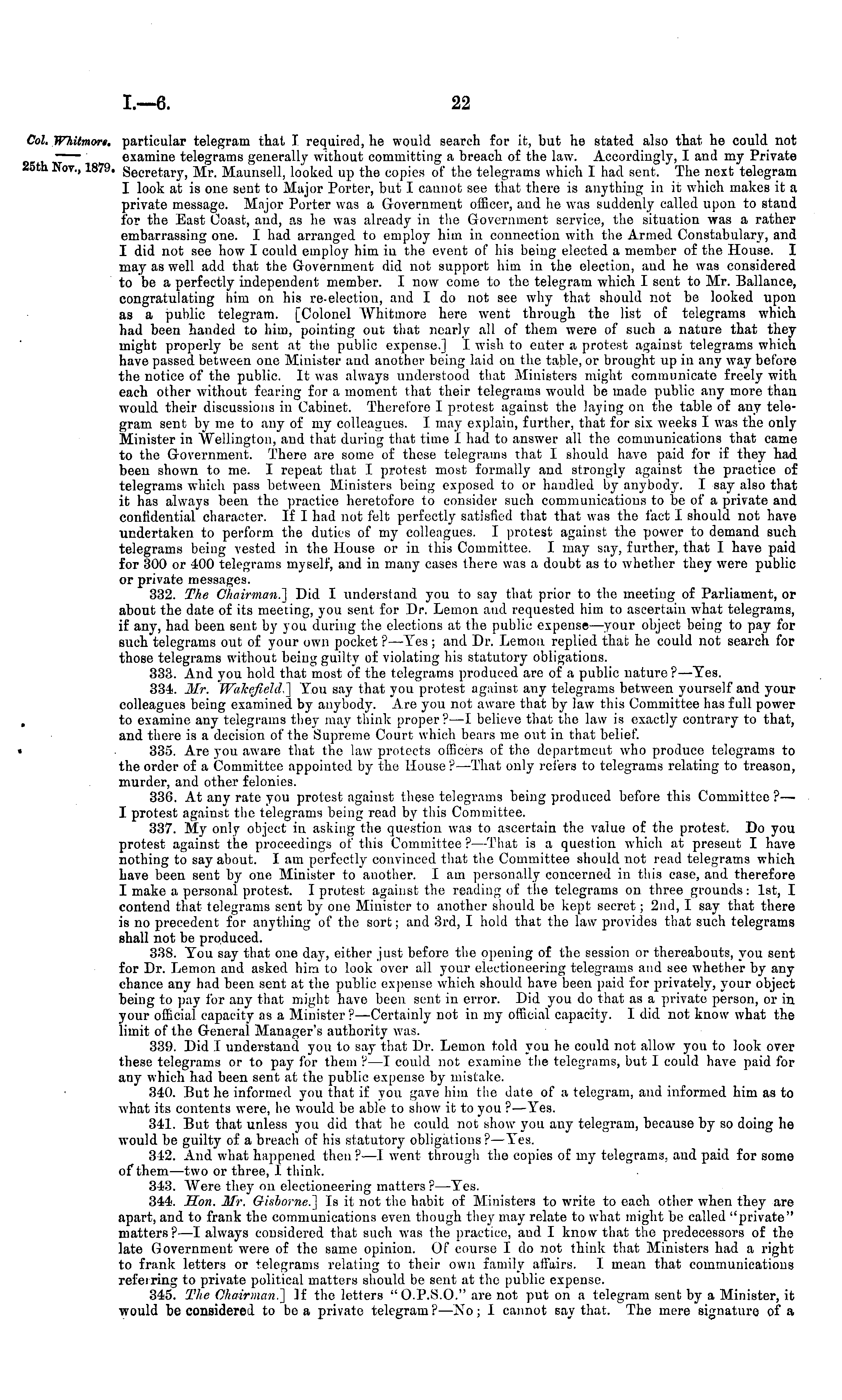 particular telegram that I required, he would search for it, but he stated also that he could not examine telegrams generally without committing a breach of the law. Accordingly, I and my Private Secretary, Mr. Maunsell, looked up the copies of the telegrams which I had sent. The next telegram I look at is one sent to Major Porter, but I cannot see that there is anything in it which makes it a private message. Major Porter was a Government officer, aud he was suddenly called upon to stand for the East Coast, and, as ho was already in the Government service, the situation was a rather embarrassing one. I had arranged to employ him in connection with the Armed Constabulary, and I did not see how I could employ him in the event of his being elected a member of the House. I may as well add that the Government did not support him in the election, and he was considered to be a perfectly independent member. I now come to the telegram which I sent to Mr. Ballance, congratulating him on his re-election, and I do not see wdiy that should not be looked upon as a public telegram. [Colonel AVhitmore here went through the list of telegrams which had been handed to him, pointing out that nearly all of them were of such a nature that they might properly be sent at the public expense.] I wish to enter a protest against telegrams wdiich have passed between one Minister and another being laid on the table, or brought up in any way before the notice of the public. It was always understood that Ministers might communicate freely with each other without fearing for a moment that their telegrams would be made public any more thati would their discussions in Cabinet. Therefore I protest against the laying on the table of any telegram sent by me to any of my colleagues. I may explain, further, that for six weeks I was the only Minister in AVellington, aud that during that time I had to answer all the communications that came to the Government. There are some of these telegrams that I should have paid for if they had been shown to me. I repeat that I protest most formally and strongly against the practice of telegrams which pass between Ministers being exposed to or handled by anybody. I say also that it has always been the practice heretofore to consider such communications to be of a private and confidential character. If I had not felt perfectly satisfied that that was tho fact I should not have undertaken to perform the duties of my colleagues. I protest against the power to demand such telegrams being vested in the House or in this Committee. I may say, further, that I have paid for 300 or 400 telegrams myself, and in many cases there was a doubt as to whether they were public or private messages. 332. The Chairman] Did I understand you to say that prior to the meeting of Parliament, or about the date of its meeting, you sent for Dr. Lemon and requested him to ascertain what telegrams, if any, had been sent by you during the elections at the public expense —your object being to pay for such telegrams out of your own pocket ? —Tes ; and Dr. Lemon replied that he could not search for those telegrams without being guilty of violating his statutory obligations. 333. And you hold that most of the telegrams produced are of a public nature ? —Tes. 334. Mr. Wakefield] Tou say that you protest against any telegrams between yourself and your colleagues being examined by anybody. Are you not aware that by law this Committee has full power to examine any telegrams they may think proper? —I believe that the law is exactly contrary to that, and there is a decision of the Supreme Court which bears me out in that belief. 335. Are you aware that the law protects officers of the department who produce telegrams to the order of a Committee appointed by the House? —That only refers to telegrams relating to treason, murder, and other felonies. 336. At any rate you protest against these telegrams being produced before this Committee ?— I protest against the telegrams being read by this Committee. 337. My only object in asking the question was to ascertain the value of the protest. Do you protest against the proceedings of this Committee? —That is a question which at present I have nothing to say about. lam perfectly convinced that the Committee should not read telegrams which have been sent by one Minister to another. I am personally concerned in this case, and therefore I make a personal protest. I protest against the reading of the telegrams on three grounds: Ist, I contend that telegrams sent by one Minister to another should be kept secret; 2nd, I say that there is no precedent for anything of the sort; and 3rd, I hold that the law provides that such telegrams shall not be produced. 338. Tou say that one day, either just before the opening of the session or thereabouts, you sent for Dr. Lemon and asked him to look over all your electioneering telegrams aud see whether by any chance any had been sent at the public expense which should have been paid for privately, your object being to pay for any that might have been sent in error. Did you do that as a private person, or in your official capacity as a Minister ? —Certainly not in my official capacity. I did not know what tho limit of the General Manager's authority was. 339. Did I understand you to say that Dr. Lemon told you he could not allow you to look over these telegrams or to pay for them ?—I could not examine the telegrams, but I could have paid for any which had been sent at the public expense by mistake. 340. But he informed you that if you gave him the date of a telegram, and informed him as to what its contents were, he would be able to show it to you ?—Tes. 341. But that unless you did that he could not show you any telegram, because by so doing he would be guilty of a breach of his statutory obligations ?—Tes. 342. And what happened then ?—I went through the copies of my telegrams, aud paid for some of them —two or three, 1 think. 343. A