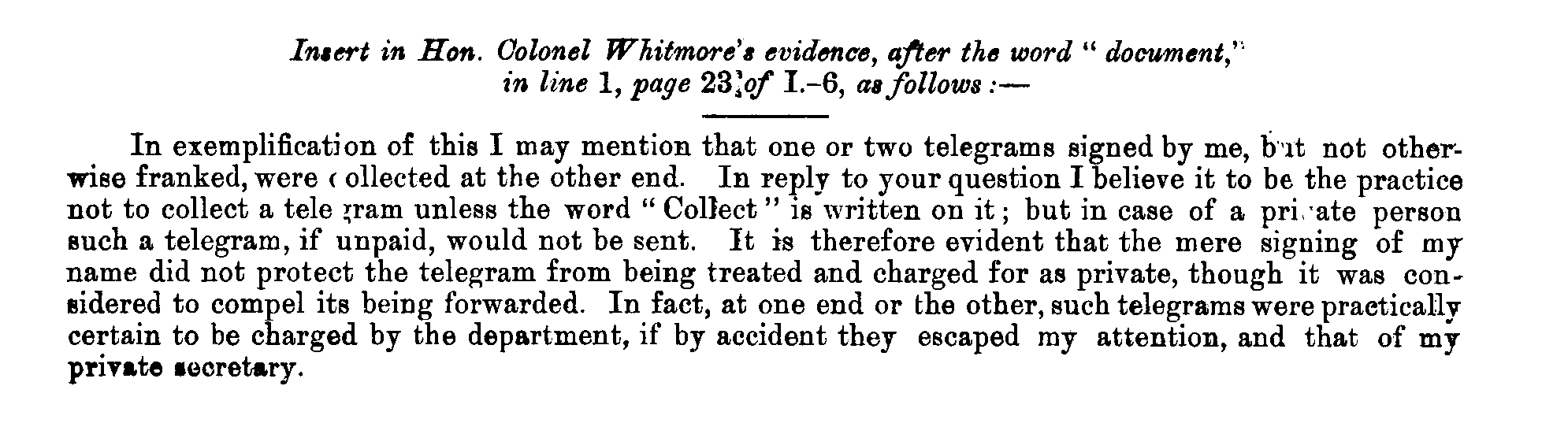 In exemplification of this I may mention that one or two telegrams signed by me, bit not otherwise franked, were ( ollected at the other end. In reply to your question I believe it to be the practice not to collect a tele *ram unless the word " Collect" ig written on it; but in case of a pri/ate person such a telegram, if unpaid, would not be sent. It is therefore evident that the mere signing of my name did not protect the telegram from being treated and charged for as private, though it was considered to compel its being forwarded. In fact, at one end or the other, such telegrams were practically certain to be charged by the department, if by accident they escaped my attention, and that of my private secretary.