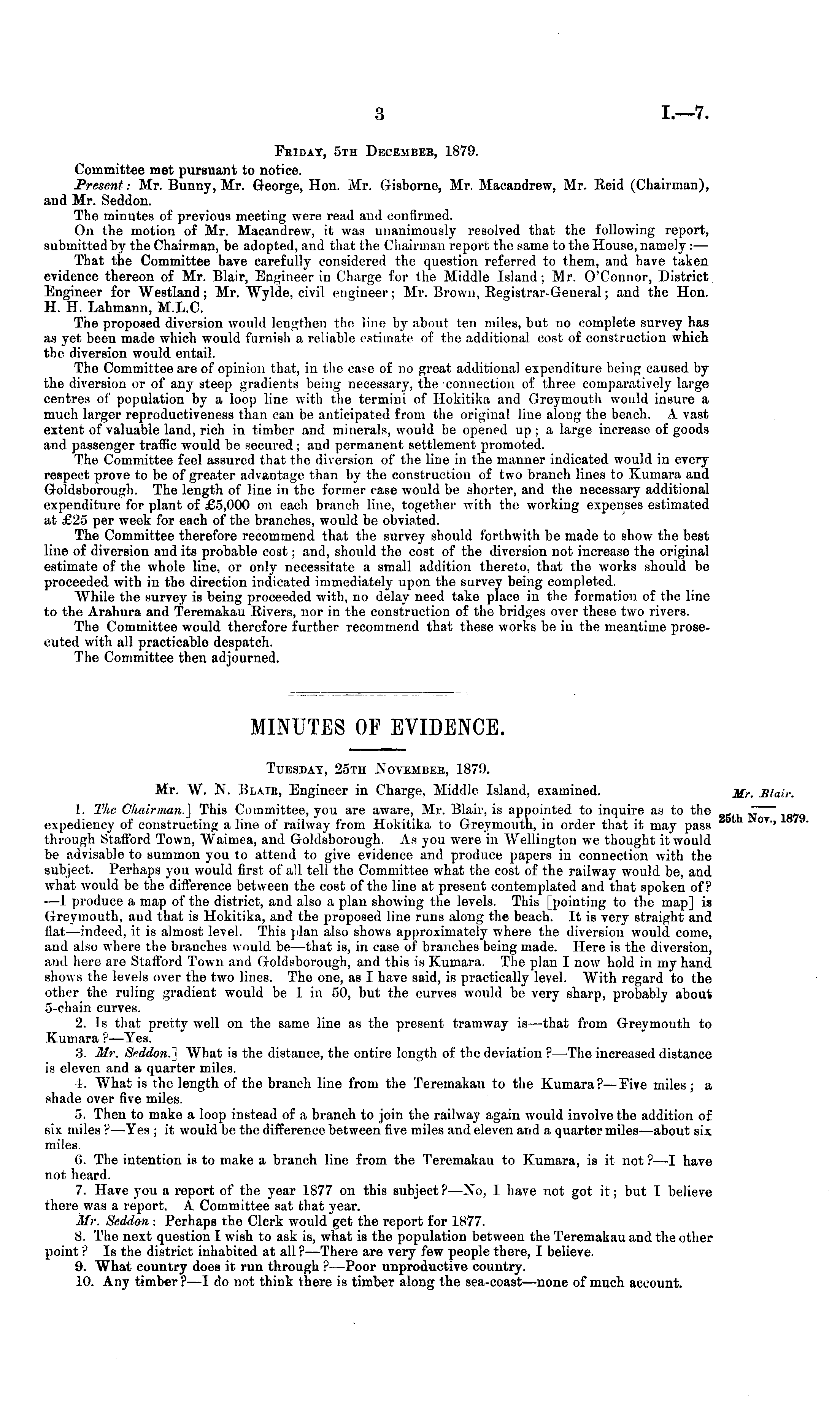 MINUTES OF EVIDENCE. Tuesday, 25th November, 1879. Mr. W. N. Blaib, Engineer in Charge, Middle Island, examined. 1. The Chairman.] This Committee, you are aware, Mr. Blair, is appointed to inquire as to the expediency of constructing a line of railway from Hokitika to Greymouth, in order that it may pass through Stafford Town, Waimea, and Goldsborough. As you were in Wellington we thought it would be advisable to summon you to attend to give evidence and produce papers in connection with the subject. Perhaps you would first of all tell the Committee what the cost of the railway would be, and what would be the difference between the cost ofthe line at present contemplated and that spoken of? —I produce a map of the district, and also a plan showing the levels. This [pointing to the map] is Greymouth, and that is Hokitika, and the proposed line runs along the beach. It is very straight and flat —indeed, it is almost level. This plan also shows approximately where the diversion would come, and also where the branches would be —that is, in case of branches being made. Here is the diversion, and here are Stafford Town and Goldsborough, and this is Kumara. The plan I now hold in my hand shows the levels over the two lines. The one, as I have said, is practically level. With regard to the other the ruling gradient would be 1 in 50, but the curves would be very sharp, probably about 5-ehain curves. 2. Is that pretty well on the same line as the present tramway is—that from Greymouth to Kumara 'r —Yes. 3. Mr. Seddon.] What is the distance, the entire length of the deviation ?—The increased distance is eleven and a quarter miles. 1. What is tho length of the branch line from the Teremakau to the Kumara? —Five miles ; a shade over five miles. 5. Then to make a loop instead of a branch to join the railway again would involve the addition of six miles ?—-Yes ; it would be the difference between five miles and eleven and a quarter miles —about six miles. 6. The intention is to make a branch line from the Teremakau to Kumara, is it not ?—I have not heard. 7. Have you a report of the year 1877 on this subject?-—No, I have not got it; but I believe there was a report. A Committee sat that year. Mr. Seddon : Perhaps the Clerk would get the report for 1877. S. The next question I wish to ask is, what is the population between the Teremakau and the other point ? Is the district inhabited at all ? —There are very few people there, I believe. 9. What country does it run through ?—Poor unproductive couutry. 10. Any timber ? —I do not think there is timber along the sea-coast —none of much account.