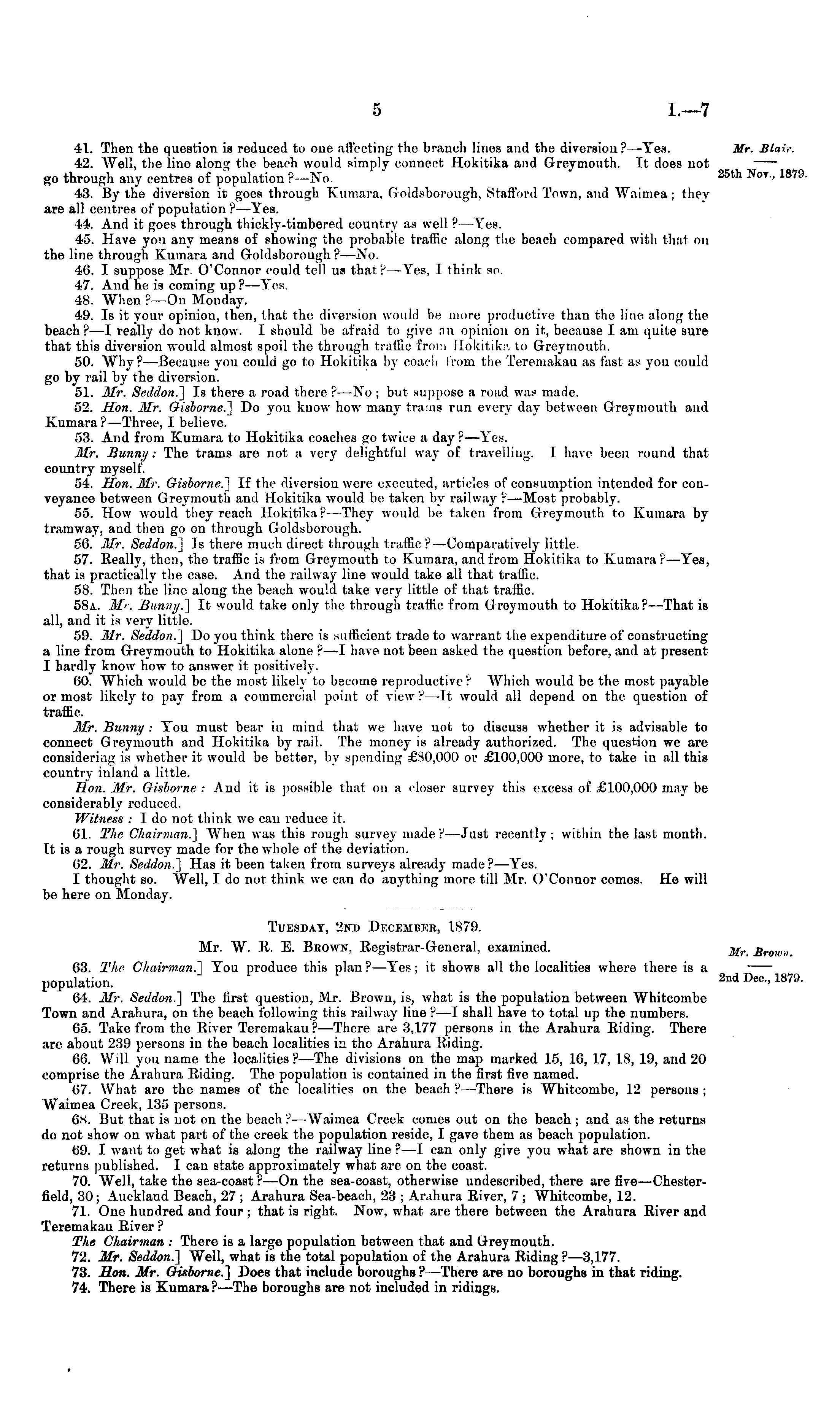 41. Then the question is reduced to one affecting the branch lines aud the diversion? —-Yes. 42. Well, the line along the beach would simply connect Hokitika and Greymouth. Tt does not go through any centres of population ? —No. 43. By the diversion it goes through Kumara. Goldsborough, Stafford Town, and Waimea; they are all centres of population ?—Yes. 44. And it goes through thickly-timbered country as well ?—Yes. 45. Have you any means of showing the probable traffic along the beach compared with that on the line through Kumara and Goldsborough? —No. 46. I suppose Mr O'Connor could tell us that?— Yes, I think so. 47. And he is coming up?— Yes 48. When ?—On Monday. 49. Is it your opinion, then, that the diversion would be more productive than the line along the beach? —I really do not know. I should be afraid to give an opinion on it, because lam quite sure that this diversion would almost spoil the through traffic from Bokitika to Greymouth. 50. Why?— Because you could go to Hokitika by coach from the Teremakau as fast as you could go by rail by the diversion. 51. Mr. Seddon.] Is there a road there ?—No ; but suppose a road was made. 52. Hon. Mr. Gisborne.] Do you know how many trams run every day between Greymouth and Kumara? —Three, I believe. 53. And from Kumara to Hokitika coaches go twice a day ?—Yes. ______ Bunny: The trams are not a very delightful way of travelling. I have been round that country myself. 54. Hon. Mr. Gisborne.] If the diversion were executed, articles of consumption intended for conveyance between Greymouth aud Hokitika would be taken by railway ?—Most probably. 55. How would they reach Hokitika?—They would be taken from Greymouth to Kumara by tramway, and then go on through Goldsborough. 56. Mr. Seddon.] Is there much direct through traffic ? —Comparatively little. 57. Eeally, then, the traffic is from Greymouth to Kumara, and from Hokitika to Kumara?—Yes, that is practically the case. And the railway line would take all that traffic. 58. Then the line along the beach would take very little of that traffic. 58a. Mr. Bunny.] It would take only the througii traffic from Greymouth to Hokitika? —That is all, and it is very little. 59. Mr. Seddon.] Do you think there is sufficient trade to warrant the expenditure of constructing a line from Greymouth to Hokitika alone ? —I have not been asked the question before, and at present I hardly know how to answer it positively. 60. Which would be the most likely to become reproductive? Which would be the most payable or most likely to pay from a commercial point of view?—-It would all depend on the question of traffic. Mr. Bunny : You must bear in mind that we have not to discuss whether it is advisable to connect Greymouth and Hokitika by rail. The money is already authorized. The question we are considering is whether it would be better, by spending £80,000 or £100,000 more, to take in all this country inland a little. Hon. Mr. Gisborne : And it is possible that ou a closer survey this excess of £100,000 may be considerably reduced. Witness : I do not think we can reduce it. 61. The Chairman.] When was this rough survey made? —Just recently; within the last month. It is a rough survey made for the whole of the deviation. 62. Mr. Seddon.] Has it been taken from surveys already made? —Yes. I thought so. Well, Ido not think we can do anything more till Mr. O'Connor comes. He will be here on Monday. Tuesday, 2nd December, 1579. Mr. W. E. E. Brown, Eegistrar-General, examined. 63. The Chairman.] You produce this plan? —Yes; it shows a'l the localities where there is a population. 64. Mr. Seddon.] The first question, Mr. Brown, is, what is the population between Whitcoinbe Town and Arahura, on the beach following this railway line ? —I shall have to total up the numbers. 65. Take from the Eiver Teremakau ? —There are 3,177 persons in the Arahura Biding. There are about 239 persons in the beach localities in the Arahura Riding. 66. Will you name the localities? —The divisions on the map marked 15, 16, 17, 18, 19, and 20 comprise the Arahura Biding. The population is contained in the first five named. 67. What are the names of the localities on the beach ?—There is Whitcombe, 12 persons ; Waimea Creek, 135 persons. 6S. But that is not on the beach ? —Waimea Creek comes out on the beach ; and as the returns do not show on what part of the creek the population reside, I gave them as beach population. 69. I want to get what is along the railway line ? —I can only give you what are shown in the returns published. I can state approximately what are on the coast. 70. Well, take the sea-coast ? —On the sea-coast, otherwise undescribed, there are five —Chesterfield, 30; Auckland Beach, 27 ; Arahura Sea-beach, 23 ; Arahura Eiver, 7 ; Whitcombe, 12. 71. One hundred and four ; that is right. Now, what are there between the Arahura Eiver and Teremakau Eiver? The Chairman : There is a large population between that and Greymouth. 72. Mr. Seddon.] Well, what is the total population of the Arahura Eiding?—3,l77. 73. Hon. Mr. Gisborne.] Does that include boroughs ? —There are no boroughs in that riding. 74. There is Kumara ? —The boroughs are not included in ridings.