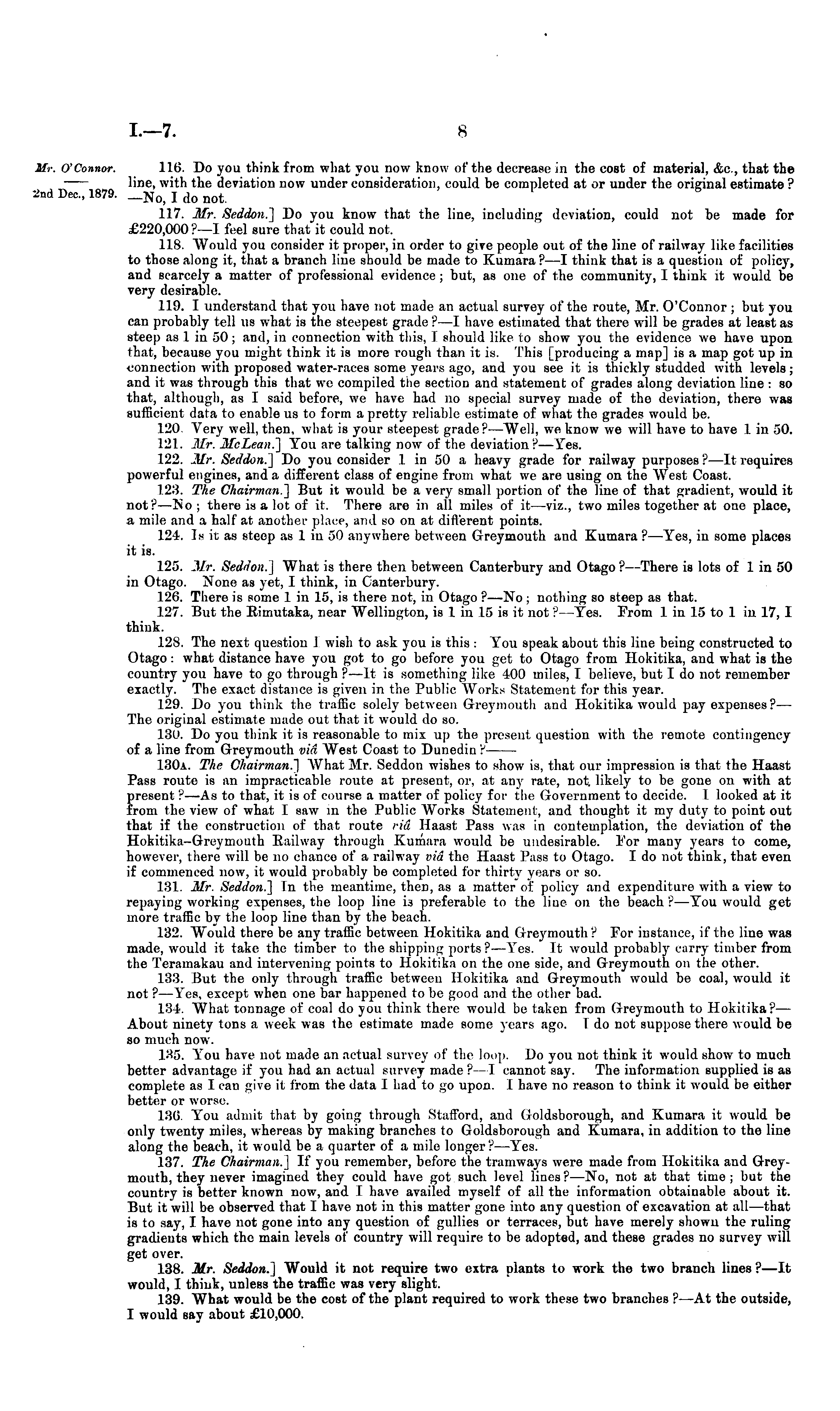 116. Do you think from what you now know ofthe decrease in the cost of material, &c, that the line, with the deviation now under consideration, could be completed at or under the original estimate ? —No, I do not. 117. Mr. Seddon.] Do you know that the line, including deviation, could not be made for £220,000?— I feel sure that it could not. 118. Would you consider it proper, in order to give people out of the line of railway like facilities to those along it, that a branch line should be made to Kumara ?—I think that is a question of policy, and scarcely a matter of professional evidence ; but, as one of the community, 1 think it would be very desirable. 119. I understand that you have not made an actual survey ofthe route, Mr. O'Connor; but you can probably tell us what is the steepest grade ?—I have estimated that there w-ill be grades at least as steep as lin 50; and, in connection with this, 1 should like to show you the evidence we have upon that, because you might think it is more rough than it is. This [producing a map] is a map got up in connection with proposed water-races some years ago, and you see it is thickly studded with levels; and it was through this that we compiled the section and statement of grades along deviation line : so that, although, as I said before, we have had no special survey made of the deviation, there was sufficient data to enable us to form a pretty reliable estimate of what the grades would be. 120 Very well, then, what is your steepest grade? —Well, we know we will have to have 1 in 50. 121. Mr. McLean.] You are talking now of the deviation?— Yes. 122. Mr. Seddon.] Do you consider 1 in 50 a heavy grade for railway purposes ? —lt requires powerful engines, and a different class of engine from what we are using on the West Coast. 123. The Chairman.] But it would be a very small portion of the line of that gradient, would it not?—No ; there is a lot of it. There are in all miles of it—viz., two miles together at one place, a mile and a half at another place, anil so on at different points. 124. Is it as steep as 1 in 50 anywhere between Greymouth and Kumara ? —Y"es, in some places it is. 125. Mr. Seddon.] What is there then between Canterbury and Otago ?—There is lots of 1 in 50 in Otago. None as yet, I think, in Canterbury. 126. There is some 1 in 15, is there not, in Otago ?—No ; nothing so steep as that. 127. But the Eimutaka, near Wellington, is linlsis it not ?-~Yes. From linls to 1 in 17, I think. 128. The next question 1 wish to ask you is this : You speak about this line being constructed to Otago: what distance have you got to go before you get to Otago from Hokitika, aud what is tho country you have to go through ?—lt is something like 400 miles, I believe, but I do not remember exactly. The exact distance is given in the Public. Works Statement for this year. 129. Do you think the traffic solely between Greymouth and Hokitika would pay expenses? — The original estimate made out that it would do so. 130. Do you think it is reasonable to mix up the present question with the remote contingency of a line from Greymouth via West Coast to Dunedin ? 130 a. The Chairman.] What Mr. Seddon wishes to show is, that our impression is that the Haast Pass route is an impracticable route at present, or, at any rate, not. likely to be gone on with at present ?—As to that, it is of course a matter of policy for the Government to decide. I looked at it from the view of what I saw in the Public Works Statement, and thought it my duty to point out that if the construction of that route rid Haast Pass was in contemplation, the deviation of the Hokitika-Greymouth Eailway through Kumara would be undesirable. For many years to come, however, there will be no chance of a railway via the Haast Pass to Otago. Ido not think, that even if commenced now, it would probably be completed for thirty years or so. 131. Mr. Seddon.] In the meantime, then, as a matter of policy and expenditure with a view to repaying working expenses, the loop line i 3 preferable to the line on the beach ? —You would get more traffic by the loop line than by the beach. 132. Would there be any traffic between Hokitika and Greymouth ? For instance, if the line was made, would it take the timber to the shipping ports?— Yes. It would probably carry timber from the Teramakau and intervening points to Hokitika on the one side, and Greymouth on the other. 133. But the only through traffic between Hokitika and Greymouth would be coal, would it not ? —Yes, except when one bar happened to be good and the other bad. 134. What tonnage of coal do you think there would be taken from Greymouth to Hokitika? — About ninety tons a week was the estimate made some years ago. Tdo not suppose there would be so much now. 135. You have not made an actual survey of the loop. Do you not think it would show to much better advantage if you had an actual survey made?--1 cannot say. The information supplied is as complete as I can give it from the data 1 had to go upon. I have no reason to think it would be either better or worse. 130. You admit that by going through Stafford, and Goldsborough, and Kumara it would be only twenty miles, whereas by making branches to Goldsborough and Kumara, iv addition to the line along the beach, it would be a quarter of a mile longer? —Yes. 137. The Chairman.] If you remember, before the tramways were made from Hokitika and Greymouth, they never imagined they could have got such level lines ? —No, not at that time ; but the country is better known now, and I have availed myself of all the information obtainable about it. But it will be observed that I have not in this matter gone into any question of excavation at all —that is to say, I have not gone into any question of gullies or terraces, but have merely shown the ruling gradients which the main levels of country will require to be adopted, and these grades no survey will get over. 138. Mr. Sed
