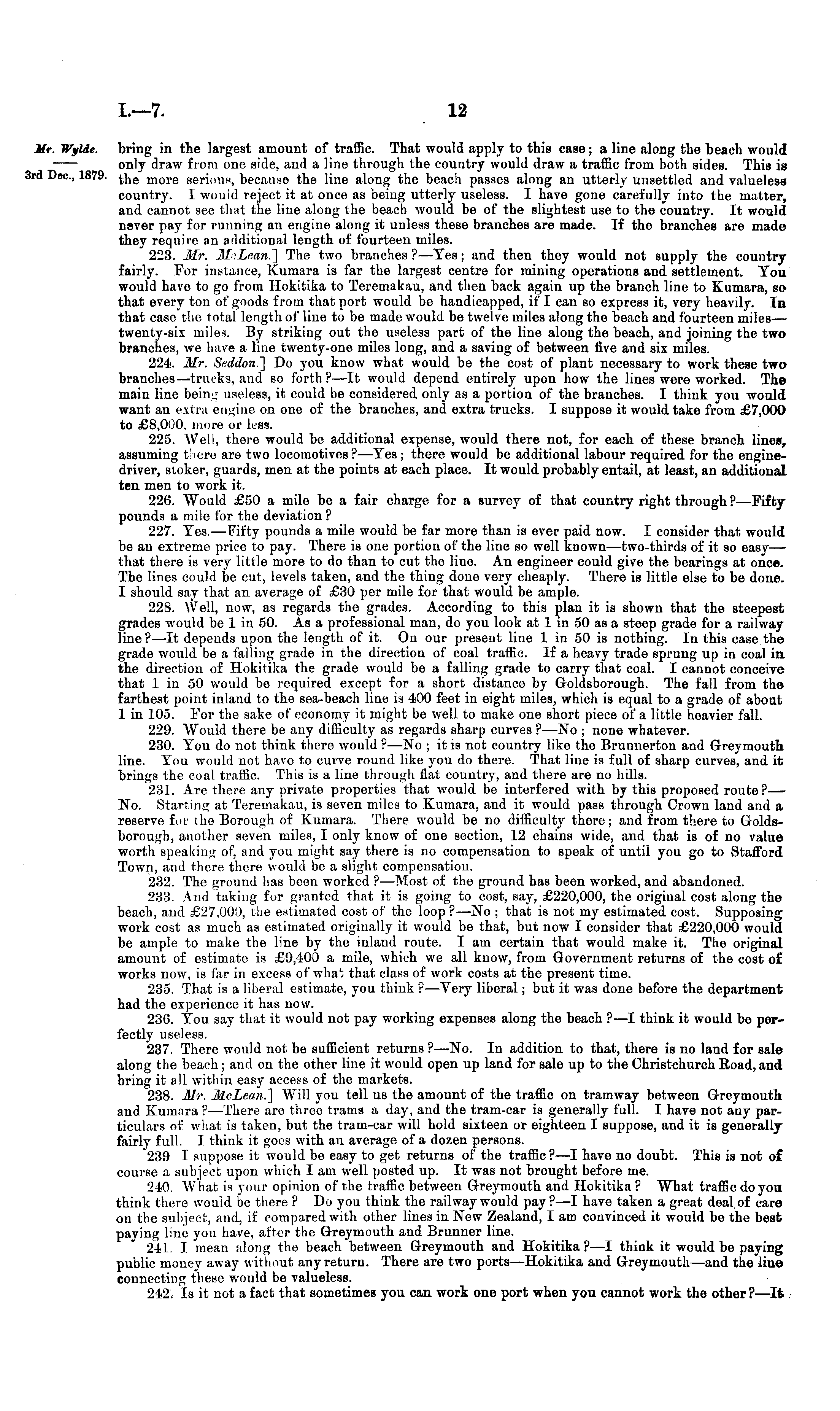 bring in the largest amount of traffic. That would apply to this case; a line along the beach would only draw from one side, and a line through the country would draw a traffic from both sides. This is the more serious, because the line along the beach passes along an utterly unsettled and valueless country. I wouid reject it at once as being utterly useless. I have gone carefully into the matter, and cannot see that the line along the beach would be of the slightest use to the country. It would never pay for running an engine along it unless these branches are made. If the branches are made they require an additional length of fourteen miles. 223. Mr. McLean?] The two branches? —Yes; and then they would not supply the country fairly. For instance, Kumara is far the largest centre for mining operations and settlement. You would have to go from Hokitika to Teremakau, and then back again up the branch line to Kumara, so that every ton of goods from that port would be handicapped, if I can so express it, very heavily. In that case the total length of line to be made would be twelve miles along the beach and fourteen miles — twenty-six miles. By striking out the useless part of the line along the beach, and joining the two branches, we have a line twenty-one miles long, and a saving of between five and six miles. 224. Mr. Seddon.] Do you know what would be the cost of plant necessary to work these two branches—trucks, and so forth? —It would depend entirely upon how the lines were worked. The main line bein,' useless, it could be considered only as a portion of the branches. I think you would want an extra engine on one of the branches, and extra trucks. I suppose it would take from £7,000 to £8,0;'0. more or less. 225. Well, there would be additional expense, would there not, for each of these branch lines, assuming there are two locomotives? —Yes; there would be additional labour required for the enginedriver, stoker, guards, men at the points at each place. It would probably entail, at least, an additional ten men to work it. 226. Would £50 a mile be a fair charge for a survey of that country right through ? —Fifty pounds a mile for the deviation ? 227. Yes.—Fifty pounds a mile would be far more than is ever paid now. I consider that would be an extreme price to pay. There is one portion of the line so well known —two-thirds of it so easy — that there is very little more to do than to cut the line. An engineer could give the bearings at once. The lines could be cut, levels taken, and the thing done very cheaply. There is little else to be done. I should say that an average of £30 per mile for that would be ample. 228. \V rell, now, as regards the grades. According to this plan it is shown that the steepest grades would be lin 50. As a professional man, do you look at linso as a steep grade for a railway line ? —lt depends upon the length of it. On our present line 1 in 50 is nothing. In this case the grade would be a falling grade in the direction of coal traffic. If a heavy trade sprung up in coal in the direction of Hokitika the grade would be a falling grade to carry that coal. I cannot conceive that 1 in 50 would be required except for a short distance by Goldsborough. The fall from the farthest point inland to the sea-beach line is 400 feet in eight miles, which is equal to a grade of about lin 105. For the sake of economy it might be well to make one short piece of a little heavier fall. 229. Would there be any difficulty as regards sharp curves ? —No ; none whatever. 230. You do not think there would ?—No ; it is not country like the Brunnerton and Greymouth line. You would not have to curve round like you do there. That line is full of sharp curves, and it brings the coal traffic. This is a line through flat country, and there are no hills. 231. Are there any private properties that would be interfered with by this proposed route?— No. Starting at Teremakau, is seven miles to Kumara, and it would pass through Crown land and a reserve fir the Borough of Kumara. There would be no difficulty there; and from there to Goldsborough, another seven miles, I only know of one section, 12 chains wide, and that is of no value worth speaking of, and you might say there is no compensation to speak of until you go to Stafford Town, and there there would be a slight compensation. 232. The ground has been worked ? —Most of the ground has been worked, and abandoned. 233. And taking for granted that it is going to cost, say, £220,000, the original cost along the beach, and £27,000, the estimated cost of the loop?—No ; that is not my estimated cost. Supposing work cost as much as estimated originally it would be that, but now I consider that £220,000 would be ample to make the line by the inland route. I am certain that would make it. The original amount of estimate is £9,400 a mile, which we all know, from Government returns of the cost of works now, is far in excess of what that class of work costs at the present time. 235. That is a liberal estimate, you think ? —Very liberal; but it was done before the department had the experience it has now. 230. You say that it would not pay working expenses along the beach ? —I think it would be perfectly useless. 237. There would not be sufficient returns ?—No. In addition to that, there is no land for sale along the beach; and on the other line it would open up land for sale up to the Christchurch Eoad, and bring it all within easy access of the markets. 238. Mr. McLean.] Will you tell us the amount of the traffic on tramway between Greymouth and Kumara ?—There are three trams a day, and the tram-car is generally full. I have not any particulars of what is taken, but the tram-car will hold sixteen or eighteen I suppose, and it is generally fairly full. 1 think it goes with an average ofa dozen persons. 239 I suppose it would be easy to get returns of the traffic? —I have no doubt. This is not of course a subje