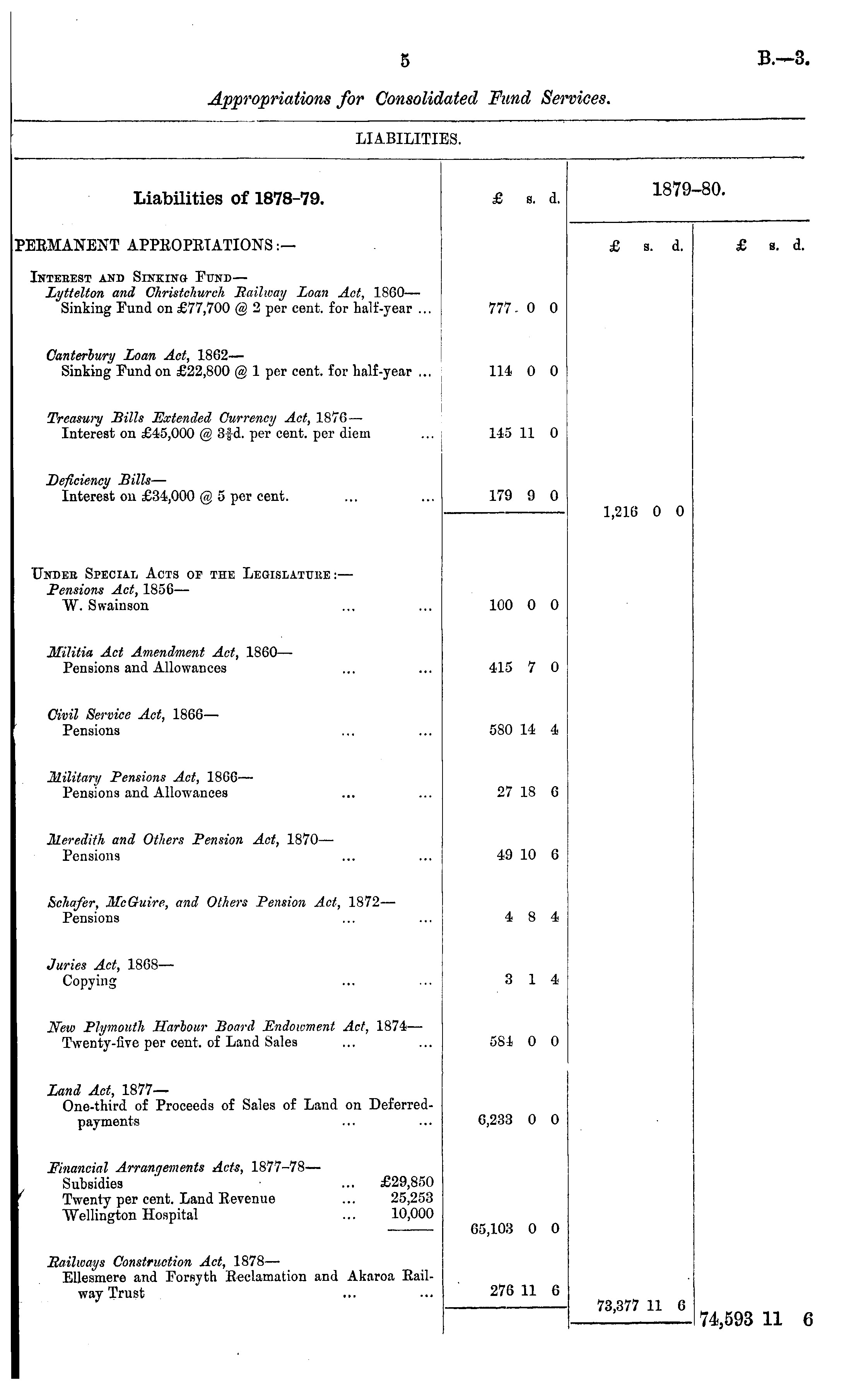 1879-80. Liabilities of 1878-79. £ s. d. 'ERMANENT APPROPRIATIONS :— £ s. d. £ s. d. Interest and Sinking Fund— Lyttelton and Christchurch Hallway Loan Act, I860— Sinking Fund on £77,700 @ 2 per cent, for half-year ... 777. 0 0 * Canterbury Loan Act, 1862— Sinking Fund on £22,800 @ 1 per cent, for half-year ... 114 0 0 Treasury Bills Extended Currency Act, 187G — Interest on £45,000 @ 3fd. per cent, per diem 145 11 0 Deficiency Bills — Interest on £34,000 @ 5 per cent. 179 9 0 1,216 0 0 Undke Special Acts op the Legislative : — Pensions Act, 1856 — ~W. Swaiuson 100 0 0 Militia Act Amendment Act, 18G0 — Pensions and Allowances 415 7 0 Civil Service Act, 1866 — Pensions 580 14 4 Military Pensions Act, 1866— Pensions and Allowances 27 18 6 Meredith and Others Pension Act, 1870 — Pensions 49 10 6 Schafer, McOuire, and Others Pension Act, 1872 — Pensions 4 8 4 Juries Act, 1868— Copying 3 1 4 New Plymouth Harbour Board Endov:ment Act, 1874 — Twenty-five per cent, of Land Sales 584 0 0 Land Act, 1877— One-third of Proceeds of Sales of Land on Deferredpayments 6,288 0 0 Financial Arrangements Acts, 1877-78— Subsidies ... £29,850 Twenty per cent. Land Revenue ... 25,253 Wellington Hospital ... 10,000 65,103 0 0 Mailways Construction Act, 1878 — Ellesmere and Forsyth Reclamation and Akaroa Railway Trust 276 11 6 73,377 11 6 74,593 11
