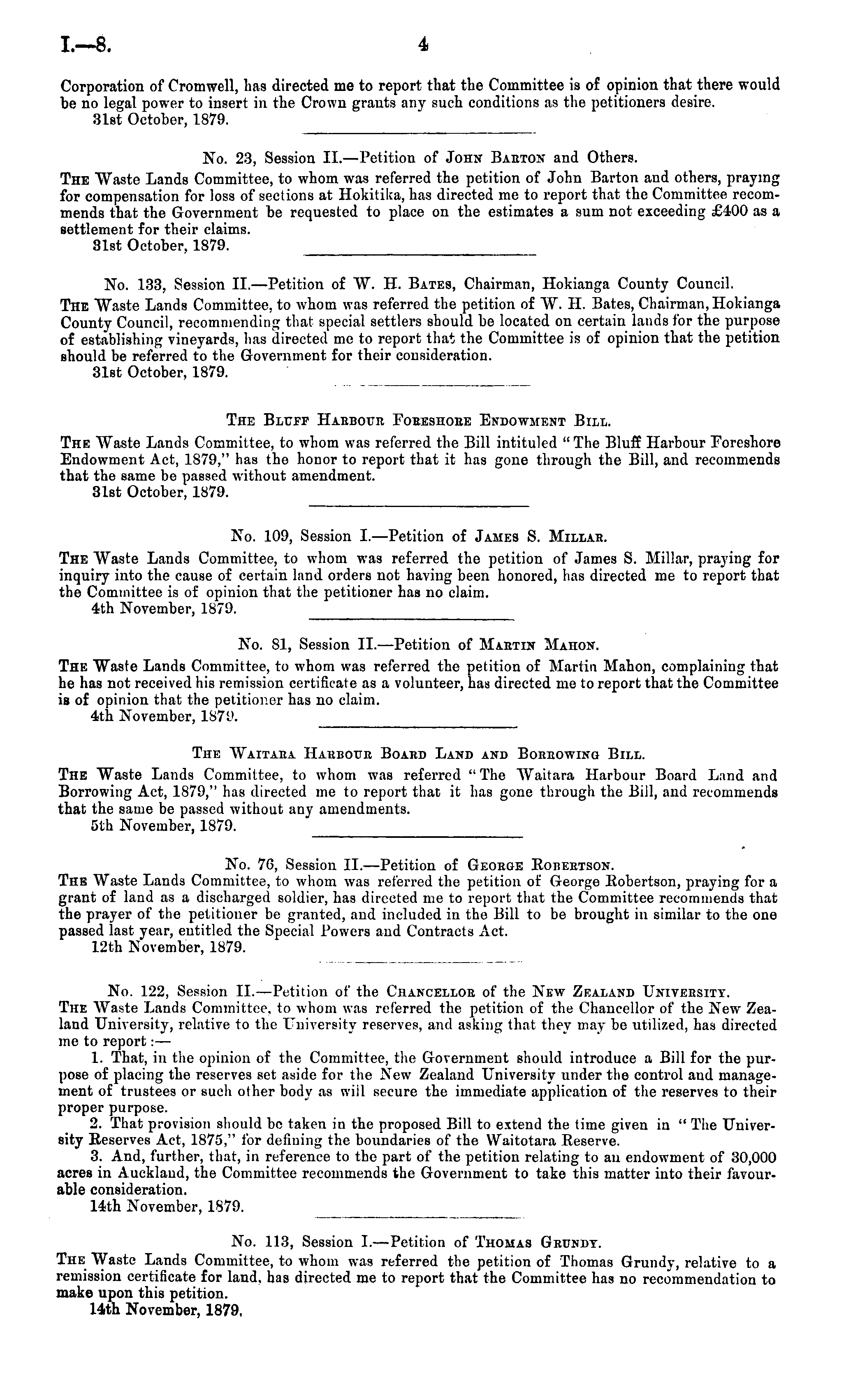 No. 23, Session II. —Petition of John Barton and Others. The Waste Lands Committee, to whom was referred the petition of John Barton and others, praying for compensation for loss of sections at Hokitika, has directed me to report that the Committee recommends that the Government be requested to place on the estimates a sum not exceeding £400 as a settlement for their claims. 31st October, 1879.