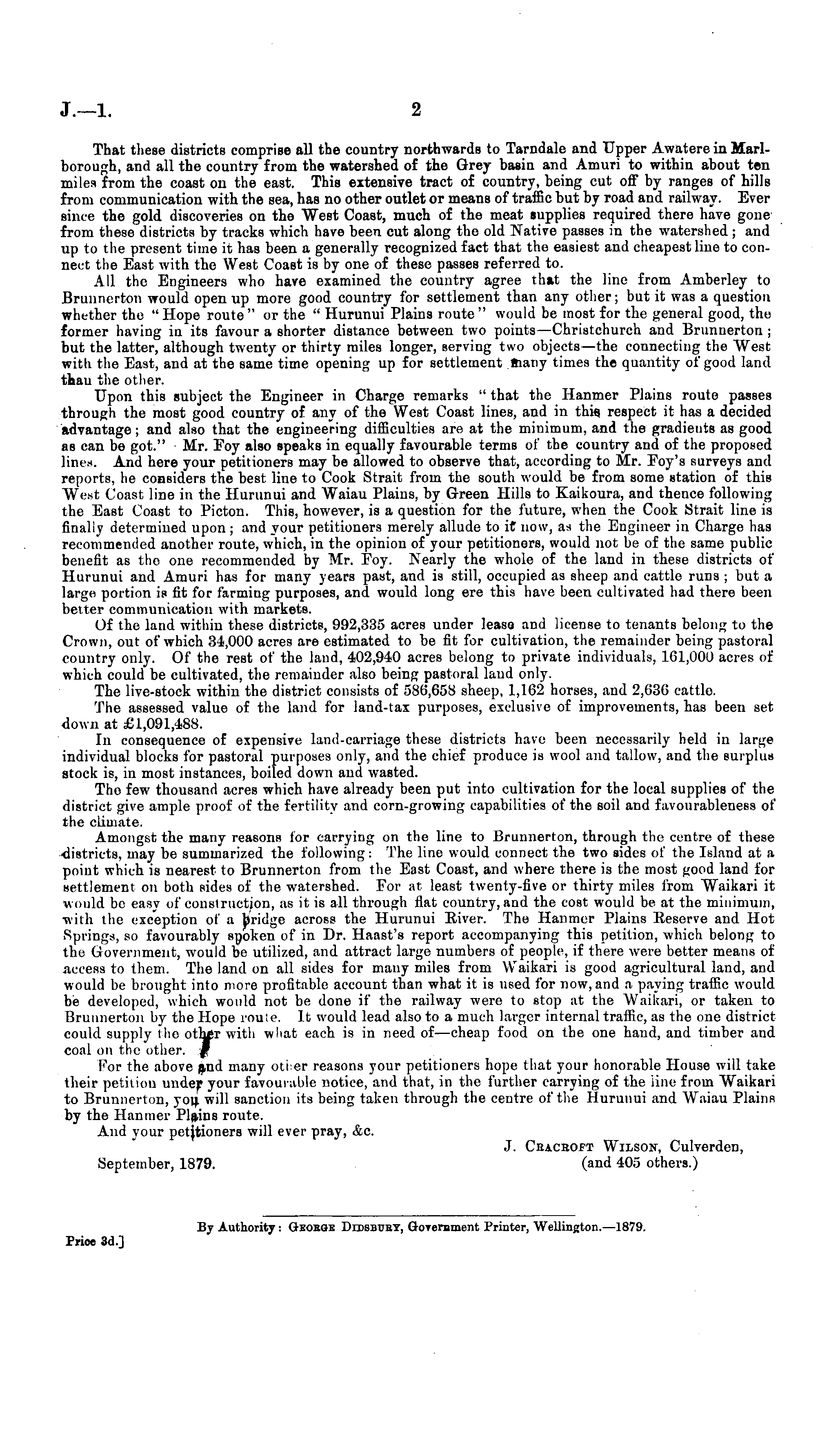 That these districts comprise all the country northwards to Tarndale and Upper Awatere in Marlborough, and all the country from the watershed of the Grey basin and Amuri to within about ten miles from the coast on the east. This extensive tract of country, being cut off by ranges of hills from communication with the sea, has no other outlet or means of traffic but by road and railway. Ever since the gold discoveries on the West Coast, much of the meat supplies required there have gone from these districts by tracks which have been cut along the old Native passes in the watershed ; and up to the present time it has been a generally recognized fact that the easiest and cheapest line to connect the East with the West Coast is by one of these passes referred to. All the Engineers who have examined the country agree that the line from Amberley to Brunnerton would open up more good country for settlement than any other; but it was a question whether the " Hope route " or the " Hurunui Plains route " would be most for the general good, the former having in its favour a shorter distance between two points —Christchurch and Brunnerton ; but the latter, although twenty or thirty miles longer, serving two objects —the connecting the West with the East, and at the same time opening up for settlement many times the quantity of good land thau the other. Upon this subject the Engineer in Charge remarks " that the Hanmer Plains route passes through the most good country of any of the West Coast lines, and in this respect it has a decided advantage ; and also that the engineering difficulties are at the minimum, and the gradients as good as can be got." Mr. Foy also speaks in equally favourable terms of the country and of the proposed lines. And here your petitioners may be allowed to observe that, according to Mr. Foy's surveys and reports, he considers the best line to Cook Strait from the south would be from some station of this West Coast line in the Hurunui and Waiau Plains, by Green Hills to Kaikoura, and thence following the East Coast to Pieton. This, however, is a question for the future, when the Cook Strait line is finally determined upon; and your petitioners merely allude to it now, as the Engineer in Charge has recommended another route, which, in the opinion of your petitioners, would not be of the same public benefit as tho one recommended by Mr. Foy. Nearly the whole of the land in these districts of Hurunui and Amuri has for many years past, and is still, occupied as sheep and cattle runs ; but a large portion is fit for farming purposes, and would long ere this have been cultivated had there been better communication with markets. Of the land within these districts, 992,335 acres under lease and license to tenants belong to the Crown, out of which 34,000 acres are estimated to be fit for cultivation, the remainder being pastoral country only. Of the rest of the land, 402,940 acres belong to private individuals, 161,000 acres of which could be cultivated, the remainder also being pastoral land only. The live-stock within the district consists of 586,658 sheep, 1,162 horses, and 2,636 cattle. The assessed value of the land for land-tax purposes, exclusive of improvements, has been set down at £1,091,455. In consequence of expensive land-carriage these districts have been necessarily held in large individual blocks for pastoral purposes only, and the chief produce is wool and tallow, and the surplus stock is, in most instances, boiled down and wasted. The few thousand acres which have already been put into cultivation for the local supplies of the district give ample proof of the fertility and corn-growing capabilities of the soil and favourableness of the climate. Amongst the many reasons for carrying on the line to Brunnerton, through the centre of these •districts, may be summarized the following: The line would connect the two sides of the Island at a point which is nearest to Brunnerton from the East Coast, and where there is the most good land for settlement on both sides of the watershed. For at least twenty-five or thirty miles from Waikari it would be easy of construction, as it is all through flat country, and the cost would be at the minimum, with the exception of a bridge across the Hurunui River. The Hanmer Plains Reserve and Hot Springs, so favourably spoken of in Dr. Haast's report accompanying this petition, which belong to the Government, would be utilized, and attract large numbers of people, if there were better means of access to them. The land on all sides for many miles from Waikari is good agricultural land, and would be brought into more profitable account than what it is used for now, and a paying traffic would be developed, which would not be done if the railway were to Btop at the Waikari, or taken to Brunnerton by the Hope roui c. It would lead also to a much larger internal traffic, as the one district could supply the other with what each is in need of —cheap food on the one hand, and timber and coal on the other. For the above and many otior reasons your petitioners hope that your honorable House will take their petition under your favourable notice, and that, in the further carrying of the line from Waikari to Brunnerton, you. will sanction its being taken through the centre of the Hurunui and Waiau Plains by the Hanmer Plains route. And your petitioners will ever pray, &c. J. Ceaceoet Wilson, Culverden, September, 1879. (and 405 others.)