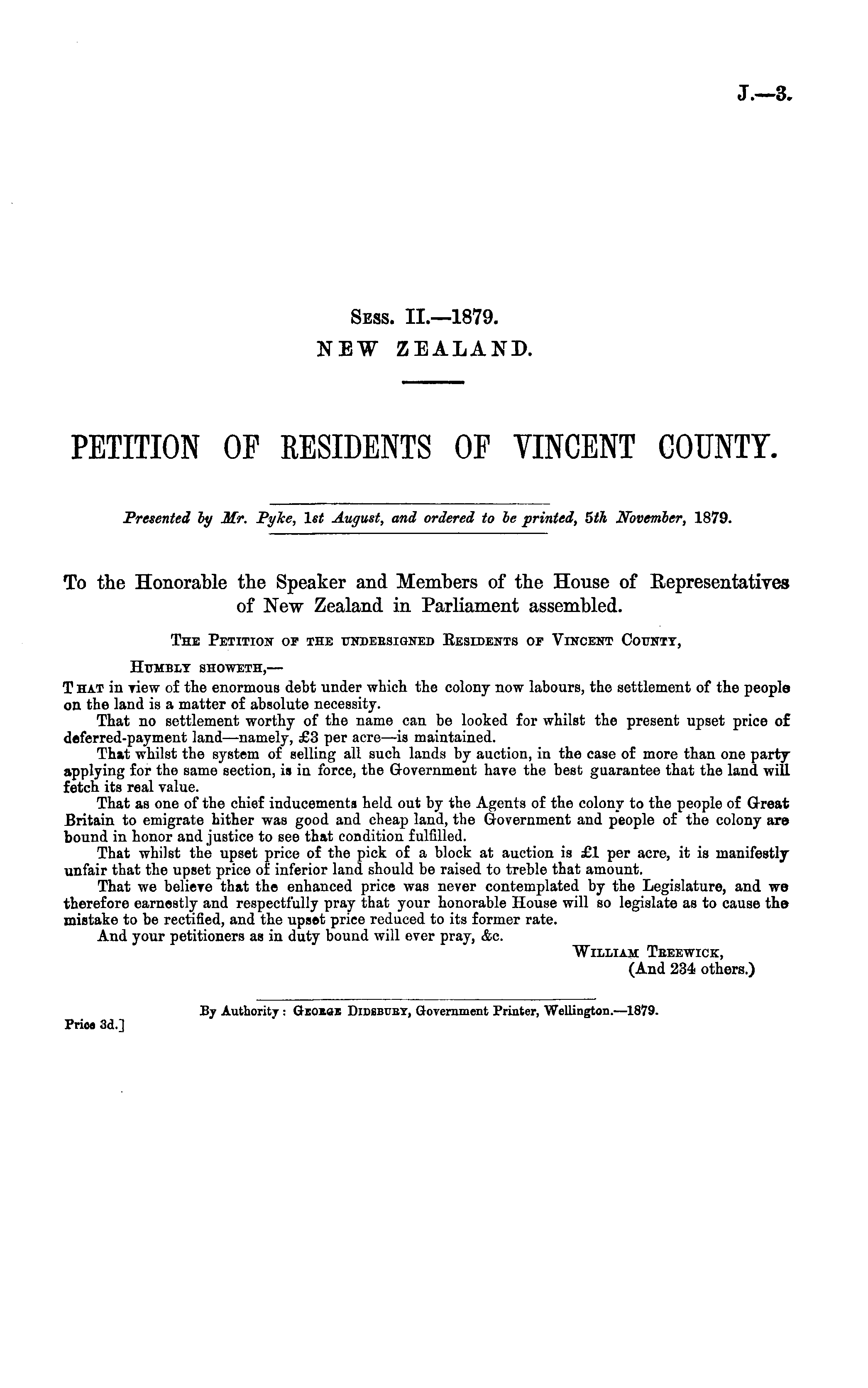 To the Honorable the Speaker and Members of the House of Representatives of New Zealand in Parliament assembled. The Petition of the undeesigned Kesidents of Vincent County, Humbly showeth, — T hat in view of the enormous debt under which the colony now labours, the settlement of the people on the land is a matter of absolute necessity. That no settlement worthy of the name can be looked for whilst the present upset price of deferred-payment land —namely, £3 per acre —is maintained. That whilst the system of selling all such lands by auction, in the case of more than one party applying for the same section, is in force, the Government have the best guarantee that the land will fetch its real value. That as one of the chief inducements held out by the Agents of the colony to the people of Great Britain to emigrate hither was good and cheap land, the Government and people of the colony are bound in honor and justice to see that condition fulfilled. That whilst the upset price of the pick of a block at auction is £1 per acre, it is manifestly unfair that the upset price of inferior land should be raised to treble that amount. That we believe that the enhanced price was never contemplated by the Legislature, and we therefore earnestly and respectfully pray that your honorable House will so legislate as to cause the mistake to be rectified, and the upset price reduced to its former rate. And your petitioners as in duty bound will ever pray, Ac. William Tbeewick, (And 234 others.)