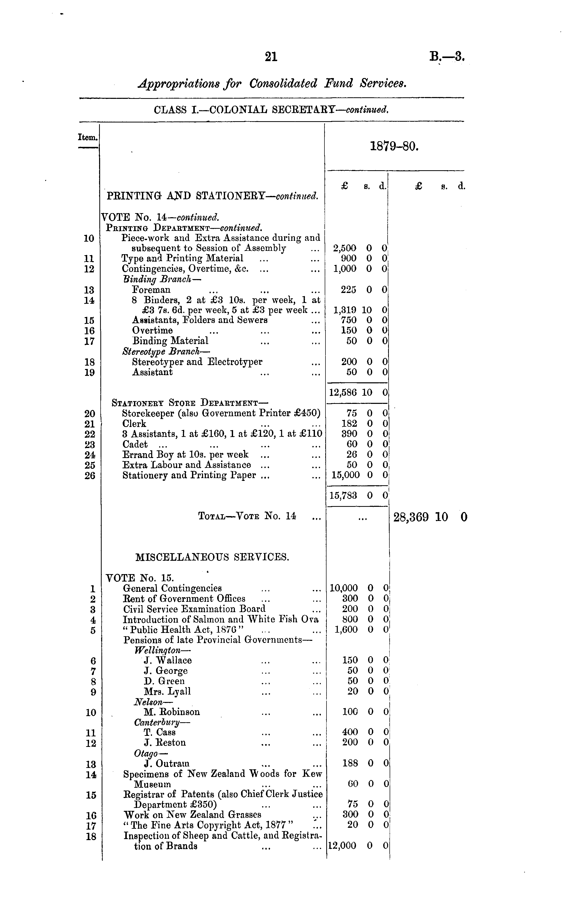 Appropriations for Consolidated hmd Services. CLASS I.—COLONIAL SECRETA: — continued. Item. 1879-80. PRINTING AND STATIONEET— continued £ s. d.! £ B. d. 10 11 12 18 11 VOTE No. 14— continued. Printing Department— continued. Piece-work and Extra Assistance during and subsequent to Session of Assembly Type and Printing Material Contingencies, Overtime, &c. ... Hinding Branch — Foreman 8 Binders, 2 at £3 10s. per week, 1 at £3 7s. 6d. per week, 5 at £3 per week ... Assistants, Folders and Sewers Overtime Binding Material Stereotype Branch — Stereotyper and Electrotyper Assistant 2,500 0 0 900 0 0 1,000 0 0 225 0 0 15 18 17 1,319 10 0 750 0 0 150 0 0 50 0 0 IS 1!) 200 0 0 50 0 0 20 21 22 28 21 25 20 Stationery Store Department— Storekeeper (also Government Printer £450) Clerk 3 Assistants, 1 at £160, 1 at £120, 1 at £110 Cadet ... Errand Boy at 10s. per week Extra Labour and Assistance ... Stationery and Printing Paper ... 12,586 10 75 0 182 0 390 0 60 0 26 0 50 0 15,000 0 0 0 0 0 0 0 0 0 15,783 0 0 Total—Vote No. 14 28,369 10 0 MISCELLANEOUS SERVICES. 8 7 8 9 10 1 2 8 4 6 VOTE No. 15. General Contingencies Kent of Government Offices Civil Service Examination Board Introduction of Salmon and White Fish Ova " Public Health Act, 1876" Pensions of late Provincial Governments — Wellington — J. Wallace J. George D. Green Mrs. Lyall Nelson — M. Robinson Canterbury — T. Cass J. Reston Otago — J. Outram Specimens of New Zealand "W oods for Kew Museum Registrar of Patents (also Chief Clerk Justice Department £350) Work on New Zealand Grasses " The Fine Arts Copyright Act, 1877 " Inspection of Sheep and Cattle, and Registration of Brands 10,000 300 200 800 1,600 150 50 50 20 100 0 0 0 0 0 0 0 0 0 0 0 0 0 0 0 0 0 0 0 0 11 12 400 200 0 0 o 0 18 14 188 0 0 60 0 0 15 75 300 20 0 0 0 0 o 0 16 17 IS 12,000 0 0