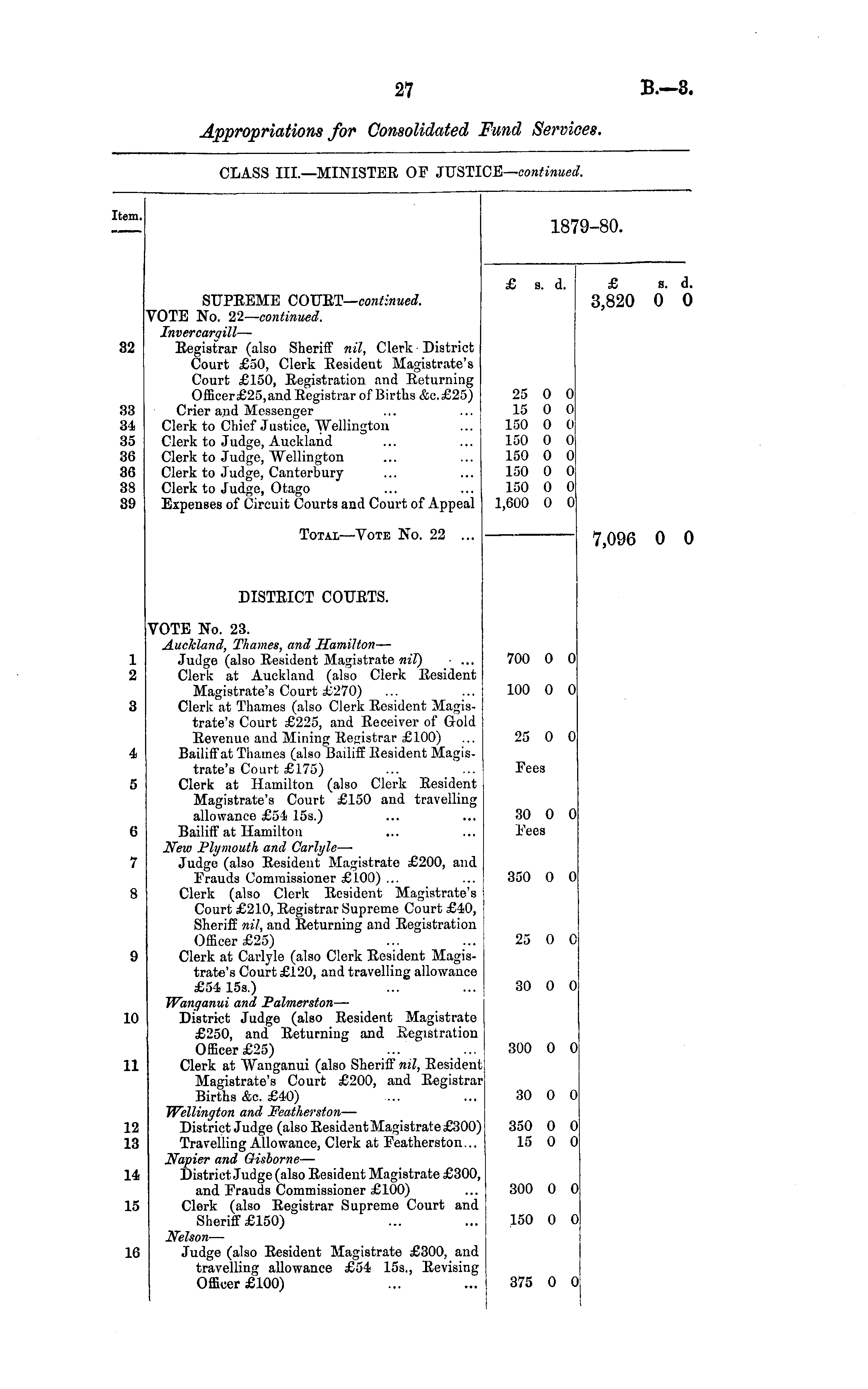 Appropriations for Consolidated Fund Services. CLASS III.—MINISTER OF JUSTICE— continued. Item. 18 9-80. £ 8. d. £ 3,820 s. 0 d. 0 82 8a 84 85 86 86 88 89 SUPEEME COTJET— continued. VOTE No. 22— continued, Invercargill — Registrar (also Sheriff nil, Clerk District Court £50, Clerk Eesideut Magistrate's Court £150, Registration and Returning Officer£25,and Registrar of Births &e.£25) Crier and Messenger Clerk to Chief Justice, Wellington Clerk to Judge, Auckland Clerk to Judge, "Wellington Clerk to Judge, Canterbury Clerk to Judge, Otago Expenses of Circuit Courts and Court of Appeal 25 15 150 150 150 150 150 1,600 0 0 0 0 0 0 0 0 0 0 0 0 0 0 0 0 7,096 0 0 Total—Vote No. 22 ... DISTRICT COURTS. 1 2 a 4 5 e 7 8 VOTE No. 23. Auckland, Thames, and Hamilton — Judge (also Resident Magistrate nil) ■ ... Clerk at Auckland (also Clerk Resident Magistrate's Court £270) Clerk at Thames (also Clerk Resident Magistrate's Court £225, and Receiver of Gold Revenue and Mining Registrar £100) Bailiff at Thames (also Bailiff Resident Magistrate's Court £175) Clerk at Hamilton (also Clerk Resident Magistrate's Court £150 and travelling allowance £5-1 15s.) Bailiff at Hamilton New Plymouth and Carlyle — Judge (also Resident Magistrate £200, and Frauds Commissioner £100) ... Clerk (also Clerk Resident Magistrate's Court £210, Registrar Supreme Court £40, Sheriff nil, and Returning and Registration Officer £25) Clerk at Carlyle (also Clerk Resident Magistrate's Court £120, and travelling allowance £5-4 15s.) Wanqanui and Palmerston — District Judge (also Resident Magistrate £250, and Returning and Registration Officer £25) Clerk at "Wanganui (also Sheriff nil, Resident Magistrate's Court £200, and Registrar Births &c. £40) Wellington and Featherston — District Judge (also Resident Magistrate £300) Travelling Allowance, Clerk at Featherston... Napier and Gisborne — District Judge (also Resident Magistrate £300, and Frauds Commissioner £100) Clerk (also Registrar Supreme Court and Sheriff £150) 700 0 100 0 25 0 Fees 30 0 Fees 350 0 25 0 0 0 0 0 0 c 30 0 0 10 300 0 0 11 30 0 0 is 13 350 0 15 0 0 0 14 300 0 0 15 150 0 0 10 Nelson — Judge (also Resident Magistrate £300, and travelling allowance £54 15s., Revising Officer £100) 375 0 0