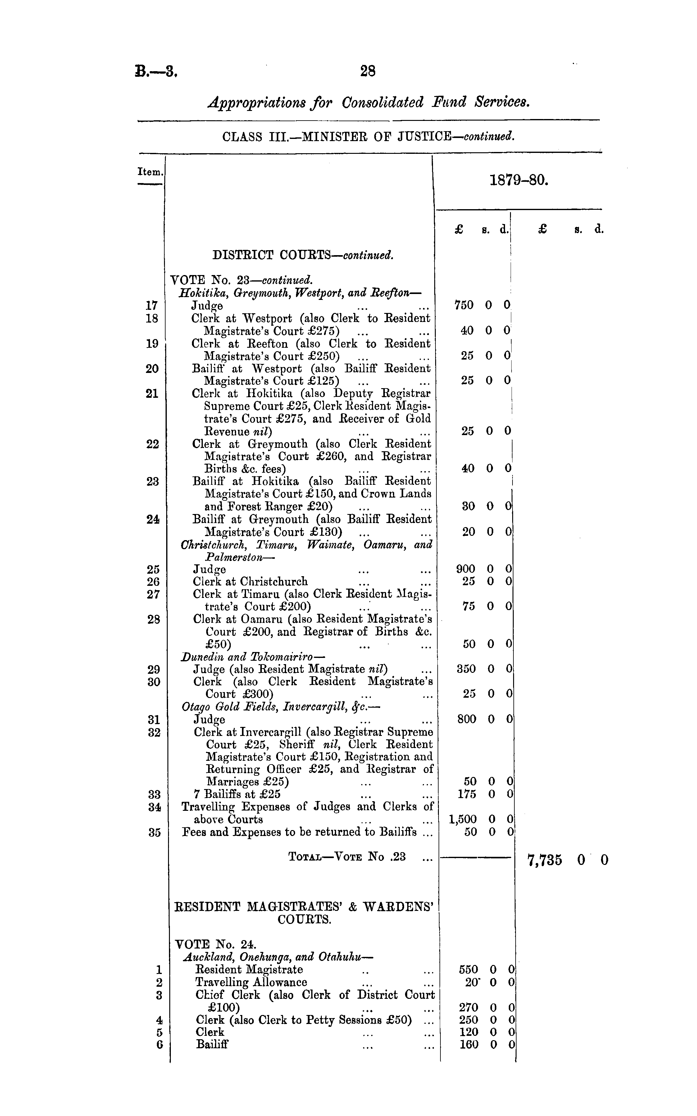 Appropriations for Consolidated hind Services. CLASS III.—MINISTER OF JUST: 'CE— continued. Item. 1879-80. £ s. d. £ s. d. DISTRICT COURTS— continued. VOTE No. 23— continued. Hokitika, Greymouth, Westport, and Reefton — Judge Clerk at Westport (also Clerk to Resident Magistrate's Court £275) Clerk at Reefton (also Clerk to Resident Magistrate's Court £250) Bailift" at Westport (also Bailiff Resident Magistrate's Court £125) Clerk at Hokitika (also Deputy Registrar Supreme Court £25, Clerk Resident Magistrate's Court £275, and Receiver of Gold Revenue nil) Clerk at Greymouth (also Clerk Resident Magistrate's Court £2C0, and Registrar Births &c. fees) Bailiff" at Hokitika (also Bailiff Resident Magistrate's Court £150, and Crown Lands and Forest Ranger £20) Bailiff at Greymouth (also Bailiff Resident Magistrate's Court £130) ... Chris/church, Timaru, Waimate, Oamaru, and Palmers/on — Judge Clerk at Christchurch Clerk at Timaru (also Clerk Resident Magistrate's Court £200) Clerk at Oamaru (also Resident Magistrate's Court £200, and Registrar of Births &c. £50) ... ■ Dunedin and Tolcomairiro — Judge (also Resident Magistrate nil) Clerk (also Clerk Resident Magistrate's Court £300) Otago Gold Fields, Invercargill, Sfc. — Judge Clerk at Invercargill (also Registrar Supreme Court £25, Sheriff nil, Clerk Resident Magistrate's Court £150, Registration and Returning Officer £25, and Registrar o1 Marriages £25) 7 Bailiffs at £25 Travelling Expenses of Judges and Clerks oJ above Courts Fees and Expenses to be returned to Bailiffs ... 750 0 0 17 is 40 0 0 i 18 25 0 0 20 25 0 0 21 25 0 0 22 40 0 0 88 24 30 0 0 20 0 0 25 26 27 900 25 0 0 0 0 28 75 0 0 50 0 0 29 30 350 0 0 25 0 0 81 32 800 0 0 50 175 0 0 0 0 88 84 86 1,500 oO 0 0 0 0 Total —Vote No .23 7,735 0 0 RESIDENT MAGISTRATES' & WARDENS COURTS. 1 2 8 VOTE No. 2i. Auckland, Onehunga, and OtaJiuhu — Resident Magistrate Travelling Allowance Chief Clerk (also Clerk of District Court £100) Clerk (also Clerk to Petty Sessions £50) ... Clerk Bailiff 550 0 0 20" 0 0 4 6 G 270 0 0 250 0 0 120 0 0 160 0 0
