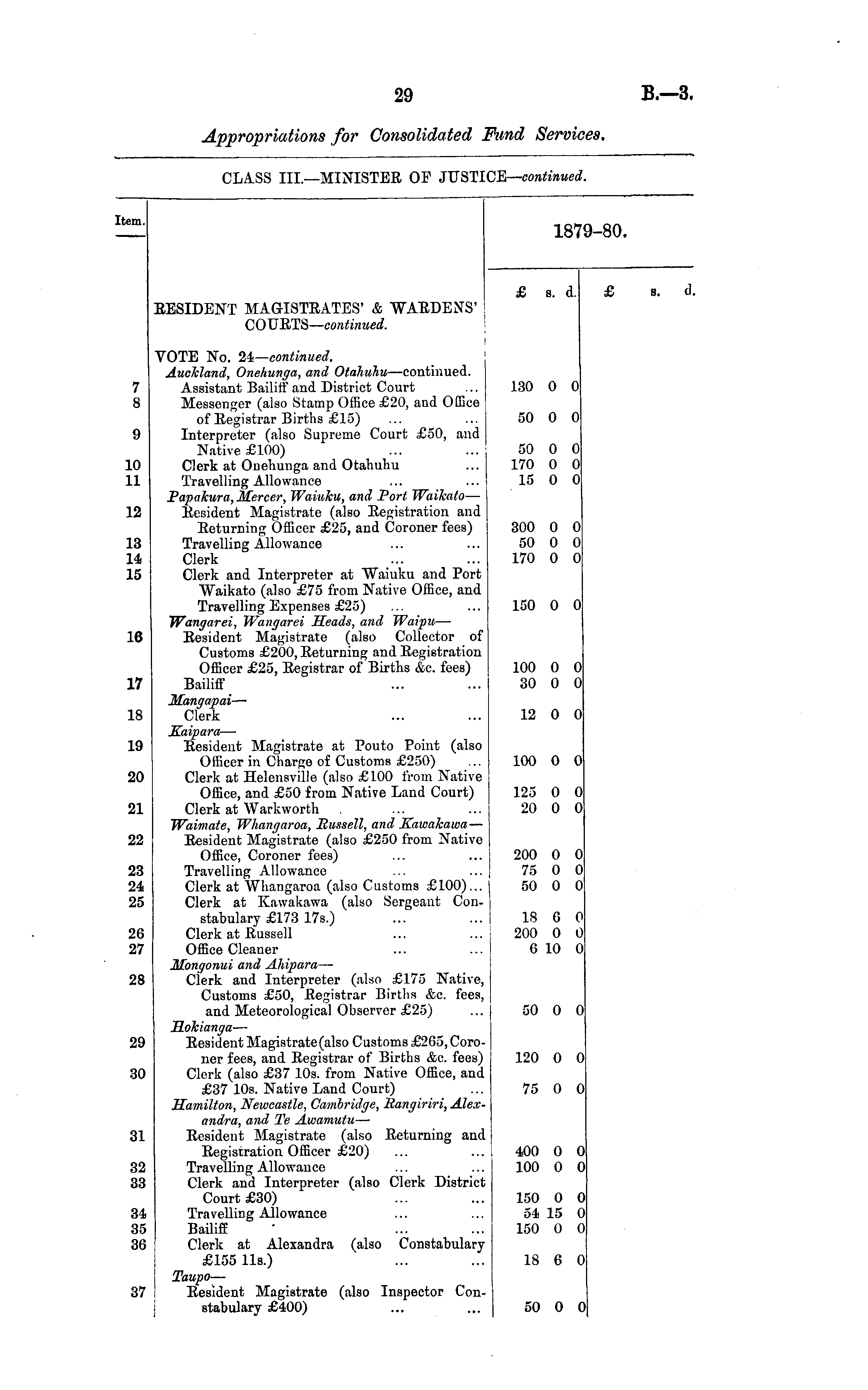 Appropriations for Consolidated und Services, CLASS III.—MINISTER OF JUST — continued. Item. 18' 9-80. RESIDENT MAGISTRATES' & WARDENS' COURTS— continued. £ s. d. £ s. d, I VOTE No. 24— continued. Auckland, Onehunga, and Otahuhu —continued. Assistant Bailiff and District Court Messenger (also Stamp Office £20, and Office of Registrar Births £15) Interpreter (also Supreme Court £50, and Native £100) Clerk at Onehunga and Otahuhu Travelling Allowance Papakura, Mercer, Waiuku, and Port Waikato — Resident Magistrate (also Registration and Returning Officer £25, and Coroner fees) Travelling Allowance Clerk Clerk and Interpreter at Waiuku and Port "Waikato (also £75 from Native Office, and Travelling Expenses £25) Wangarei, Wangarei Heads, and Waipu — Resident Magistrate (also Collector of Customs £200, Returning and Registration Officer £25, Registrar of Births &c. fees) Bailiff Manqapai — Clerk Kaipara — Resident Magistrate at Pouto Point (also Officer in Charge of Customs £250) Clerk at Helensville (also £100 from Native Office, and £50 from Native Land Court) Clerk at Warkworth Waimate, Whangaroa, Russell, and Kawakawa — Resident Magistrate (also £250 from Native Office, Coroner fees) Travelling Allowance Clerk at Whangaroa (also Customs £100)... Clerk at Kawakawa (also Sergeant Constabulary £173 17s.) Clerk at Russell Office Cleaner Mongonui and Ahipara —■ Clerk and Interpreter (also £175 Native, Customs £50, Registrar Births &c. fees, and Meteorological Observer £25) Hokianga — Resident Magistrate (also Customs £265, Coroner fees, and Registrar of Births &c. fees) Clerk (also £37 10s. from Native Office, and £37 10s. Native Land Court) Hamilton, Newcastle, Cambridge, Rangiriri, Alexandra, and Te Awamutu — Resident Magistrate (also Returning and Registration Officer £20) Travelling Allowance Clerk and Interpreter (also Clerk District Court £30) Travelling Allowance Bailiff Clerk at Alexandra (also Constabulary £155 11s.) 130 0 0 7 8 50 0 0 9 50 0 0 170 0 0 15 0 0 10 11 12 300 0 0 50 0 0 170 0 0 18 1L 15 150 0 0 16 100 0 0 30 0 0 17 18 12 0 0 19 100 0 0 20 125 0 0 20 0 0 21 22 200 0 0 75 0 0 50 0 0 23 24 25 26 27 IS 6 0 200 0 0 G 10 0 28 50 0 0 21) 120 0 0 ■M 75 0 0 ■M 400 0 0 100 0 0 82 88 34 86 36 150 0 0 54 15 0 150 0 0 18 6 0 w Taupo — Resident Magistrate (also Inspector Constabulary £400) 50 0 0