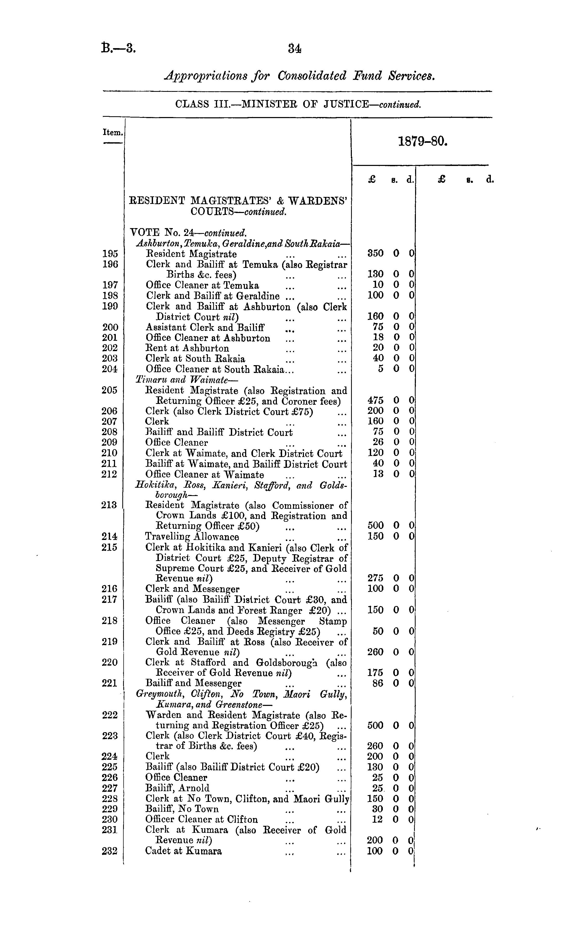 Appropriations for Consolidated Fund Services. CLASS III.—MINISTER OP JUST: CE— continued. Item. 18 9-80. £ 8. d. £ 8. d, RESIDENT MAGISTRATES' & WARDENS' COURTS—continued. 213 195 196 197 198 199 200 201 202 203 204 205 206 207 208 209 210 211 212 214 215 VOTE No. 24— continued. Ashhurton, TemuJca, Geraldine,andSouth RaTcaia — Resident Magistrate Clerk and Bailiff at Tcmuka (also Registrar Births &c. fees) Office Cleaner at Temuka Clerk and Bailiff at Geraldine ... Clerk and Bailiff at Ashburton (also Clerk District Court nil) Assistant Clerk and Bailiff Office Cleaner at Ashburton Rent at Ashburton Clerk at South Rakaia Office Cleaner at South Rakaia... Timaru and Waimate — Resident Magistrate (also Registration and Returning Officer £25, and Coroner fees) Clerk (also Clerk District Court £75) Clerk Bailiff and Bailiff District Court Office Cleaner Clerk at "Waimate, and Clerk District Court Bailiff at Waimate, and Bailiff District Court Office Cleaner at Waimate Holcitika, Boss, Kanieri, Stafford, and Goldsborough — Resident Magistrate (also Commissioner of Crown Lands £100, and Registration and Returning Officer £50) Travelling Allowance Clerk at Hokitika and Kanieri (also Clerk of District Court £25, Deputy Registrar of Supreme Court £25, and Receiver of Gold Revenue nil) Clerk and Messenger Bailiff (also Bailiff District Court £30, and Crown Lands and Eorest Ranger £20) ... Office Cleaner (also Messenger Stamp Office £25, and Deeds Registry £25) Clerk and Bailiff at Ross (also Receiver of Gold Revenue nil) Clerk at Stafford and Goldsborouga (also Receiver of Gold Revenue nil) Bailiff and Messenger Grri/moutJi, Clifton, No Town, Maori Gully, Kumara, and Greenstone — Warden and Resident Magistrate (also Returning and Registration Officer £25) Clerk (also Clerk District Court £40, Registrar of Births &c. fees) Clerk Bailiff (also Bailiff District Court £20) Office Cleaner Bailiff, Arnold Clerk at No Town, Clifton, and Maori Gully Bailiff, No Town Officer Cleaner at Clifton Clerk at Kumara (also Receiver of Gold Revenue nil) Cadet at Kumara 350 0 0 130 0 0 10 0 0 100 0 0 160 0 0 75 0 0 18 0 0 20 0 0 40 0 0 5 0 0 475 0 0 200 0 0 160 0 0 75 0 0 26 0 0 120 0 0 40 0 0 13 0 0 500 0 0 150 0 0 275 0 0 100 0 0 216 217 150 0 0 218 50 0 0 219 260 0 0 220 175 0 0 86 0 0 221 222 500 0 0 223 260 0 0 200 0 0 130 0 0 25 0 0 25 0 0 150 0 0 30 0 0 12 0 0 224 225 226 227 228 229 230 231 232 200 0 0J 100 0 0