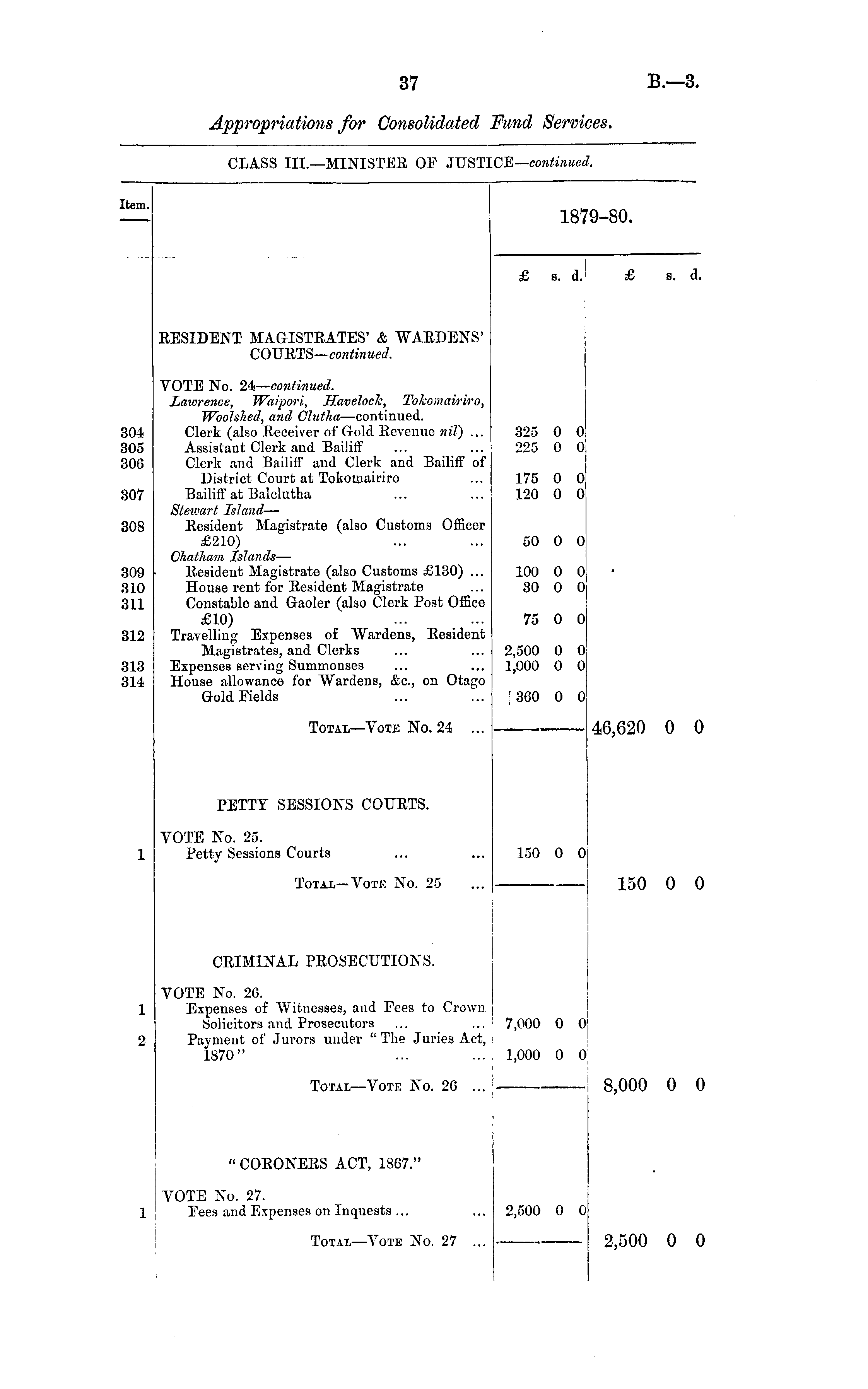 Appropriations for Consolidated \md Services. CLASS III.—MINISTER OF JUST: !CE — continued. Item. 18' '9-80. £ s. d. £ s. d. RESIDENT MAGISTRATES' & WARDENS' COURTS— continued. 30-1 305 306 307 308 VOTE No. 24— continued. Lawrence, Waipori, Haveloch, Tokomairiro, Woohhed, and Glutlia —continued. Clerk (also Receiver of Gold Revenue nil) ... Assistant Clerk and Bail iit' Clerk and Bailiff and Clerk and Bailiff of District Court at Tokoaiairiro Bailiff at Balelutha Stewart Island — Resident Magistrate (also Customs Officer £210) Chatham Islands — Resident Magistrate (also Customs £130) ... House rent for Resident Magistrate Constable and Gaoler (also Clerk Post Office £10) Travelling Expenses of "Wardens, Resident Magistrates, and Clerks Expenses serving Summonses House allowance for "Wardens, &c. on Otago Gold Fields 325 225 175 120 50 0 0 0 0 0 0 0 0 0 0 309 310 311 100 30 0 0 °o 75 0 0 312 2,500 1,000 0 0 0 o 313 314 |360 0 0 Total—Vote No. 24 ... 46,620 0 0 PETTY SESSIONS COURTS. VOTE No. 25. Petty Sessions Courts 150 0 0 Total—Vote No. 25 150 0 0 CRIMINAL PROSECUTIONS. 1 VOTE No. 26. Expenses of Witnesses, and Fees to Crown. Solicitors and Prosecutors Payment of Jurors under "The Juries Act, 1870" 7,000 0 0 a 1,000 0 0 Total —Vote No. 26 ... 8,000 0 0 " CORONERS ACT, 1867." VOTE No. 27. Fees and Expenses on Inquests ... 2,500 0 0 2,500 0 0 Total—Vote No. 27 ...