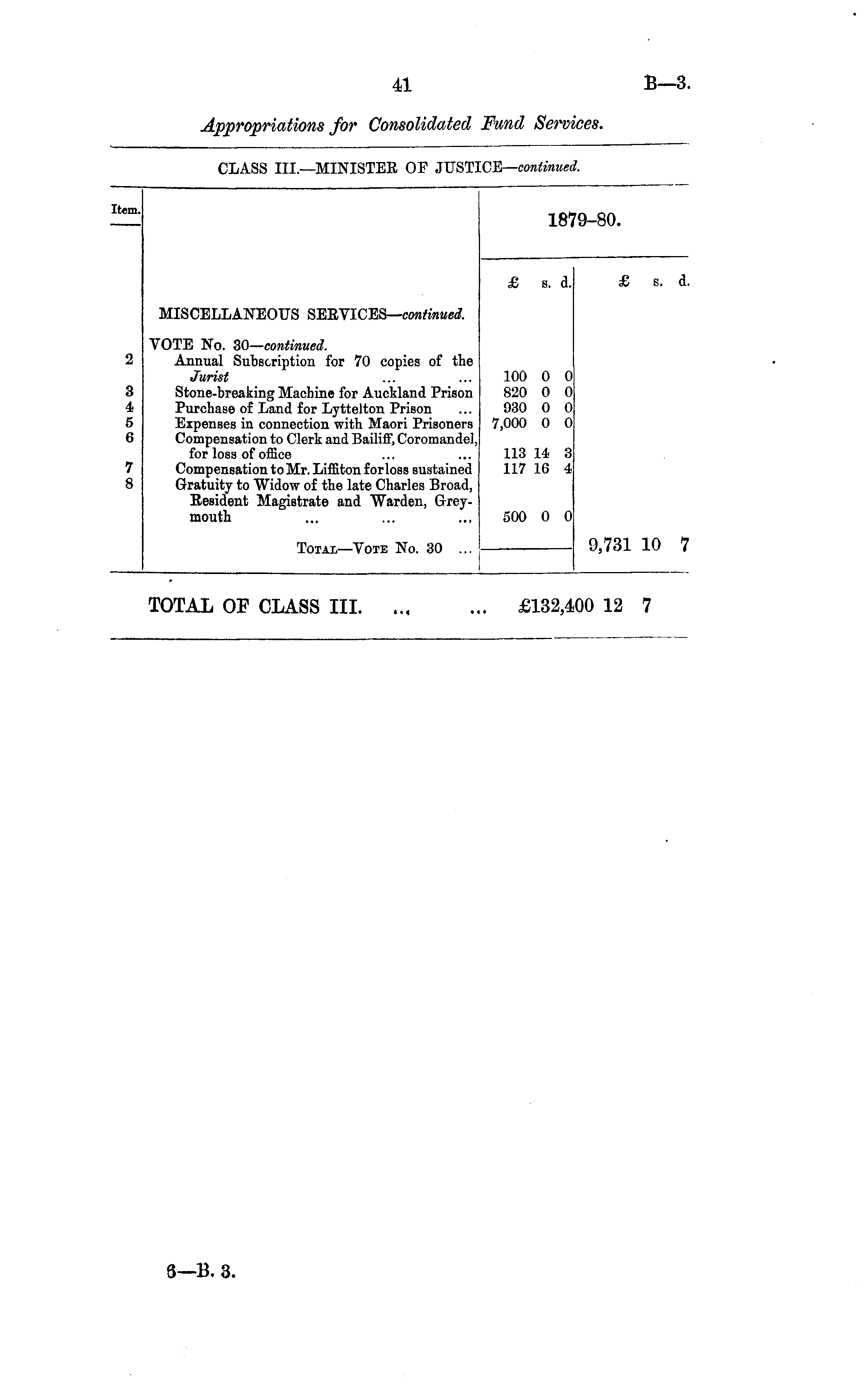 Appropriations for Consolidated Fund Services. CLASS III.—MINISTEE OF JUST: !CE — continued. Item. 1879-80. £ s. d. £ s. d. MISCELLANEOUS SEEVICES— continued. a a i 5 e YOTE No. SO—continued. Annual Subscription for 70 copies of the Jurist Stone-breaking Machine for Auckland Prison Purchase of Land for Lyttelton Prison Expenses in connection with Maori Prisoners Compensation to Clerk and Bailiff, Coromandel, for loss of office Compensation to Mr. Liffiton for loss sustained Gratuity to Widow of the late Charles Broad, Eesident Magistrate and Warden, Greymouth 100 0 0 820 0 0 930 0 0 7,000 0 0 7 8 113 14 3 117 16 4 500 0 0 9,731 10 7 Total—Vote No. 30 ... TOTAL OF CLASS III. *•« • • • £132, .00 12 7 3—B. 3.